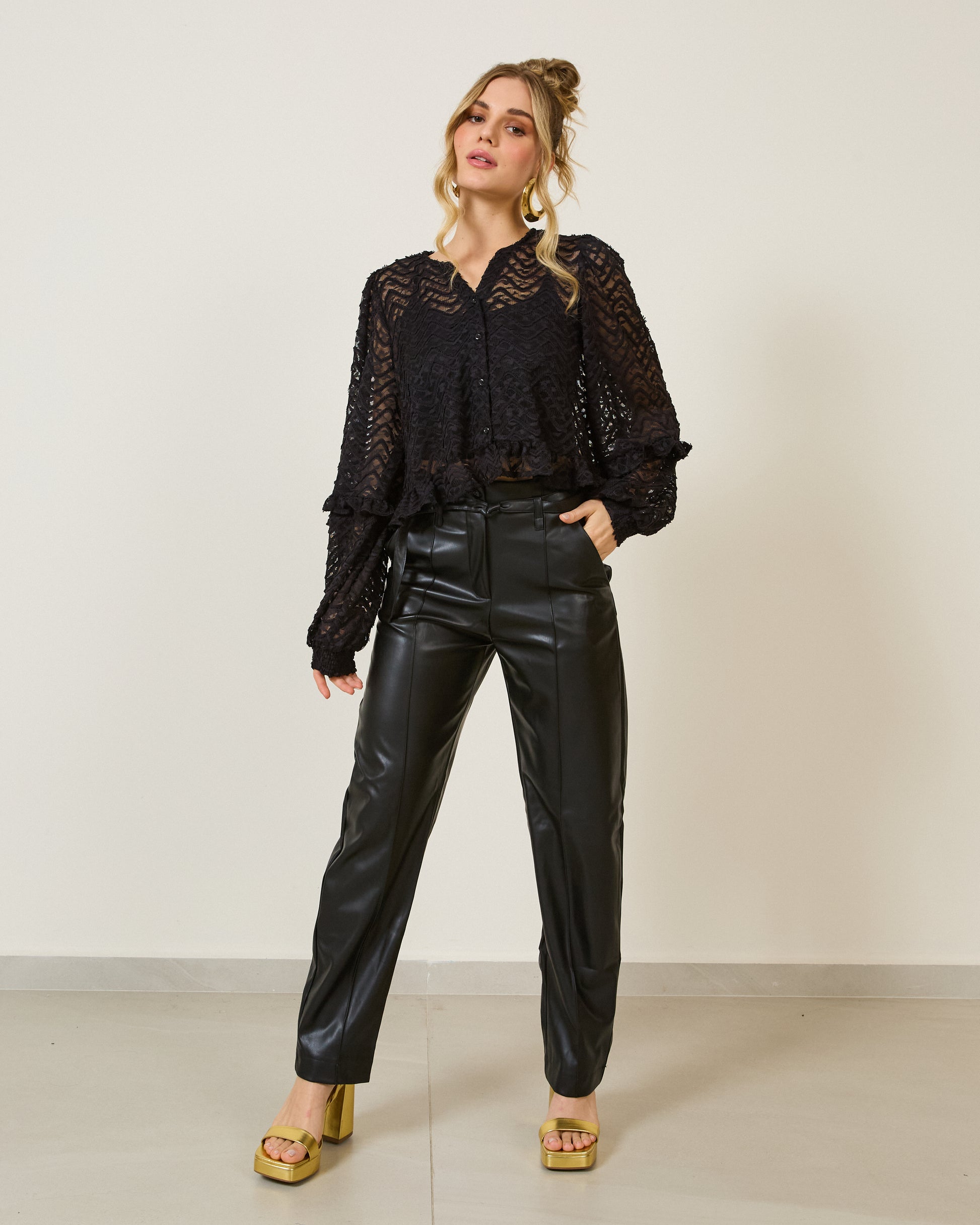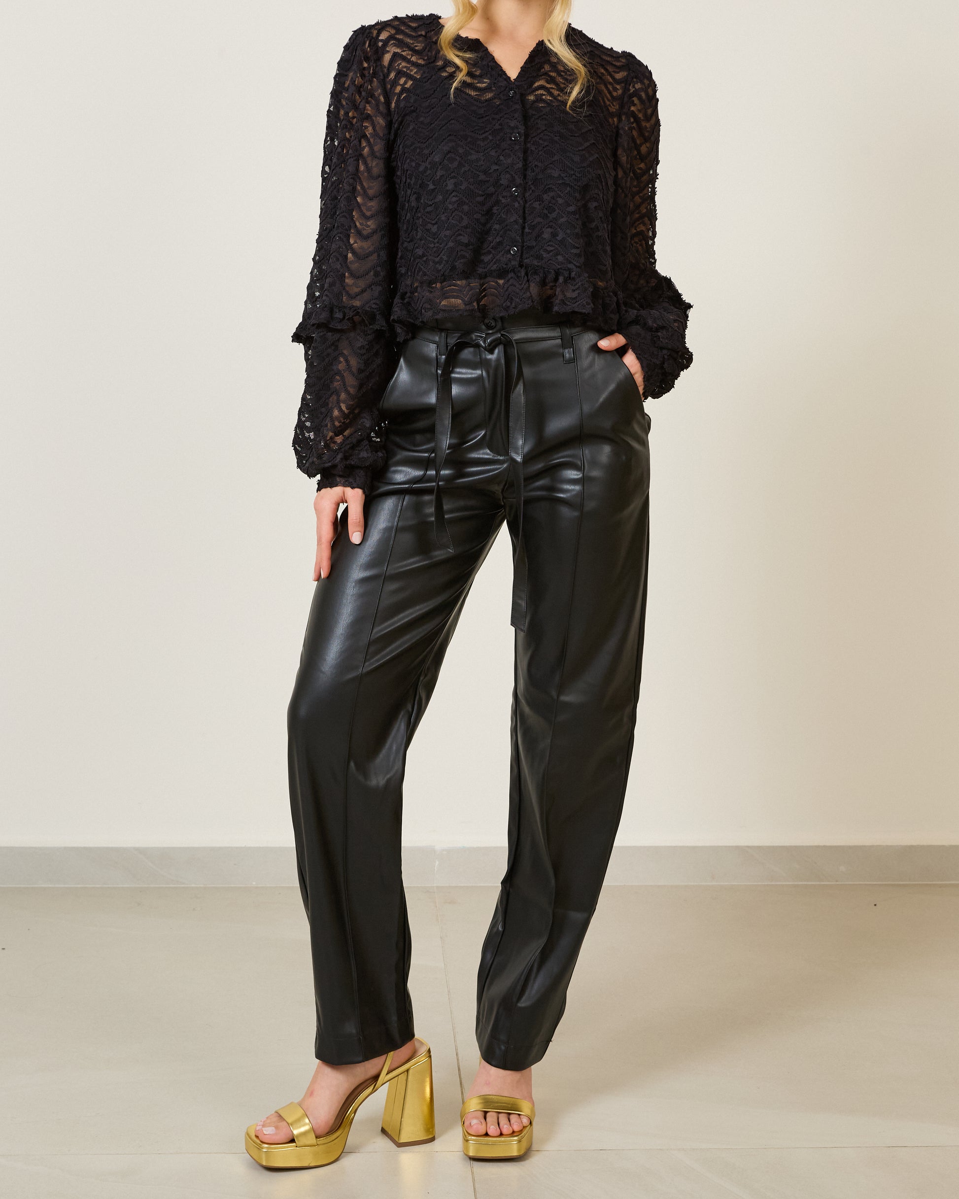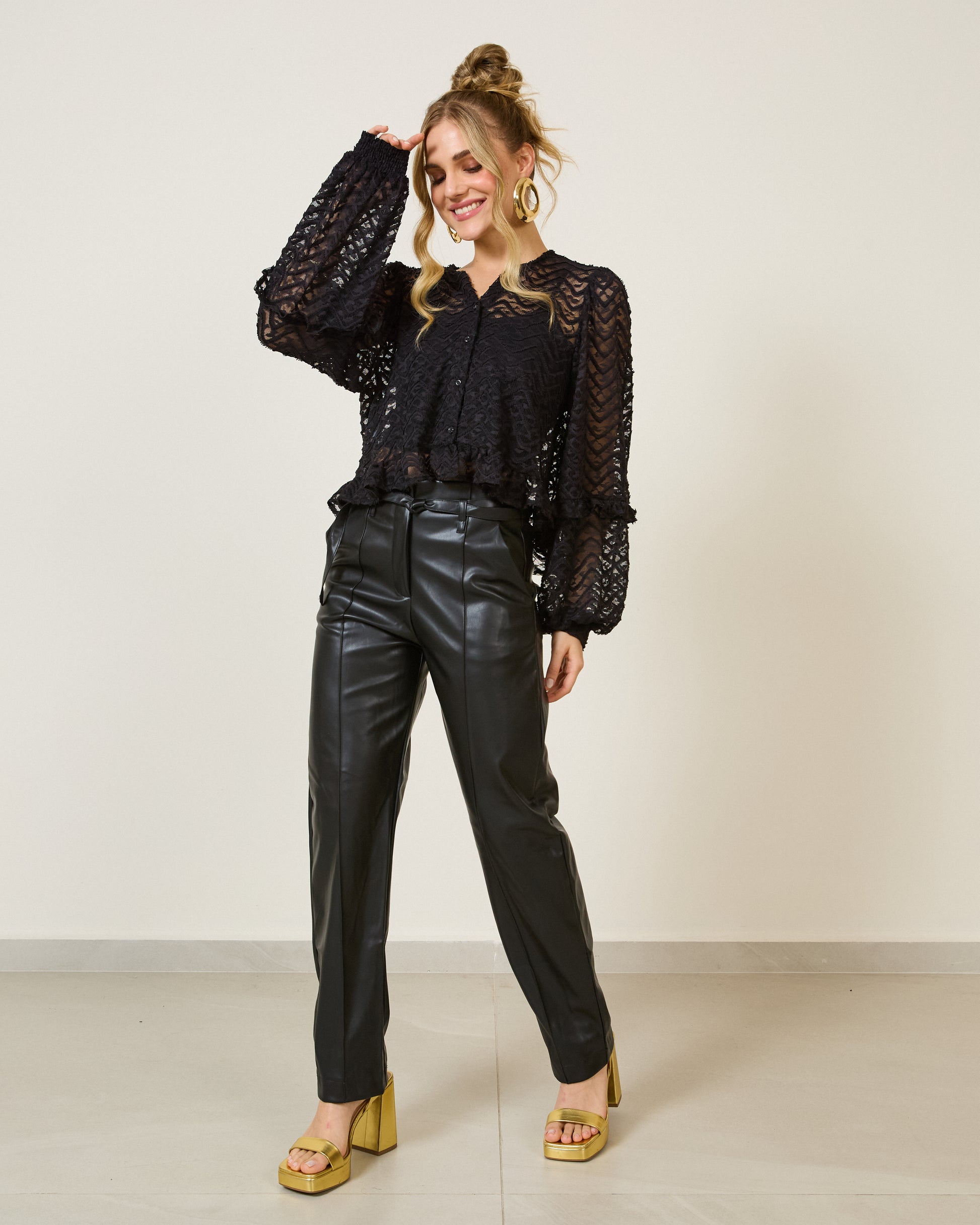 Calça em courino com modelagem reta, cós com faixa removível e bolsos discretos. Ideal para produções urbanas sofisticadas.