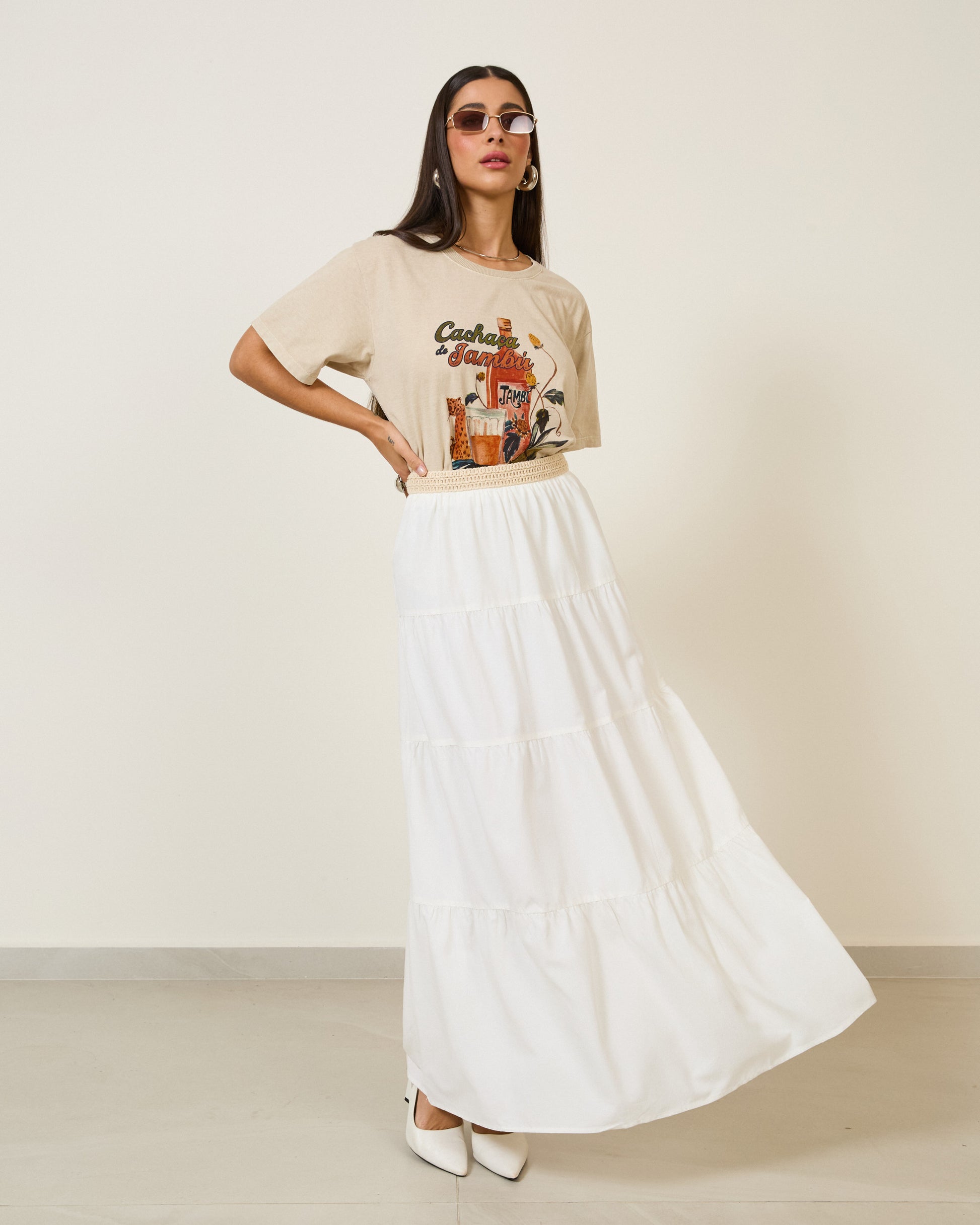 Saia longa com estrutura em três camadas, confeccionada em tecido misto de viscose e algodão. A peça tem modelagem ampla com leve franzido em cada recorte e cós com detalhe, proporcionando conforto. Perfeita para passeios, produções descomplicadas e ambientes criativos.
