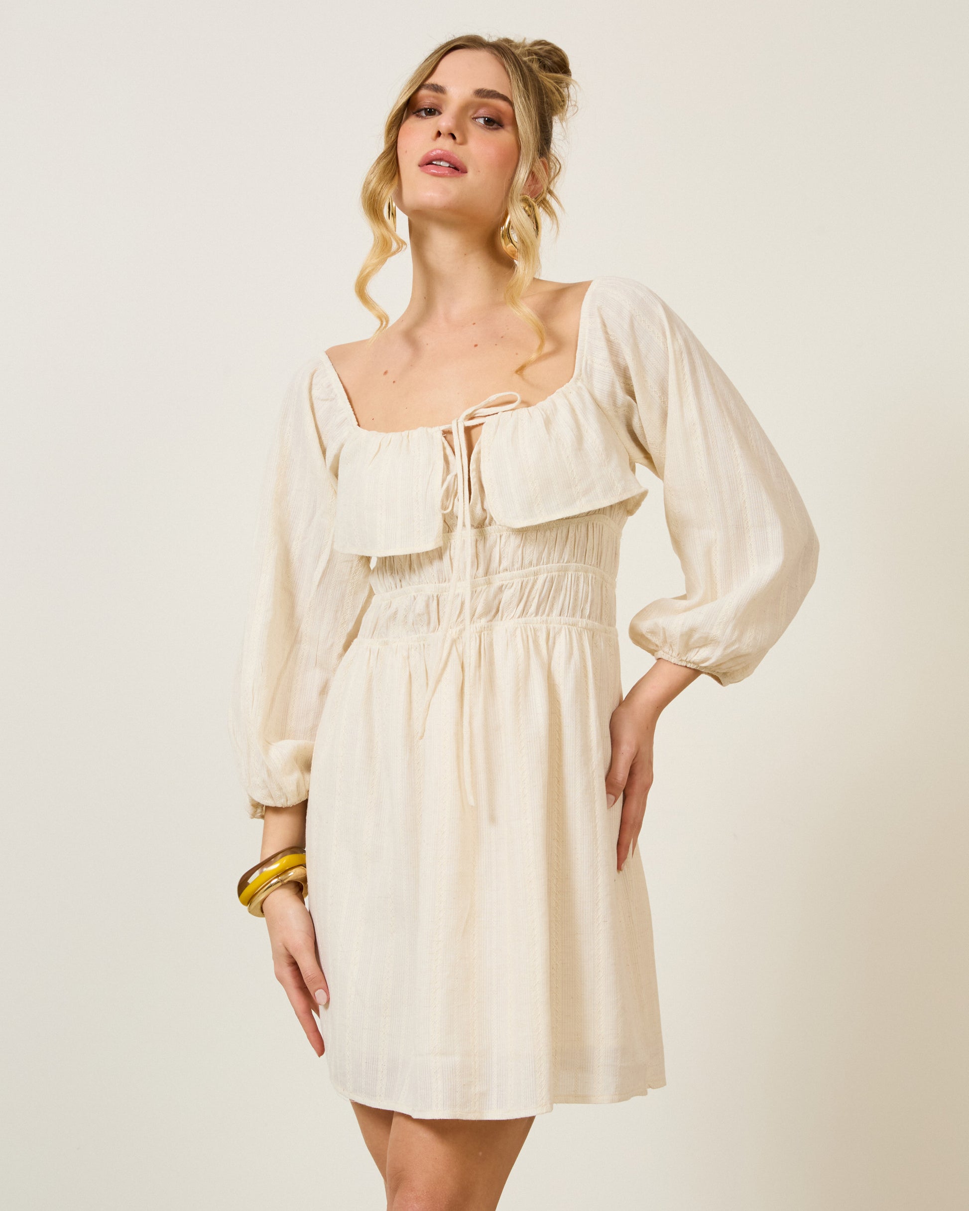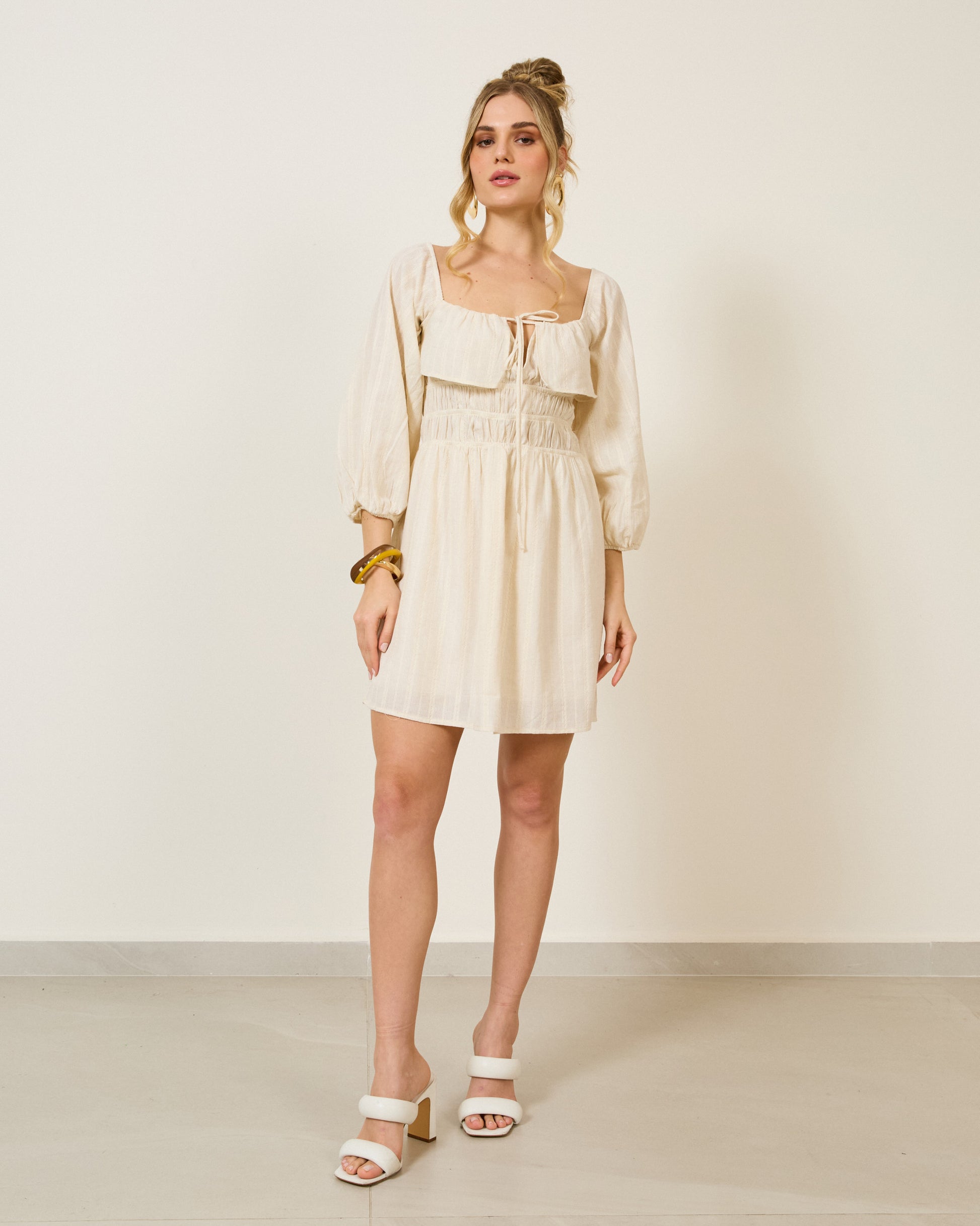 Vestido curto em algodão, viscose e linho, com forro interno. Possui decote quadrado com amarração central e pala em babado sobre o busto, podendo ser usado como decote ombro a ombro. Mangas bufantes 3/4 com caimento natural. Corpo com faixas de lastex para ajuste. Saia evasê em tecido texturizado. Indicado para almoços, aniversários e encontros.