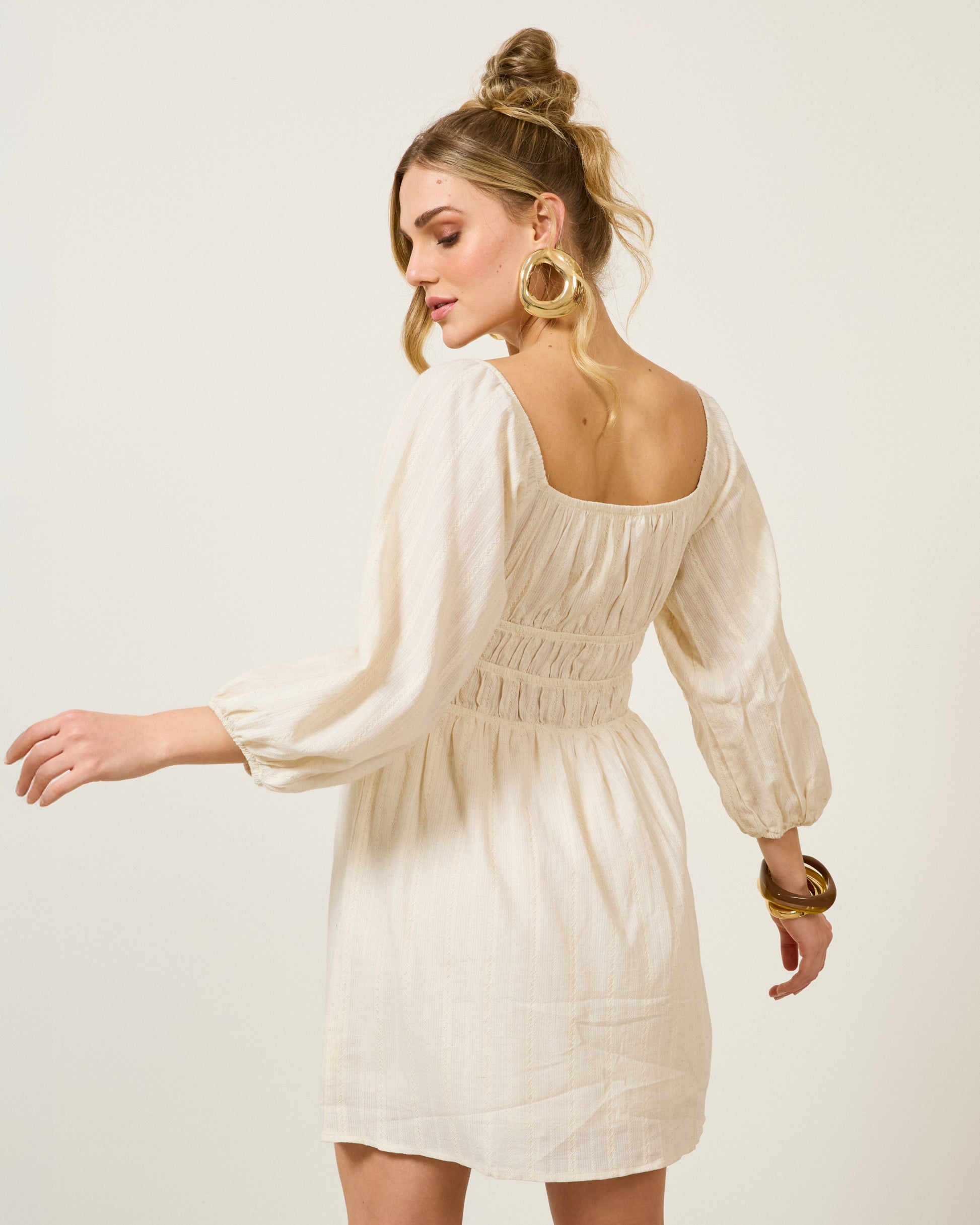 Vestido curto em algodão, viscose e linho com forro, decote quadrado ou ciganinha, mangas bufantes, corpo em lastex e saia evasê texturizada.