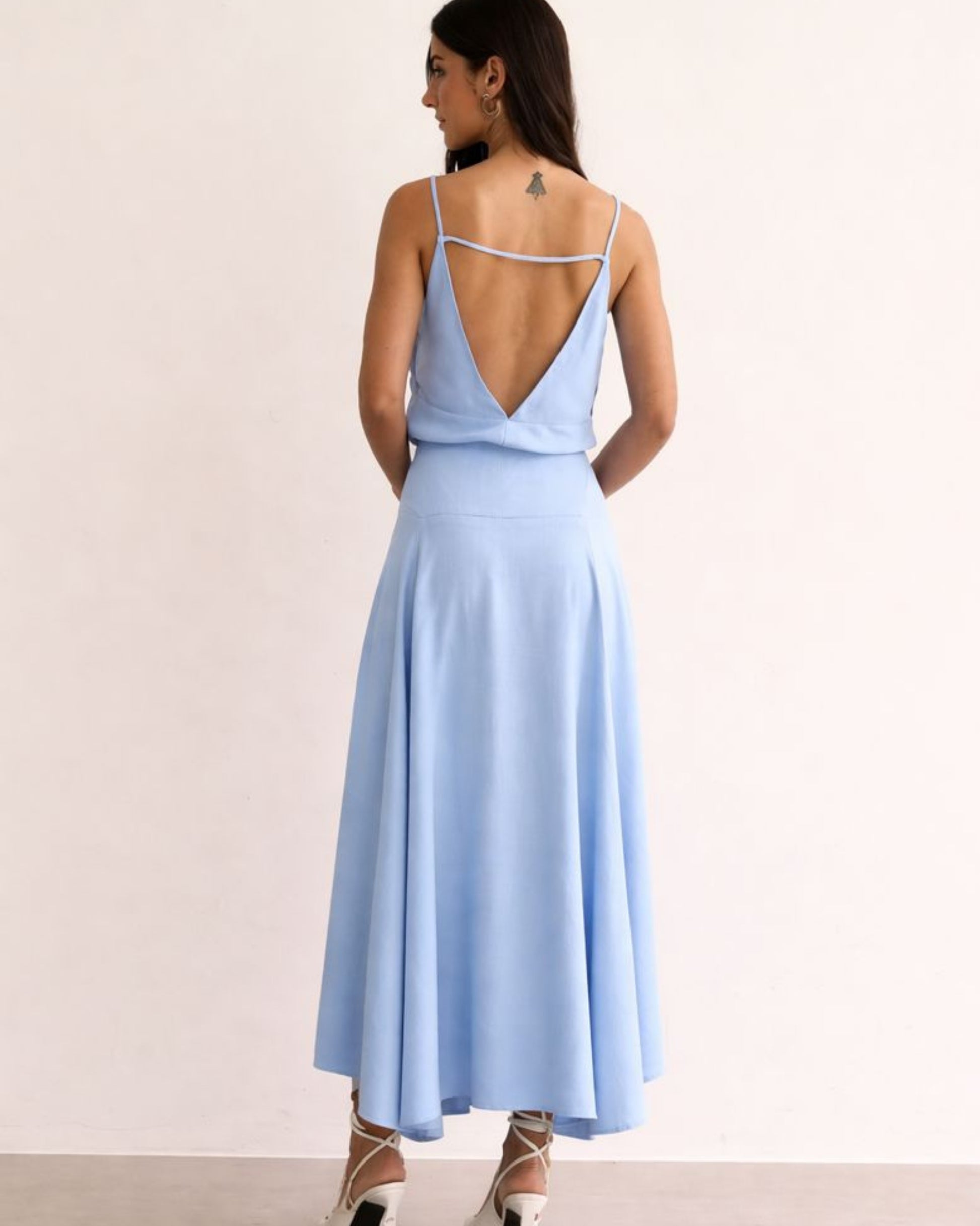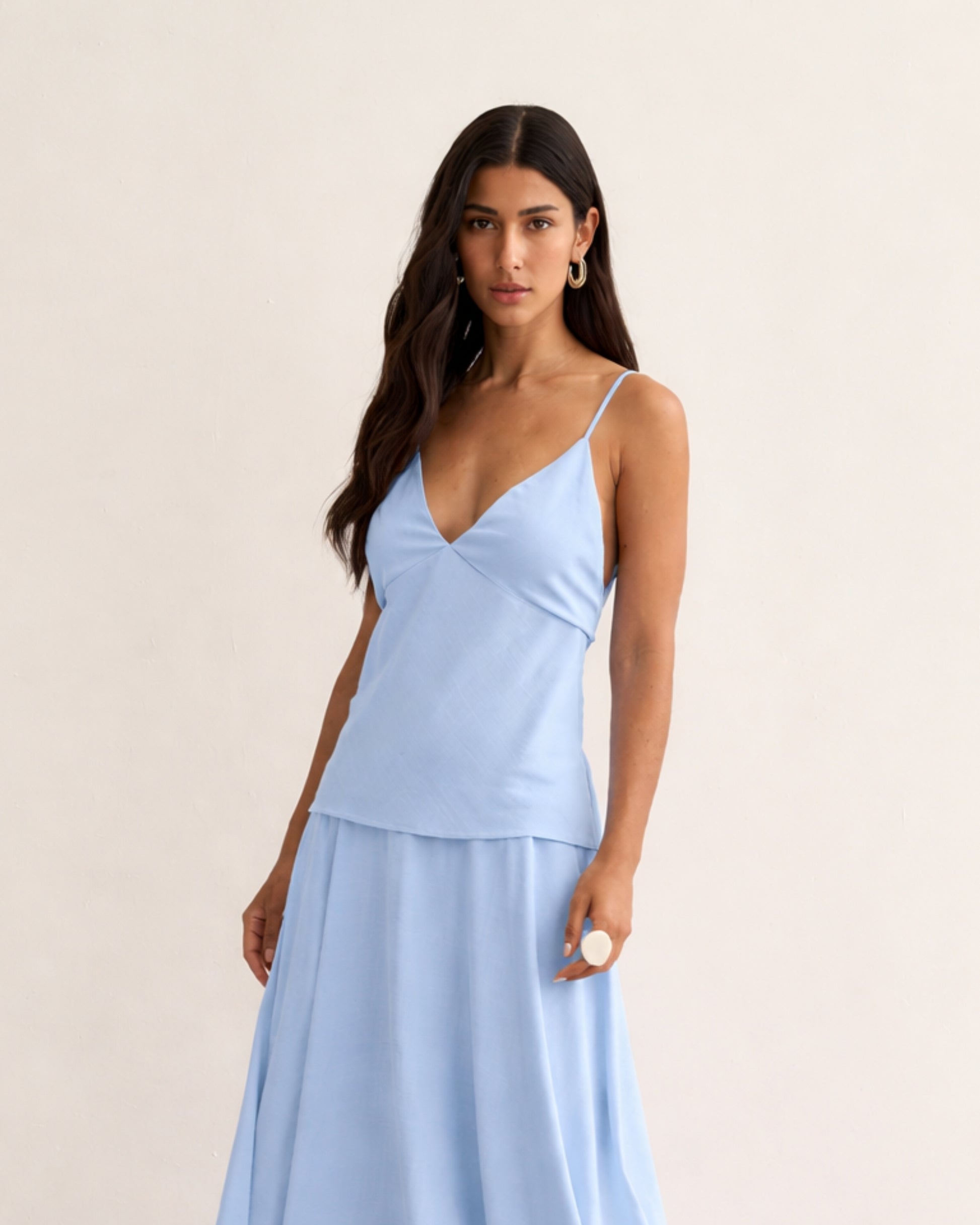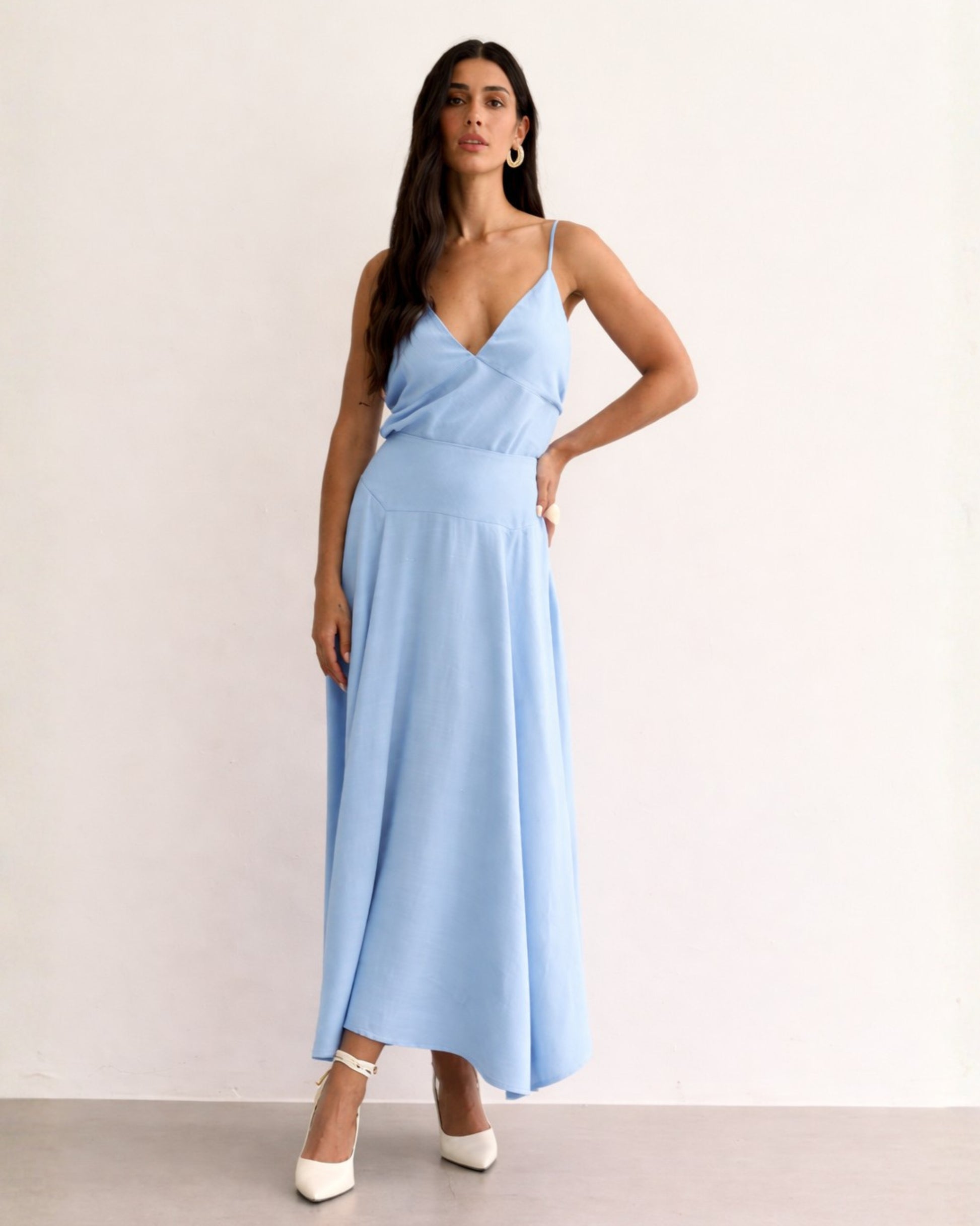 Saia midi com recorte estruturado no quadril, caimento fluido e barra assimétrica. Possui zíper lateral embutido e movimento amplo.