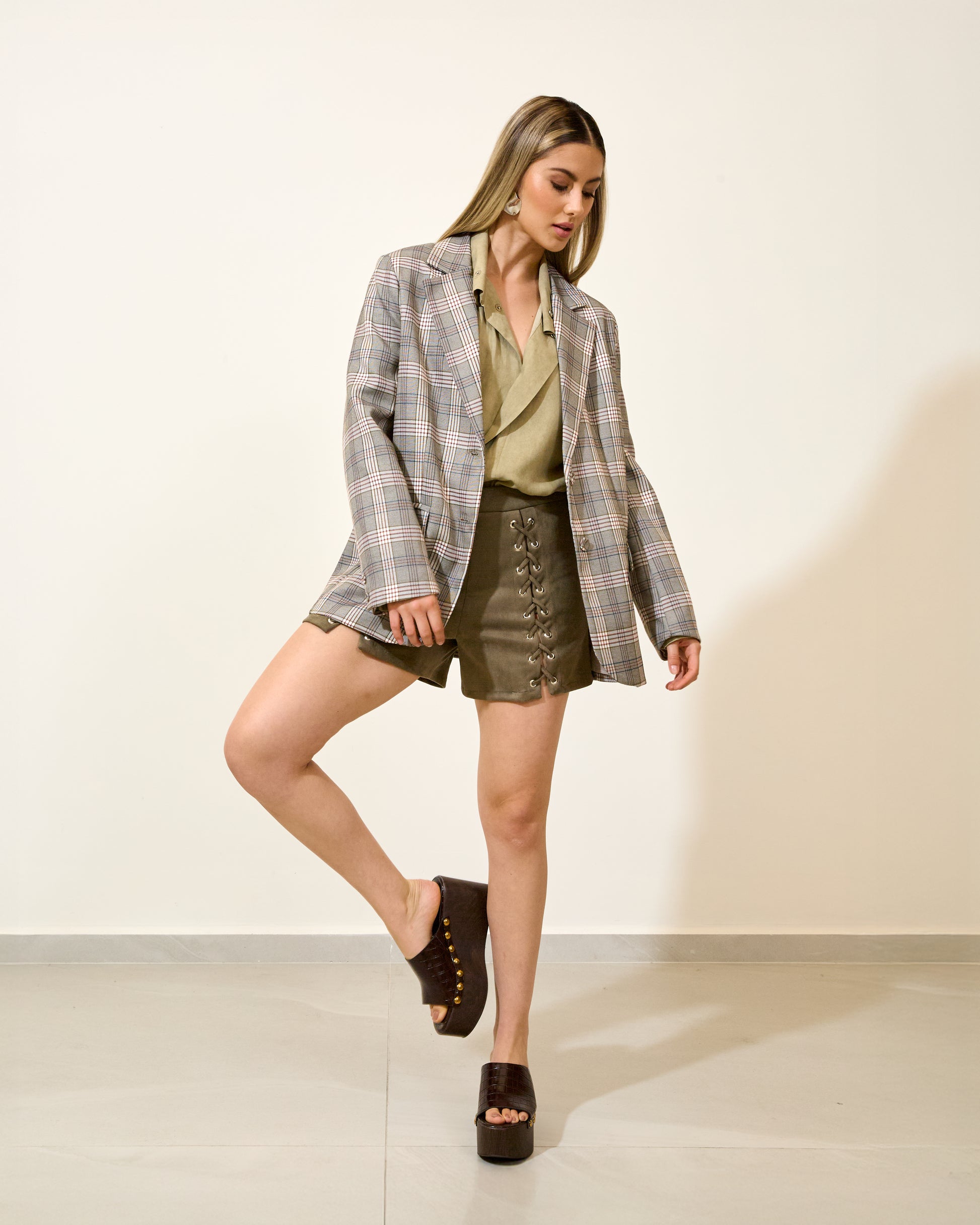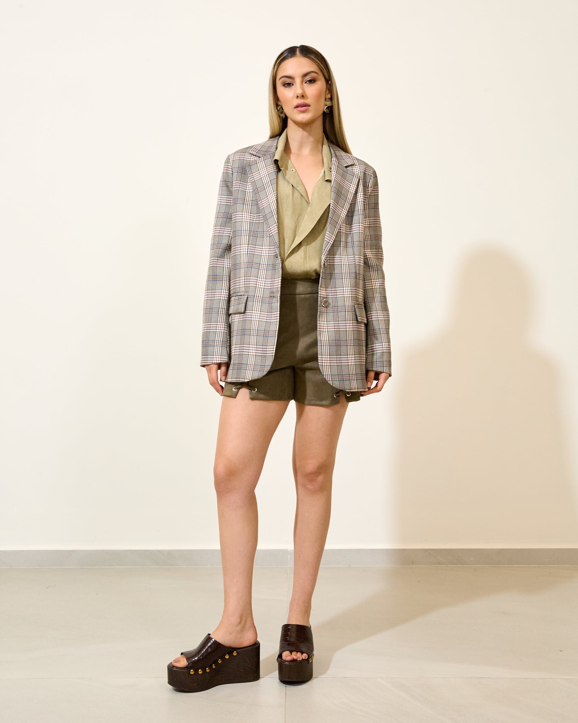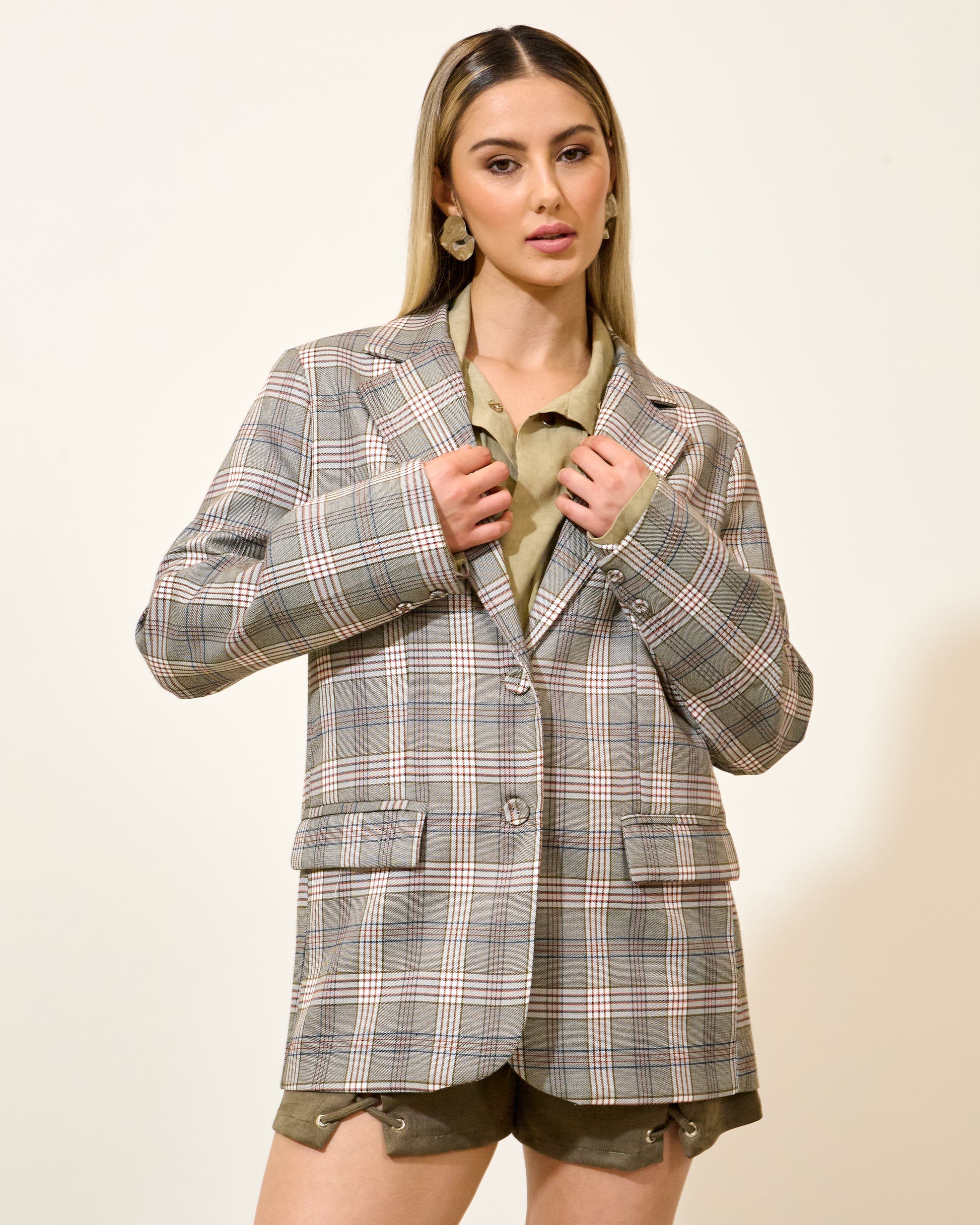 Blazer xadrez com lapela clássica, caimento estruturado e com lapela, não possui bolsos. Visual elegante e atemporal para ocasiões versáteis.