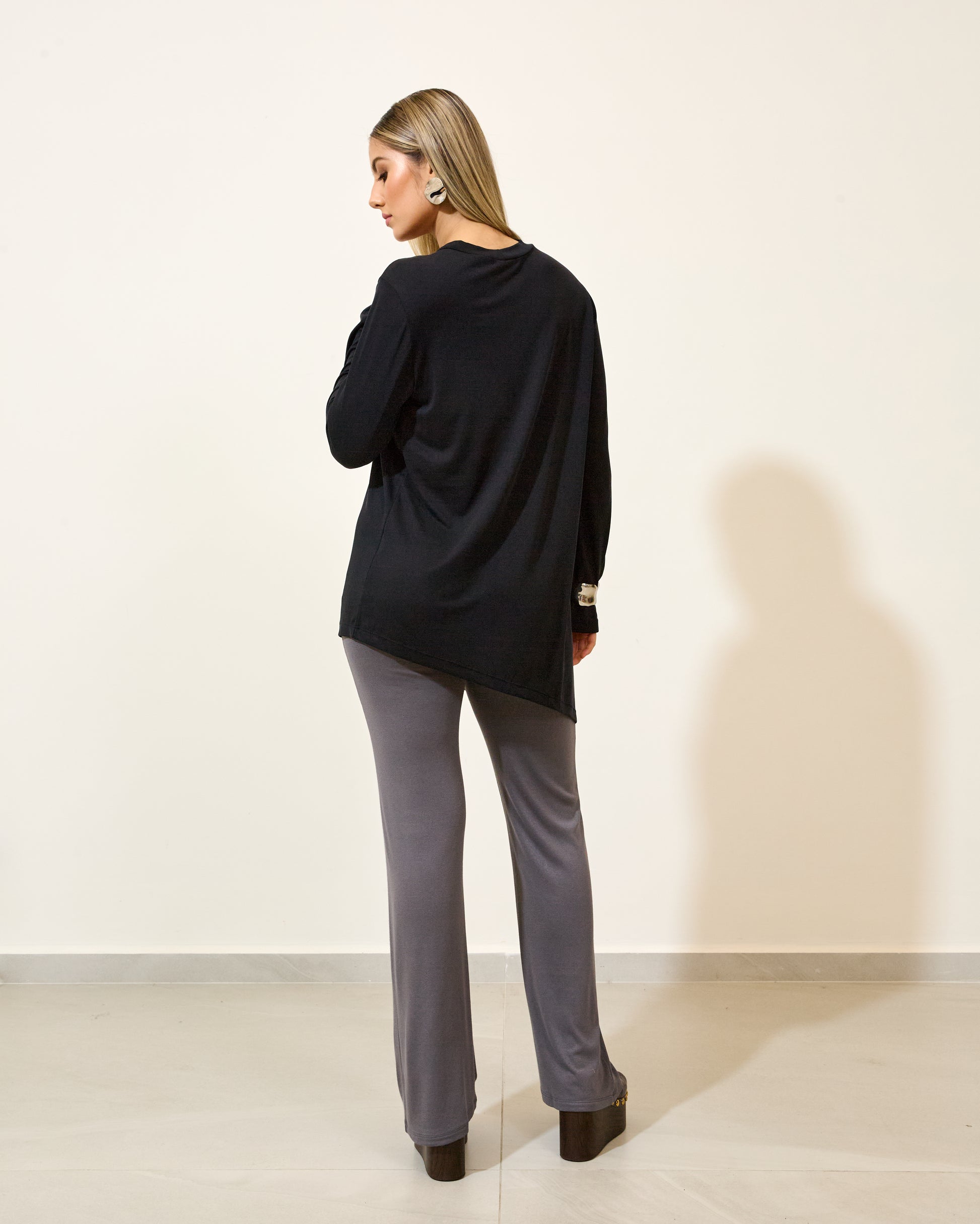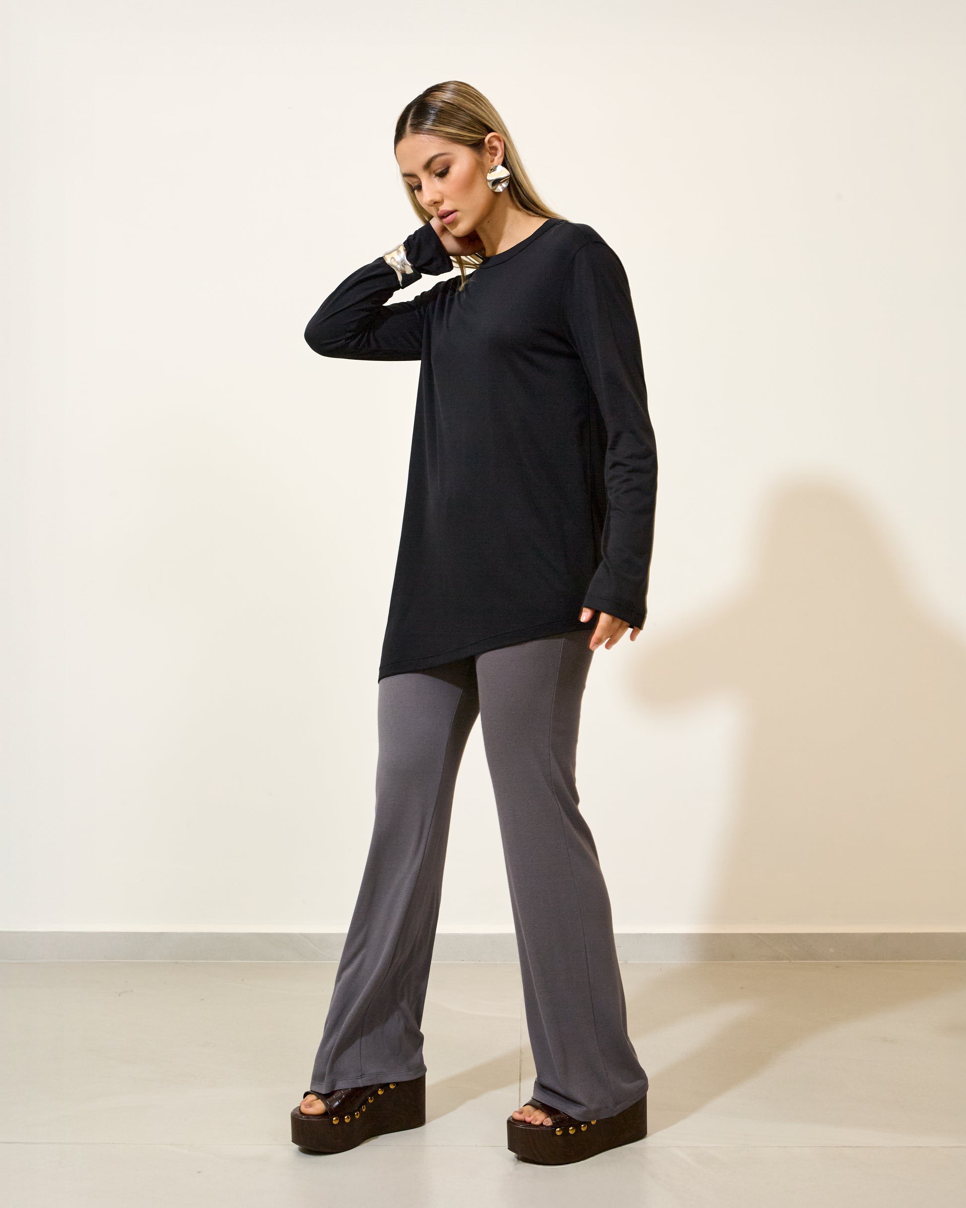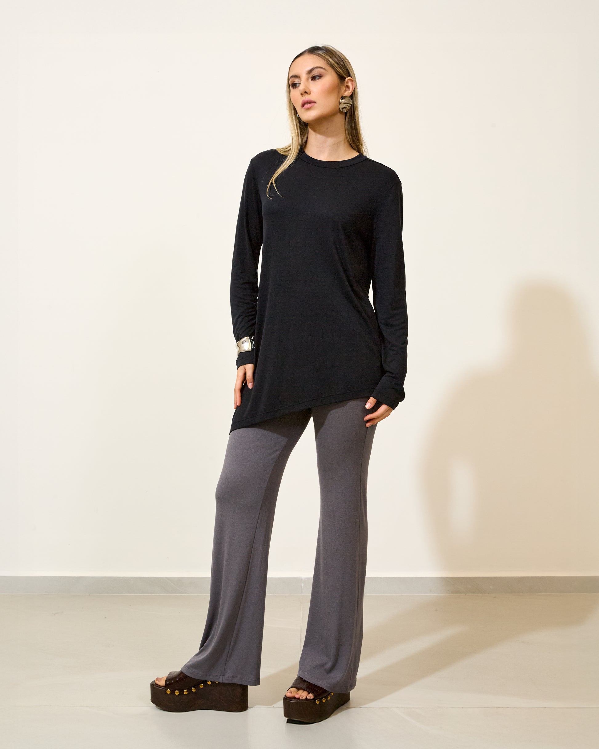 Calça reta em malha de viscose com cós de elástico e caimento leve. Confortável e versátil.