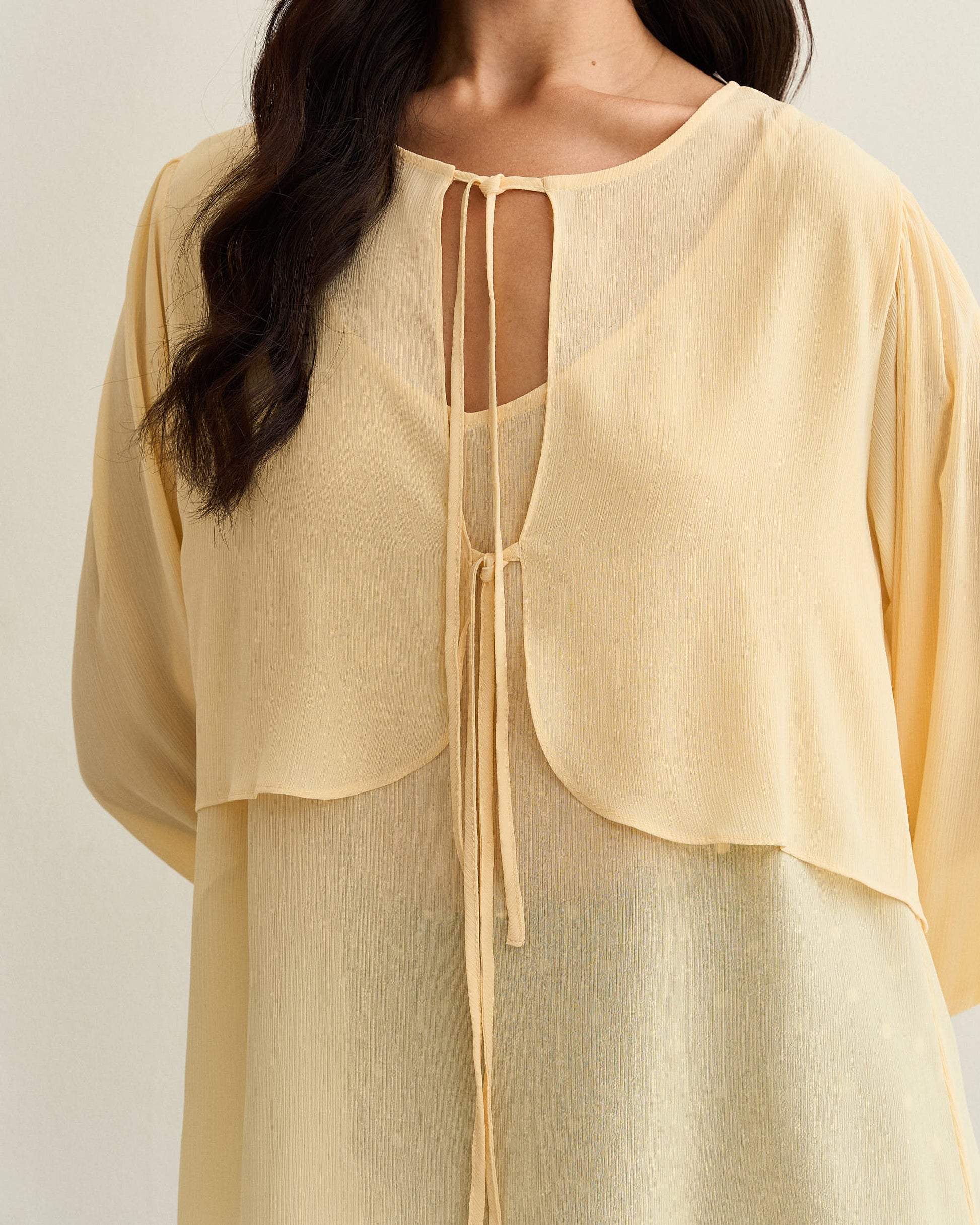 Blusa confeccionada em tecido leve e texturizado, com recorte de sobreposição frontal que cria um efeito fluido. Possui amarração no decote e mangas longas com leve volume e acabamento ajustável nos punhos, mantendo o caimento suave sem marcar. O corpo é levemente translúcido, com base reta e comprimento intermediário.