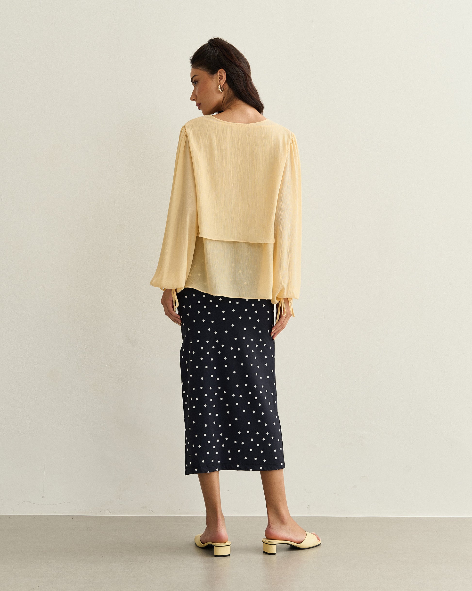 Blusa leve com sobreposição frontal, decote com amarração e mangas de volume suave. Caimento fluido e acabamento delicado.