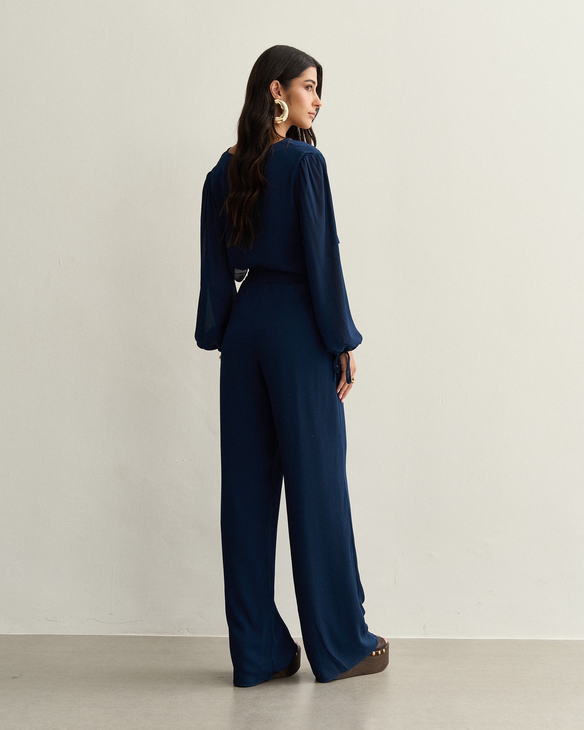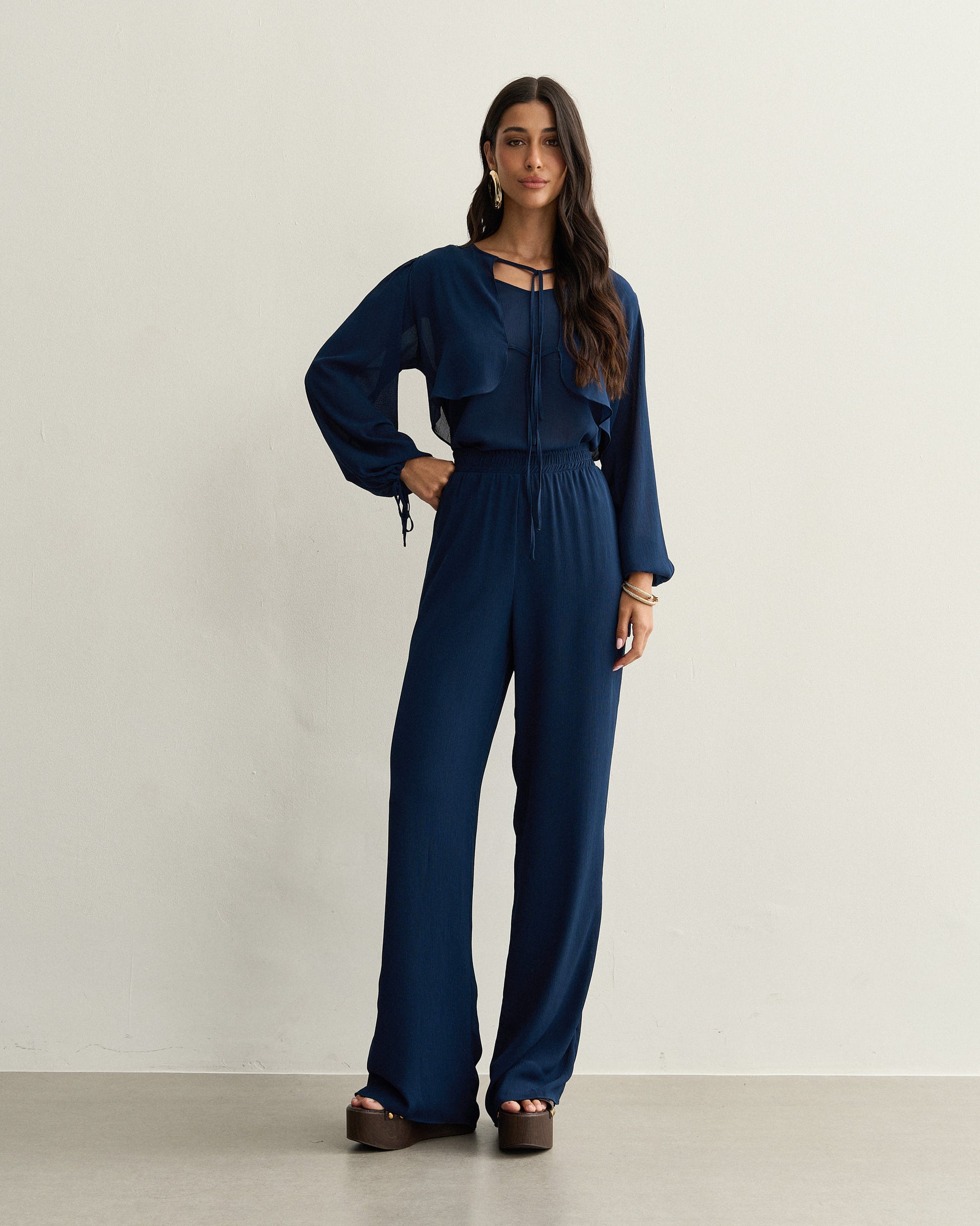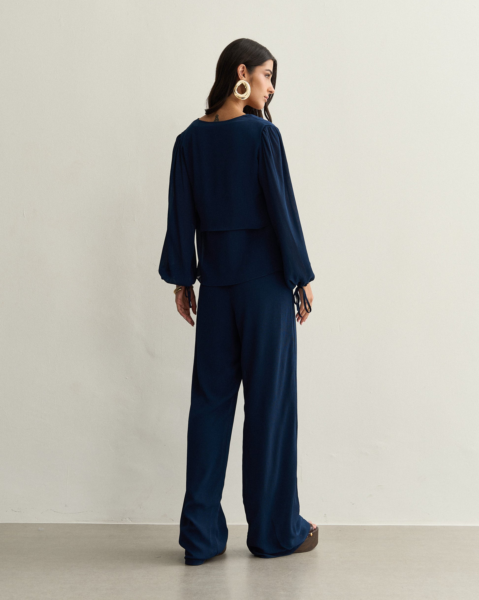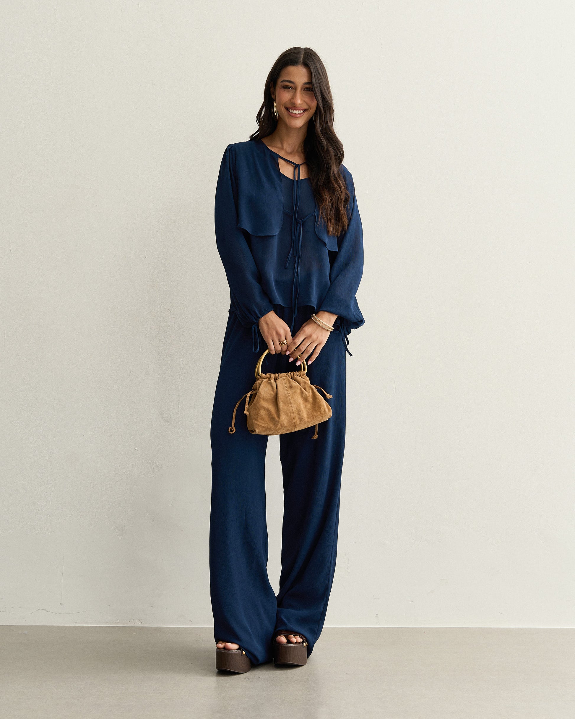 Blusa leve com sobreposição frontal, decote com amarração e mangas de volume suave. Caimento fluido e acabamento delicado.
