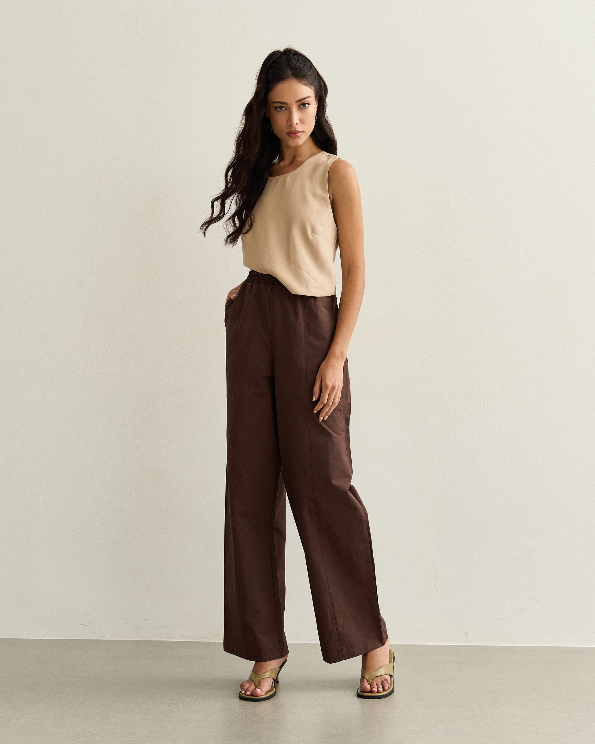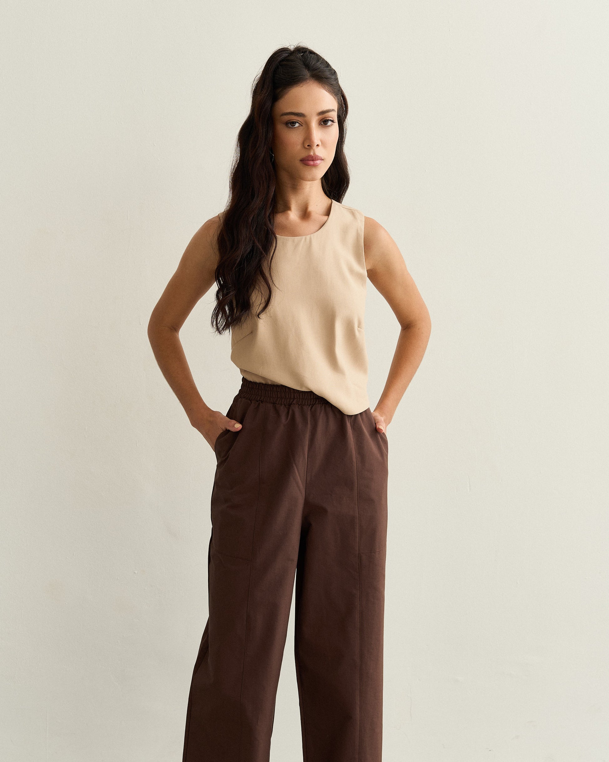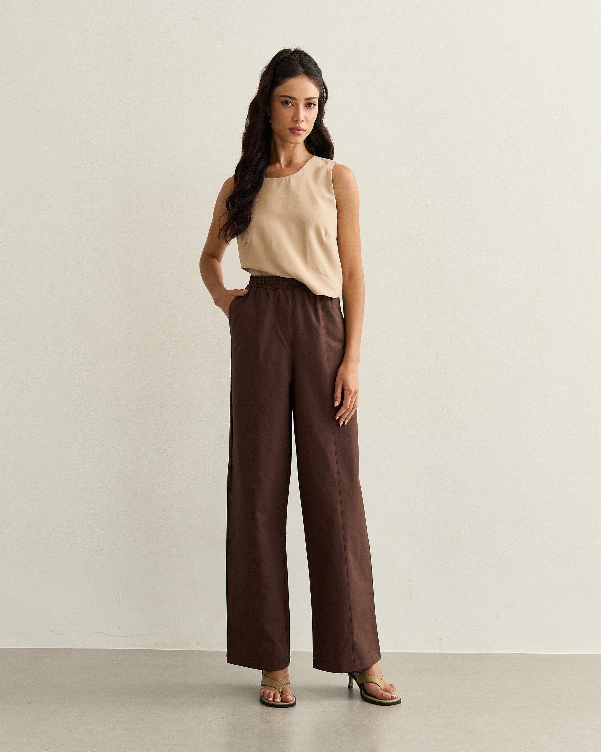 Calça de modelagem reta com caimento leve e cintura alta, que garante conforto e sofisticação no dia a dia. Possui cós elástico embutido que se ajusta perfeitamente ao corpo e bolsos laterais funcionais. O tecido tem estrutura leve e toque suave, ideal para produções elegantes com praticidade.