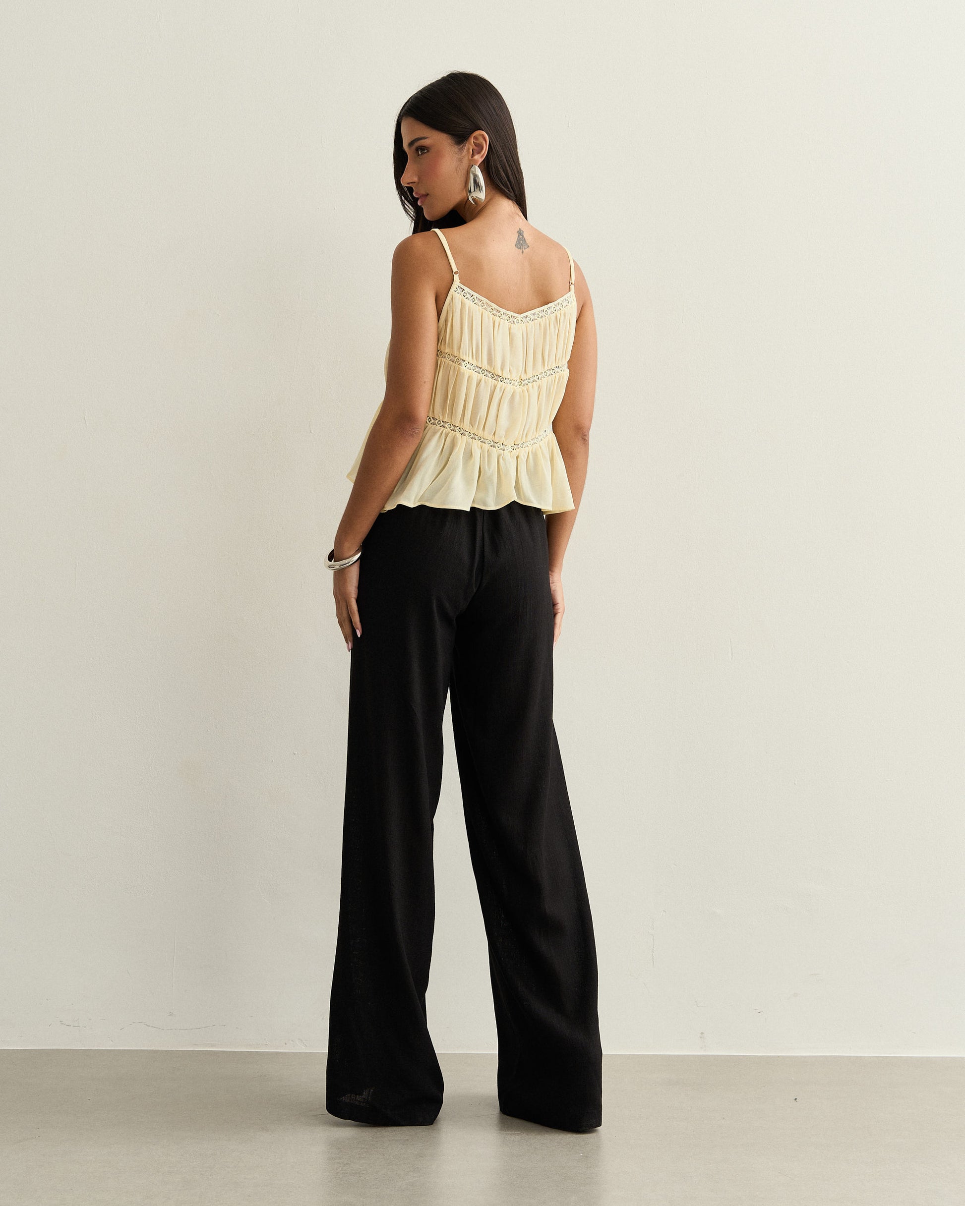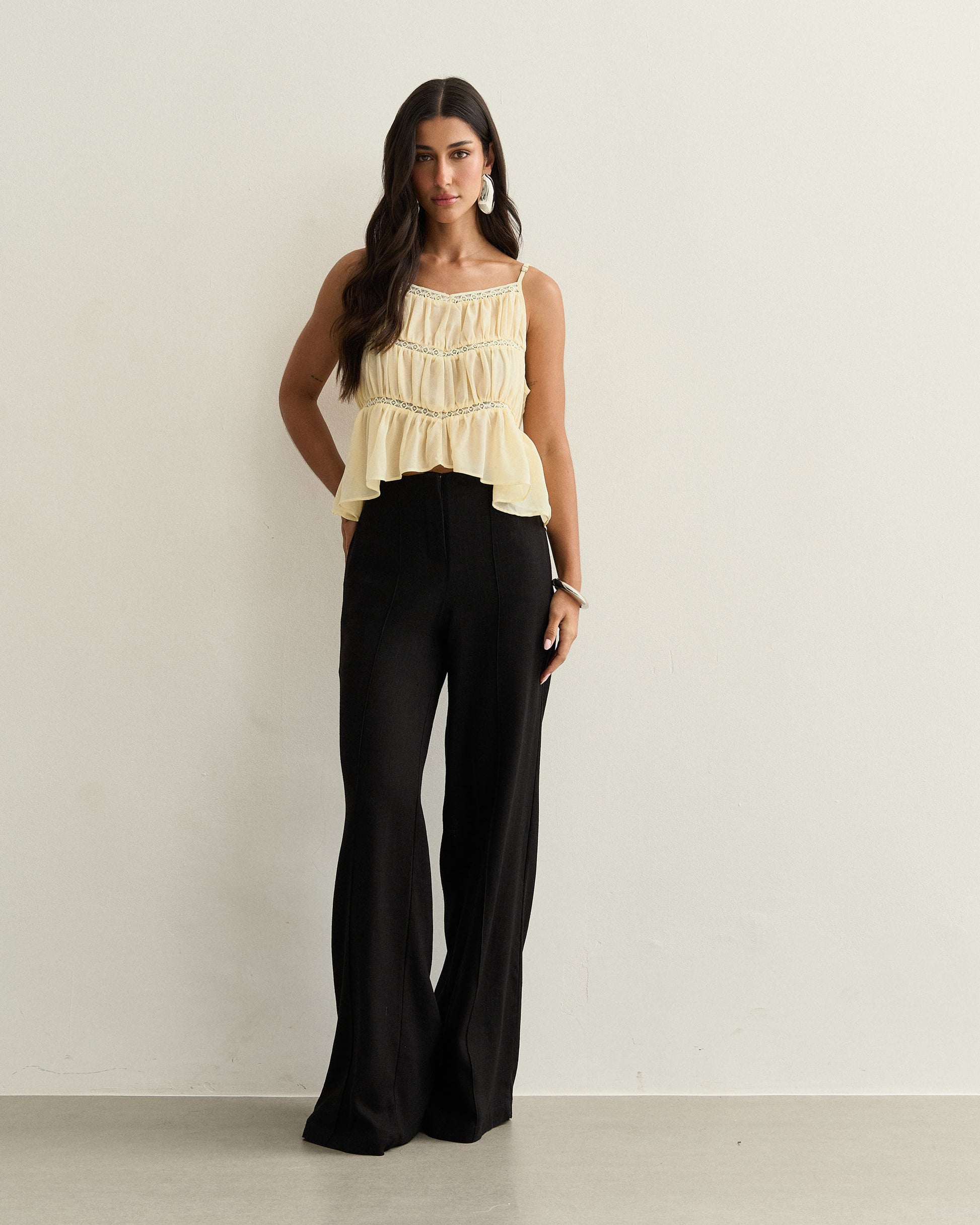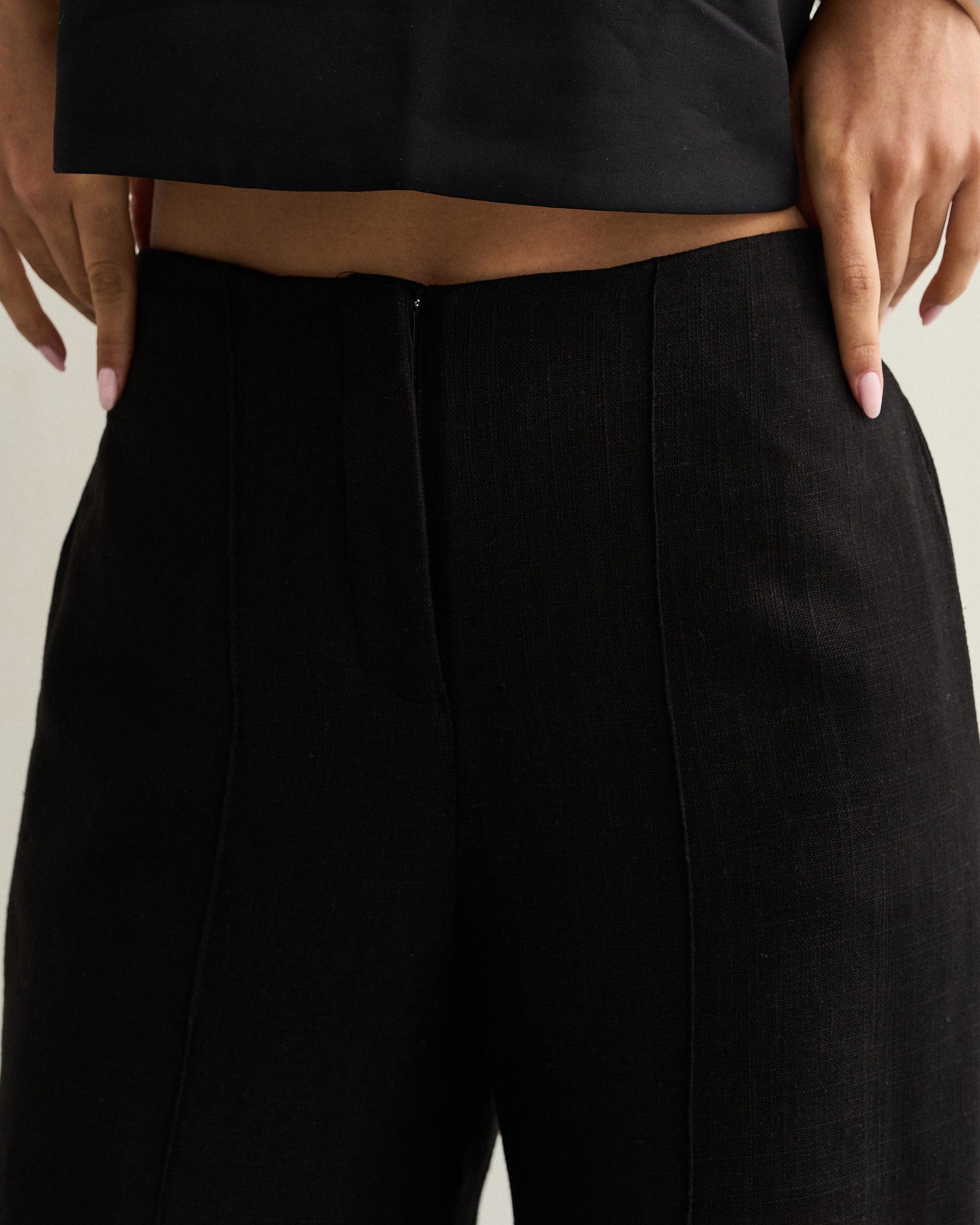 A calça de alfaiataria possui fechamento frontal por zíper invisível, cós limpo e recorte central que alonga visualmente as pernas. Confeccionada em tecido de toque leve e estrutura firme, oferece conforto e sofisticação na medida certa. Versátil e moderna, é perfeita para compor produções do trabalho ao jantar.