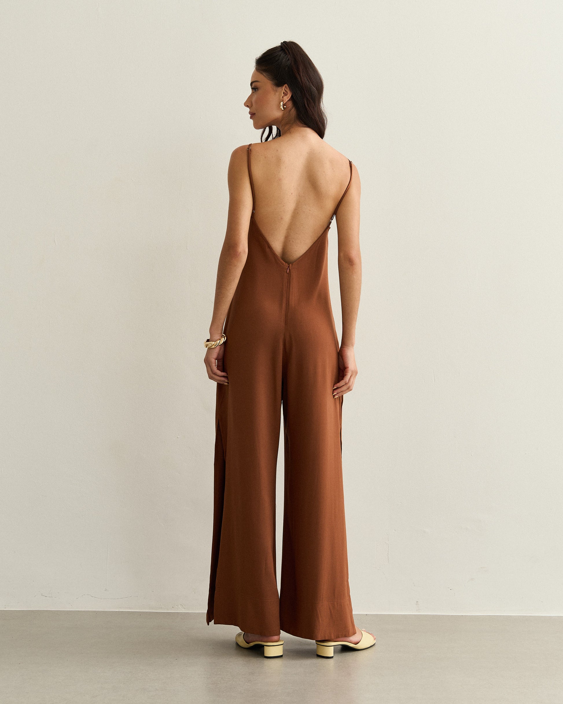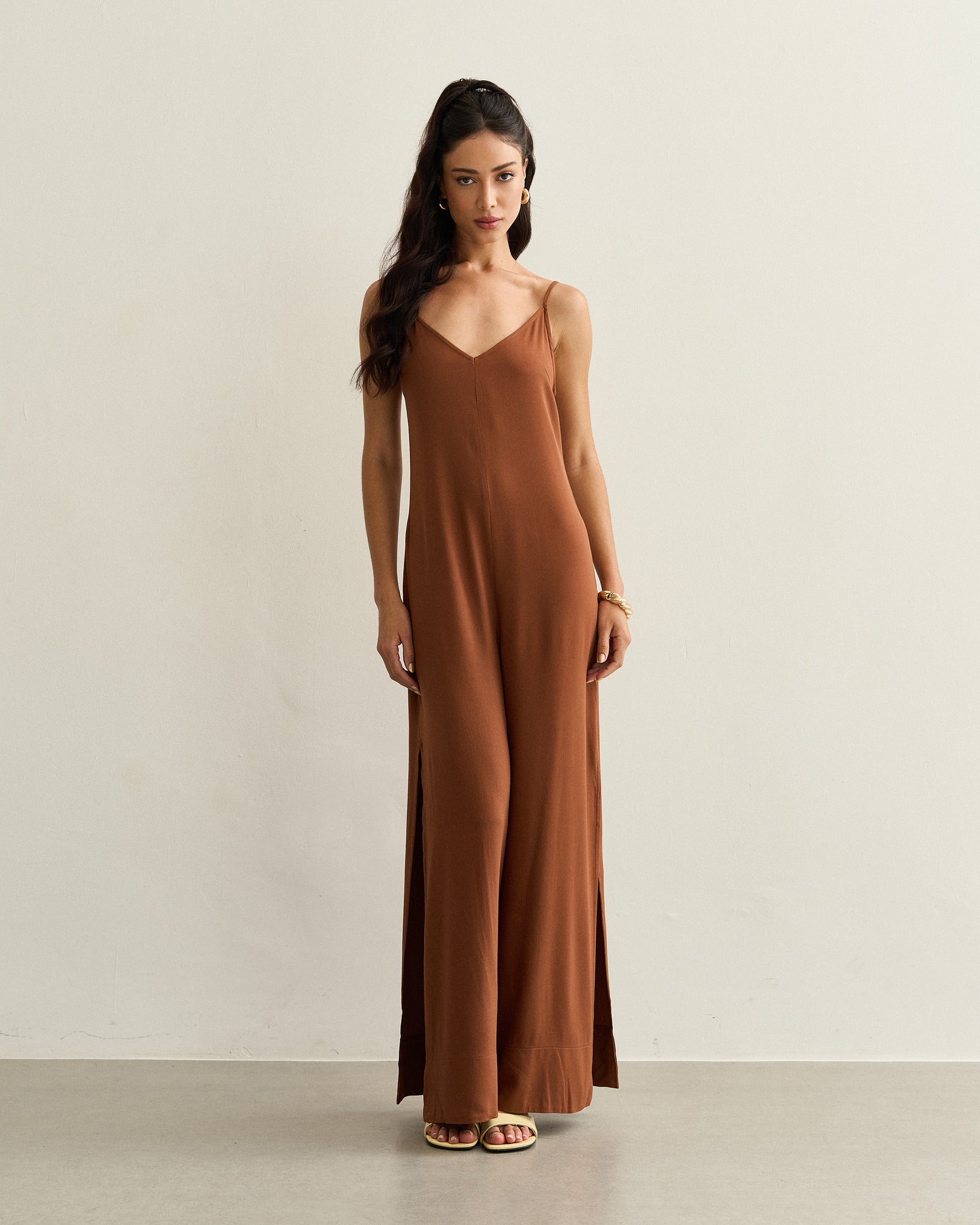 Macacão longo de tecido leve com decote em V, alças finas ajustáveis e fendas laterais que trazem fluidez e elegância.