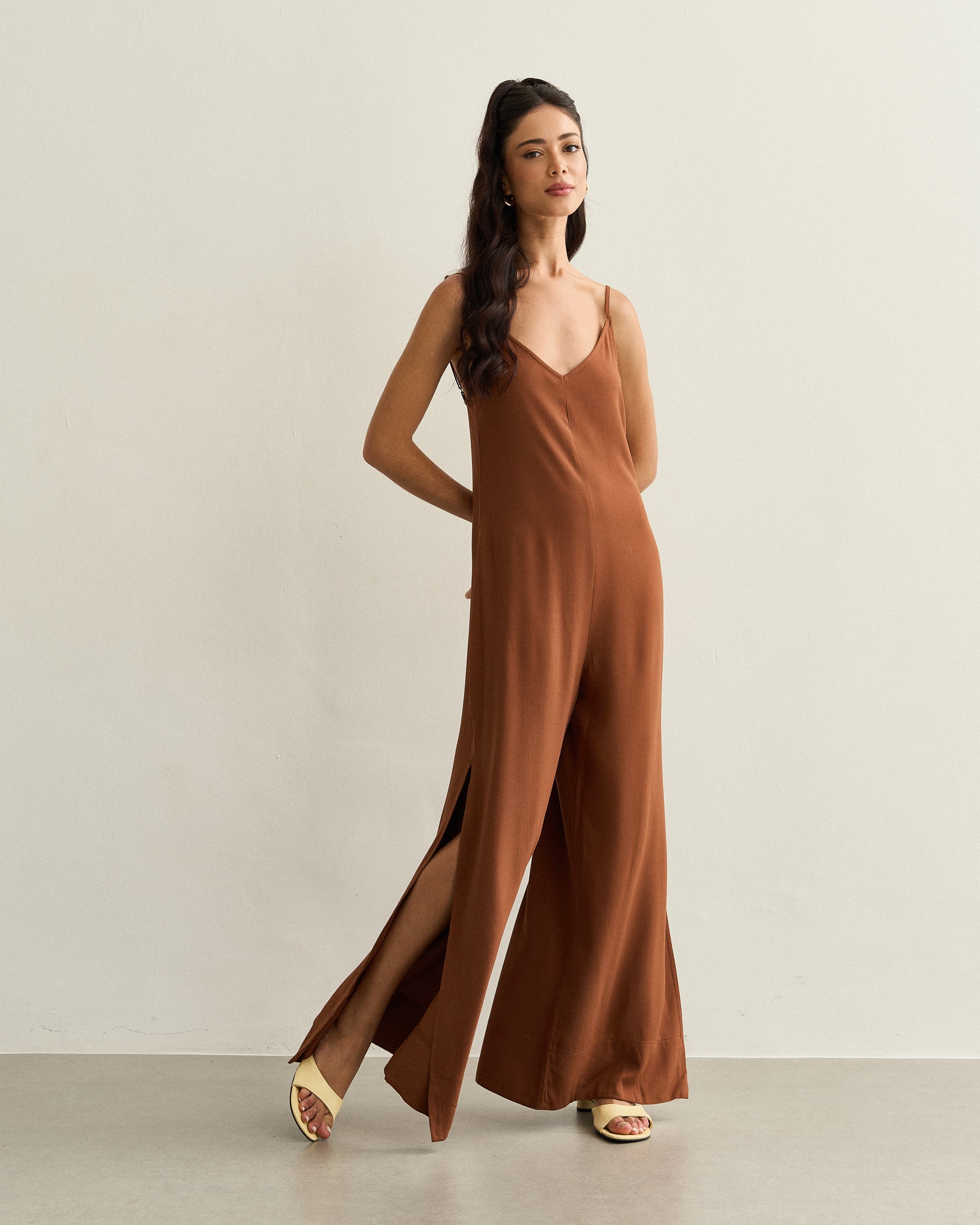 Macacão longo confeccionado em tecido leve de toque suave, com modelagem ampla e caimento fluido. Possui decote em V, alças finas ajustáveis e fendas laterais que proporcionam movimento e elegância ao andar. O fechamento traseiro por zíper invisível garante um visual limpo e sofisticado.