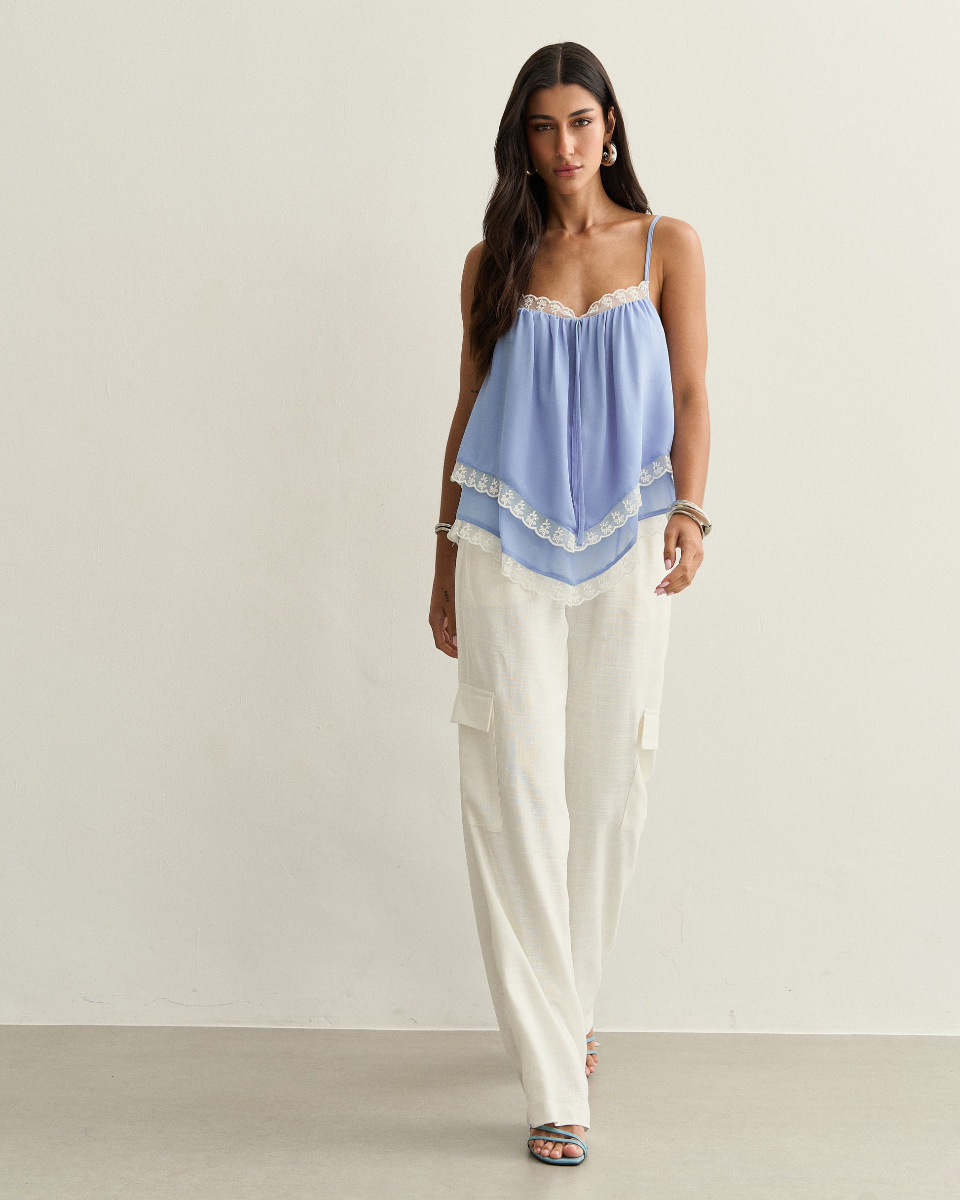 Regata fluida em camadas com alças finas e acabamento em renda contrastante.