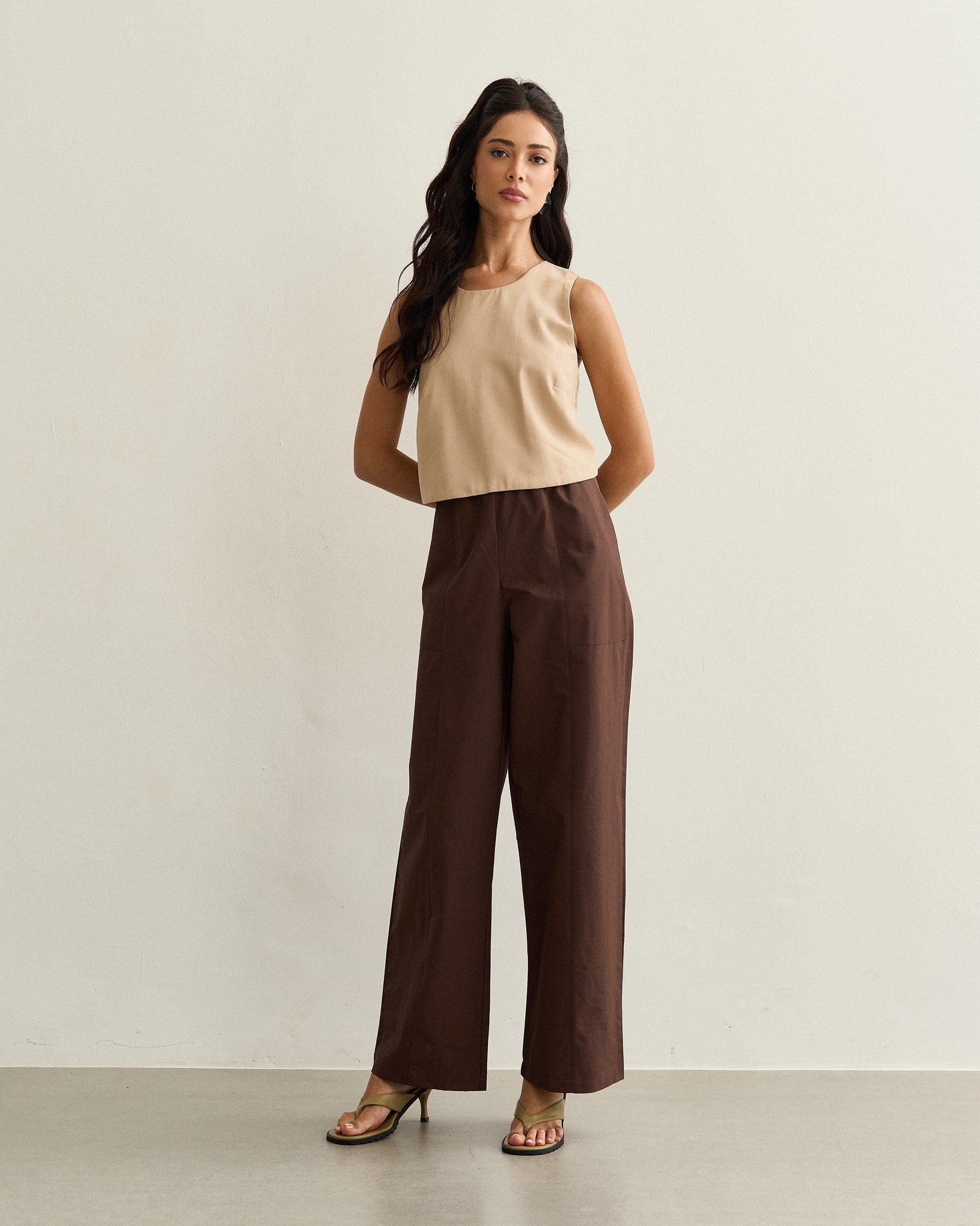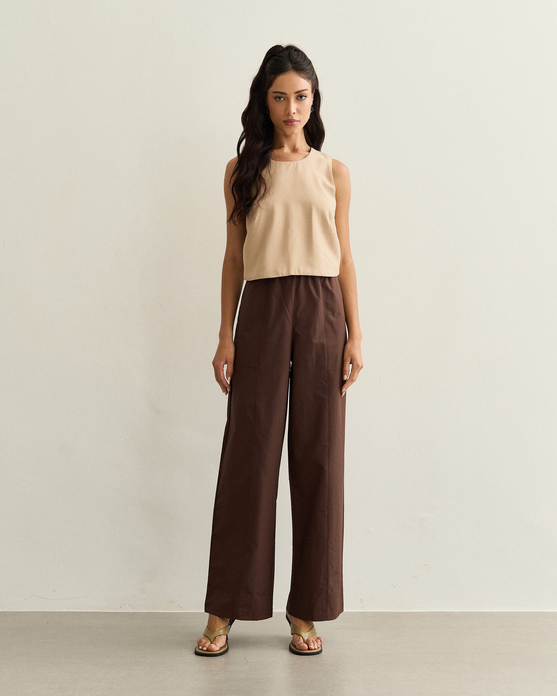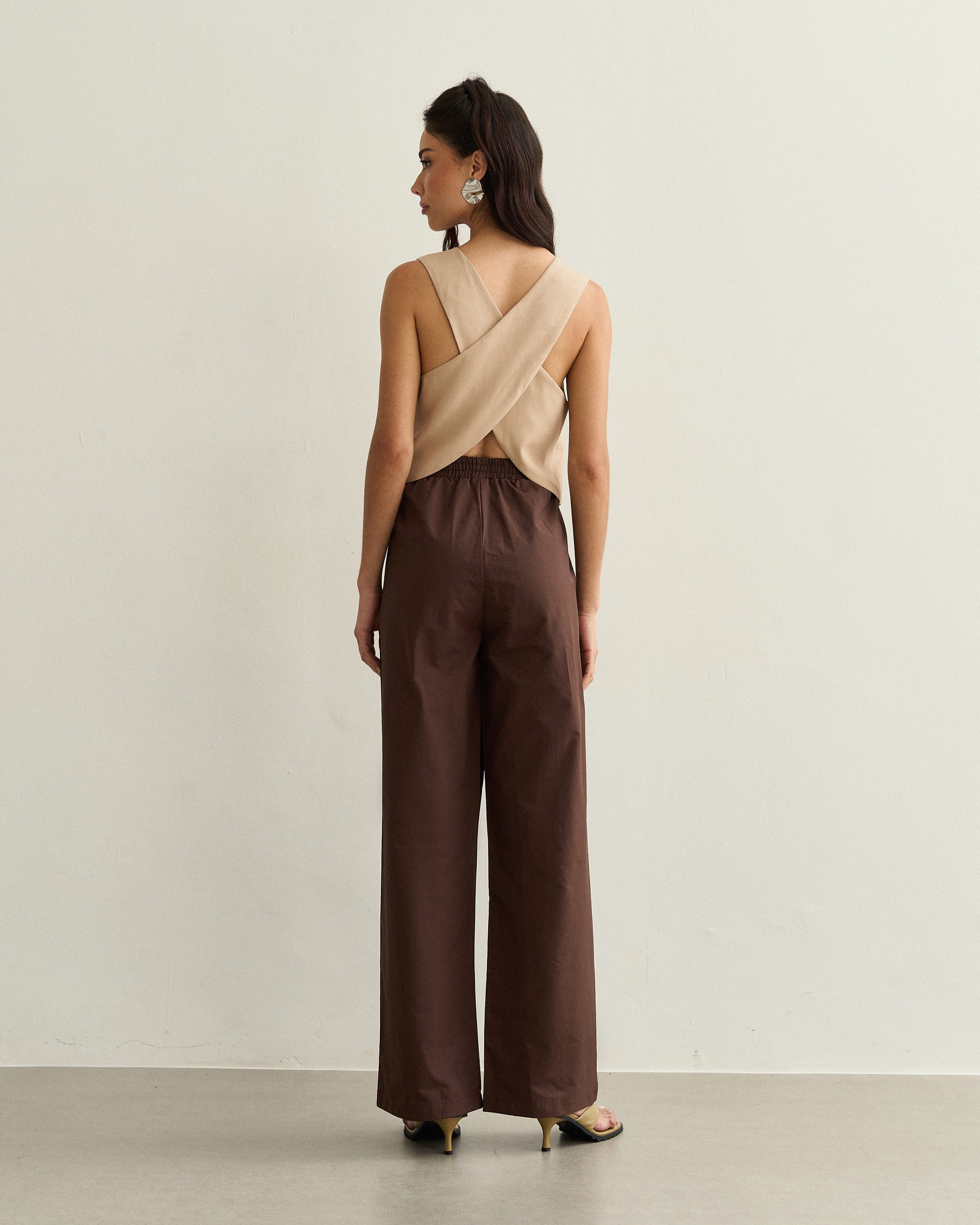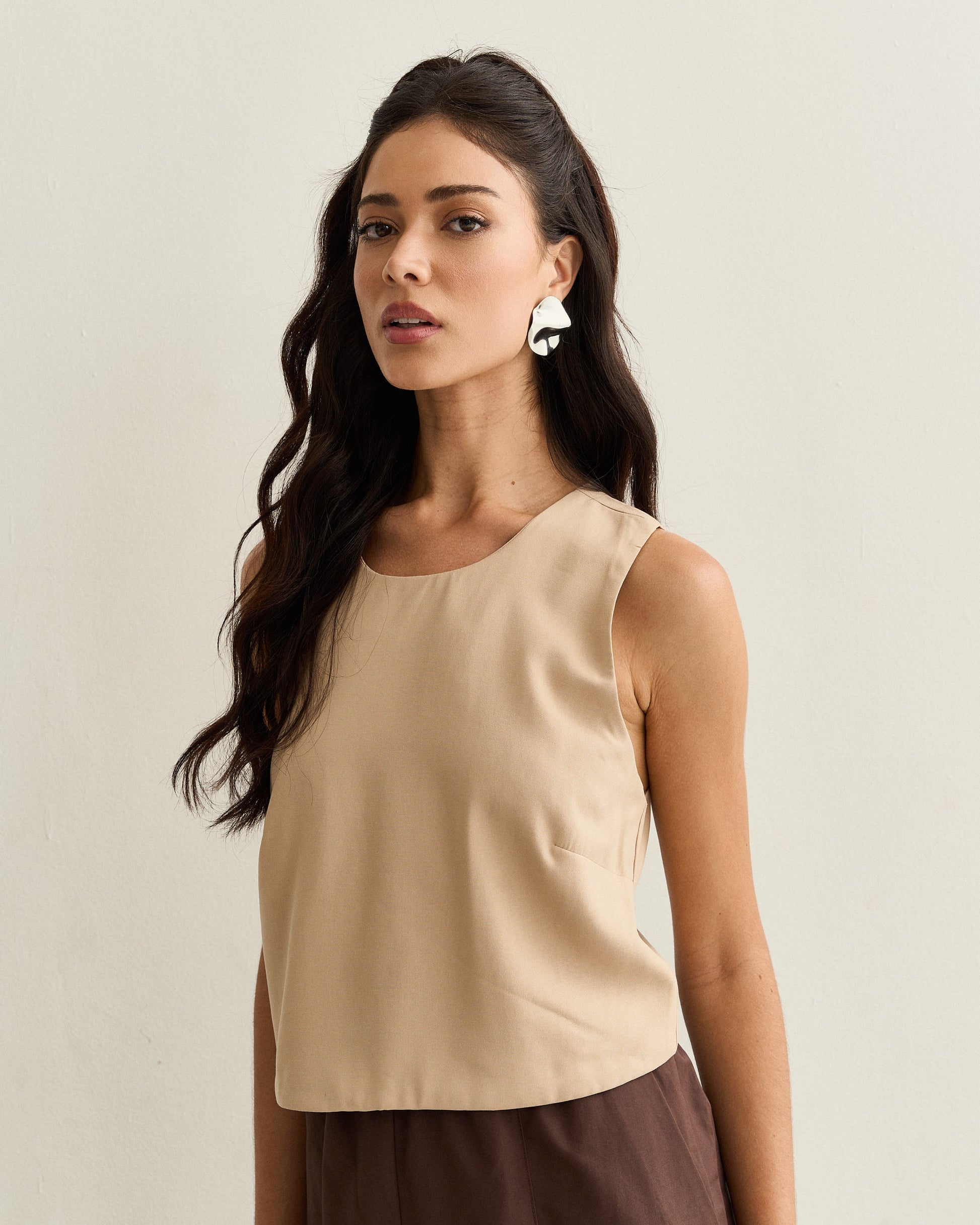Regata de tecido leve com decote arredondado e costas transpassadas, unindo sofisticação e leveza em uma peça versátil.