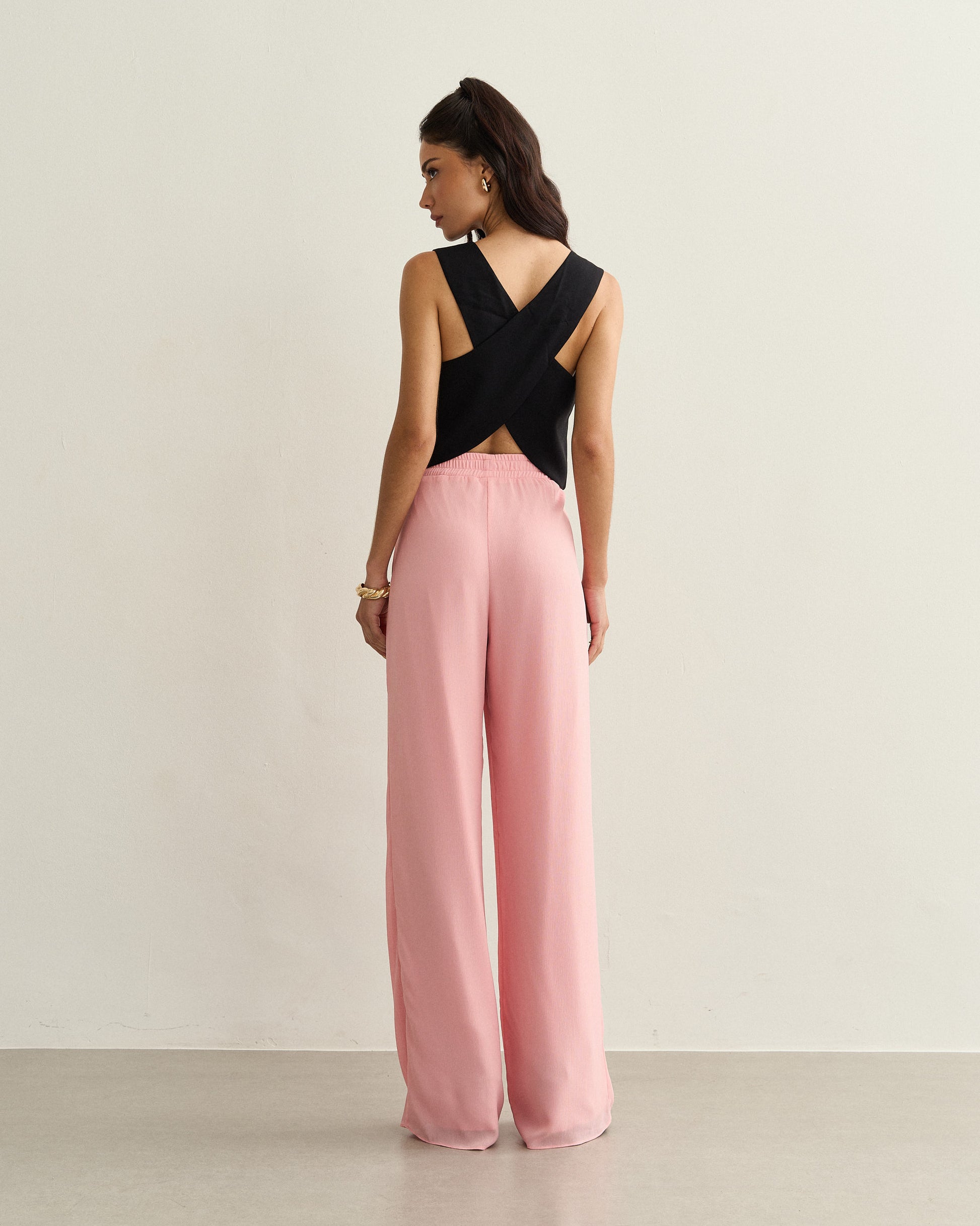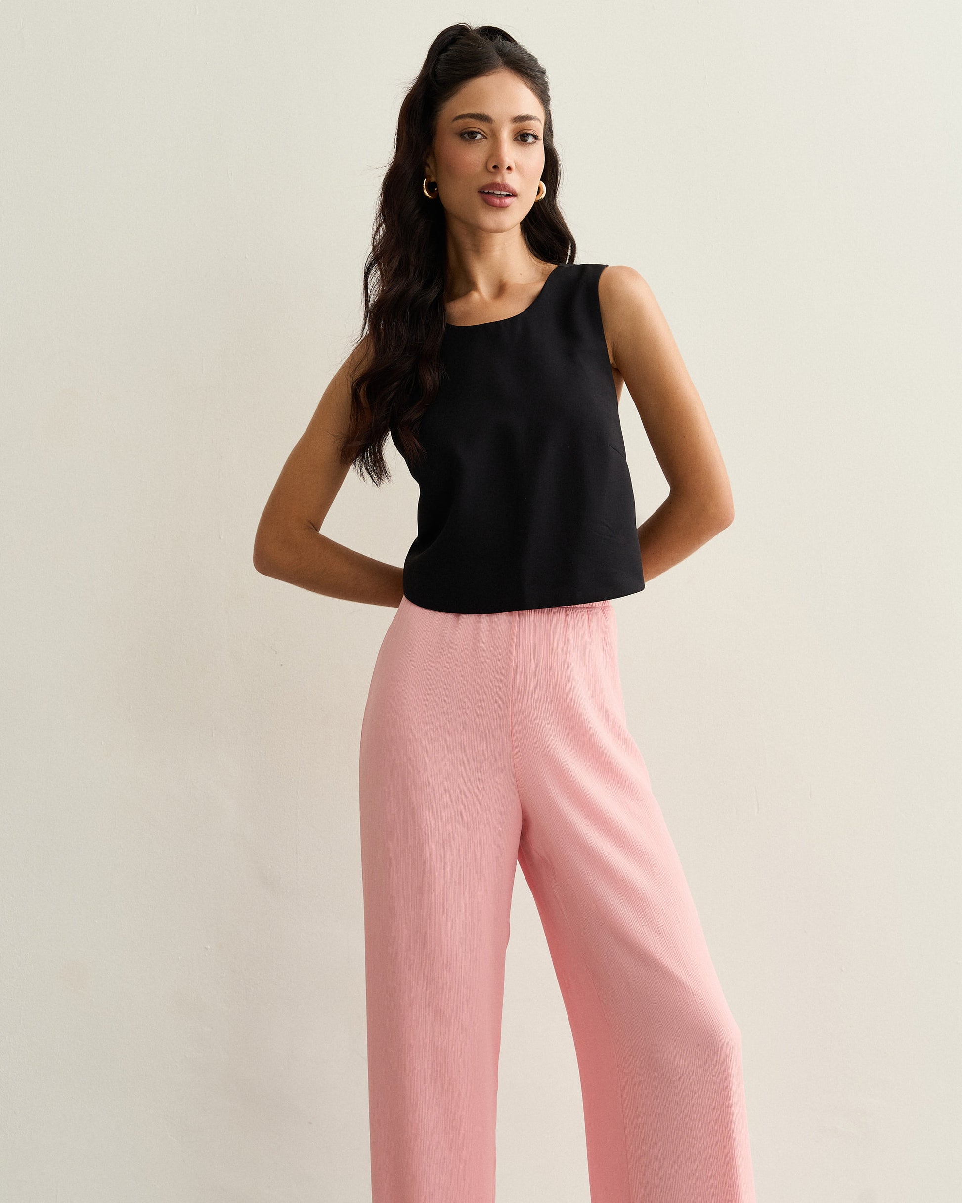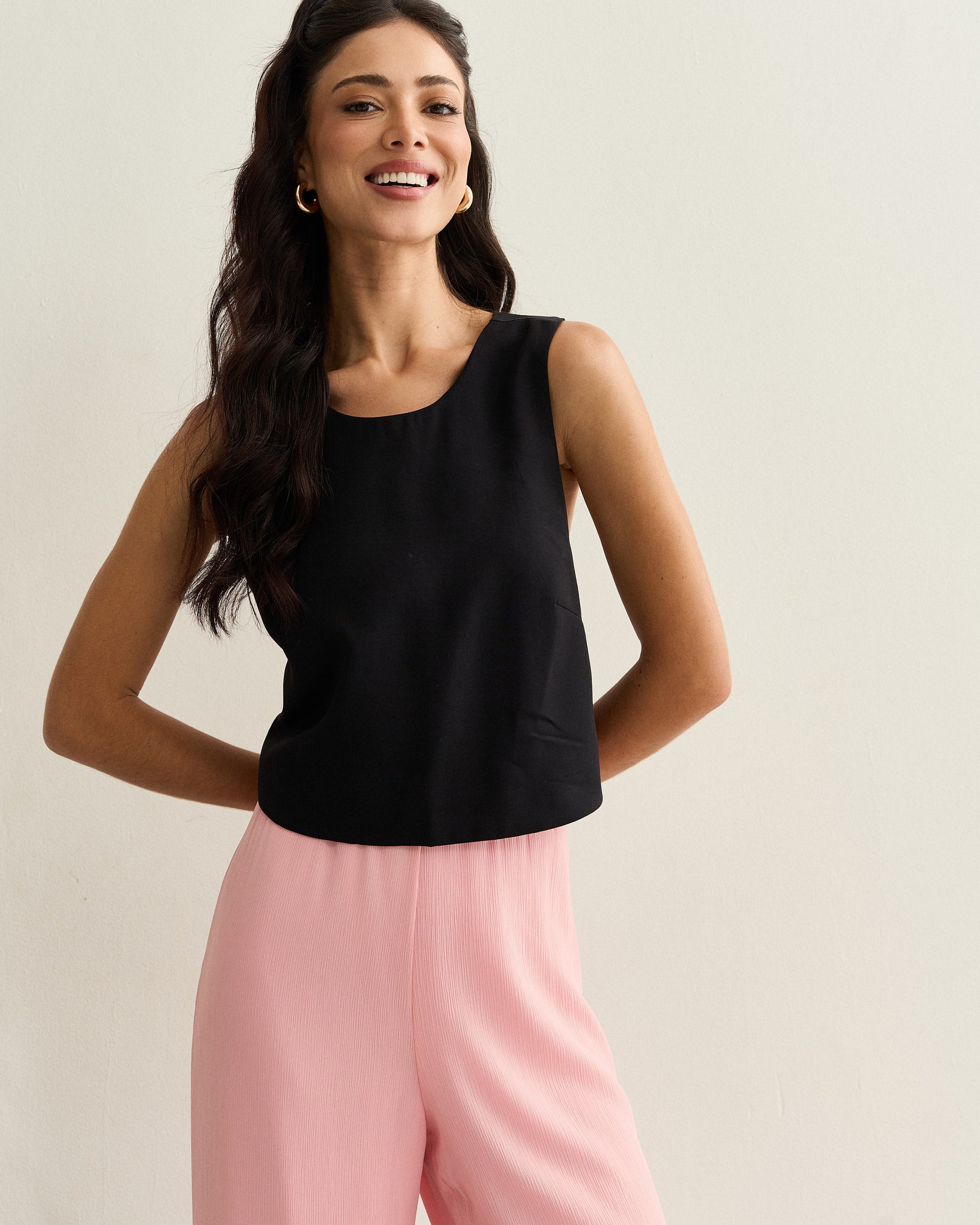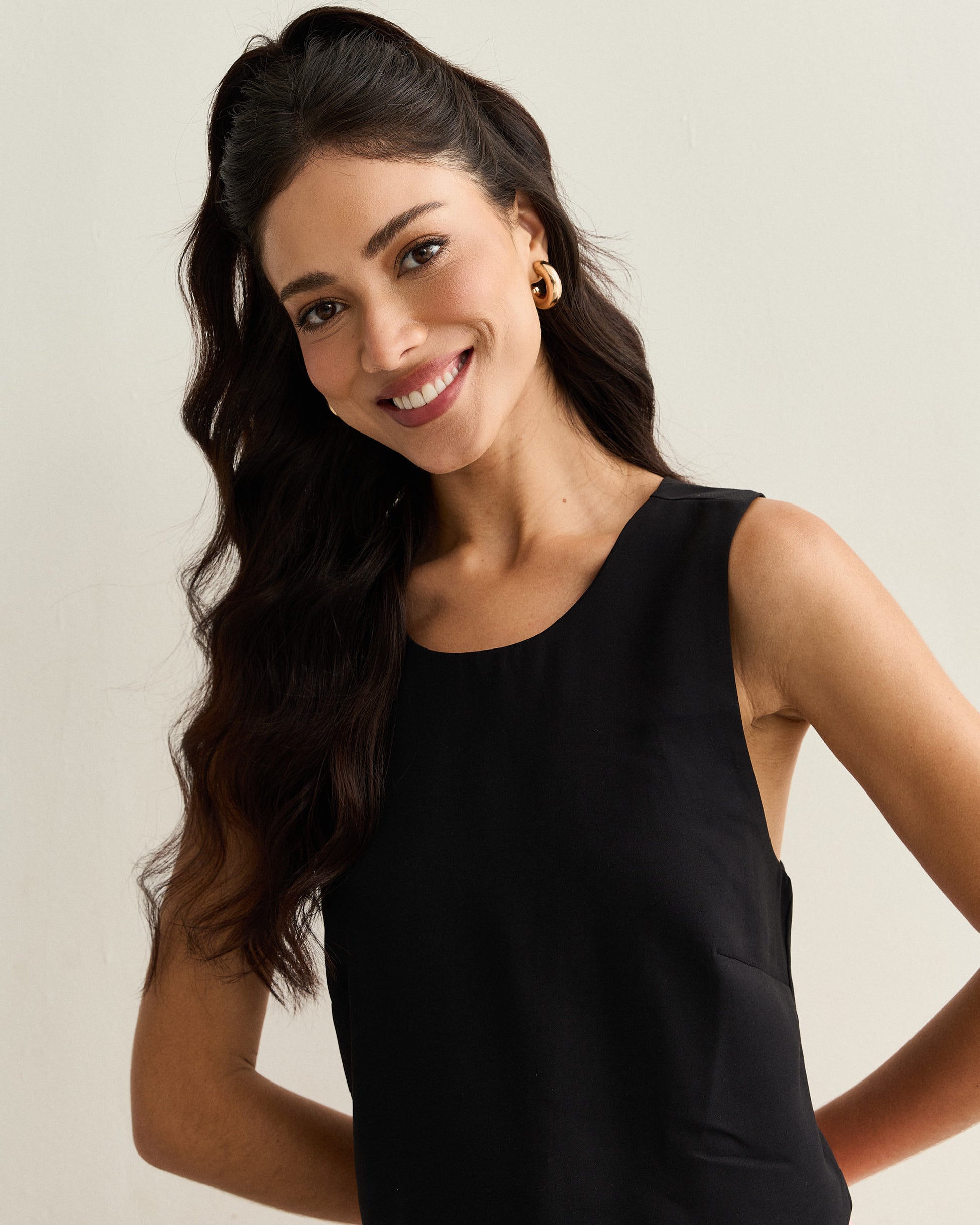 Regata de tecido leve com decote arredondado e costas transpassadas, unindo sofisticação e leveza em uma peça versátil.