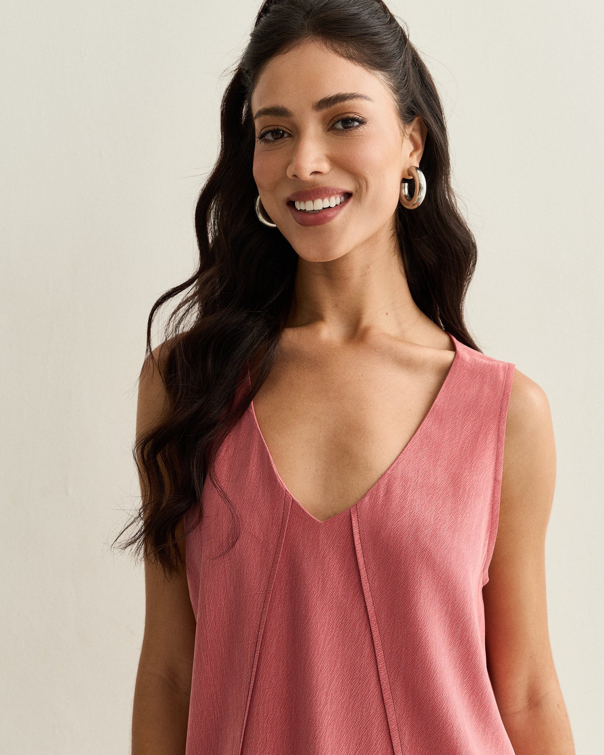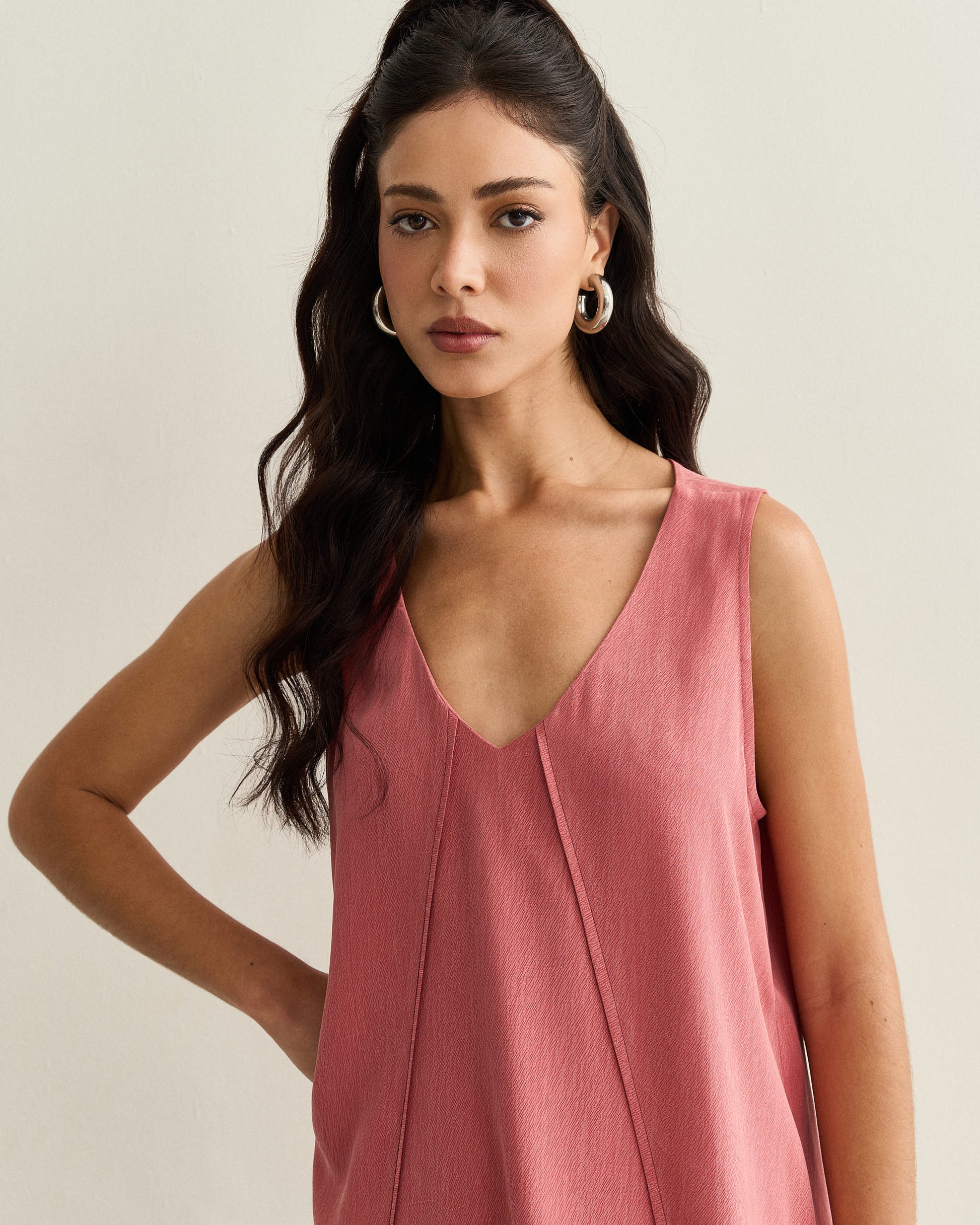 Regata em tecido leve com decote V e recortes frontais, que trazem movimento e fluidez à peça.