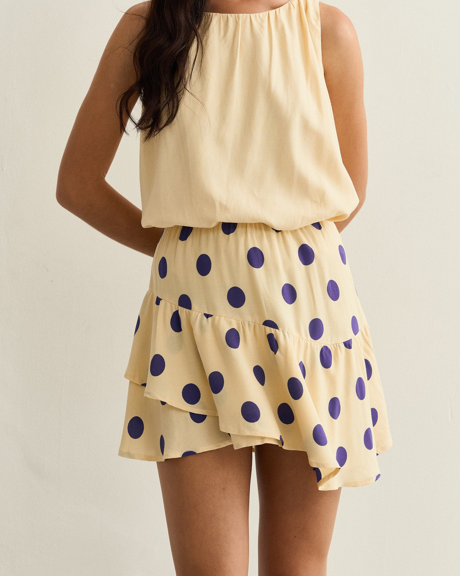Saia curta em tecido leve com poás, cós com elástico e babado assimétrico que traz movimento ao look.