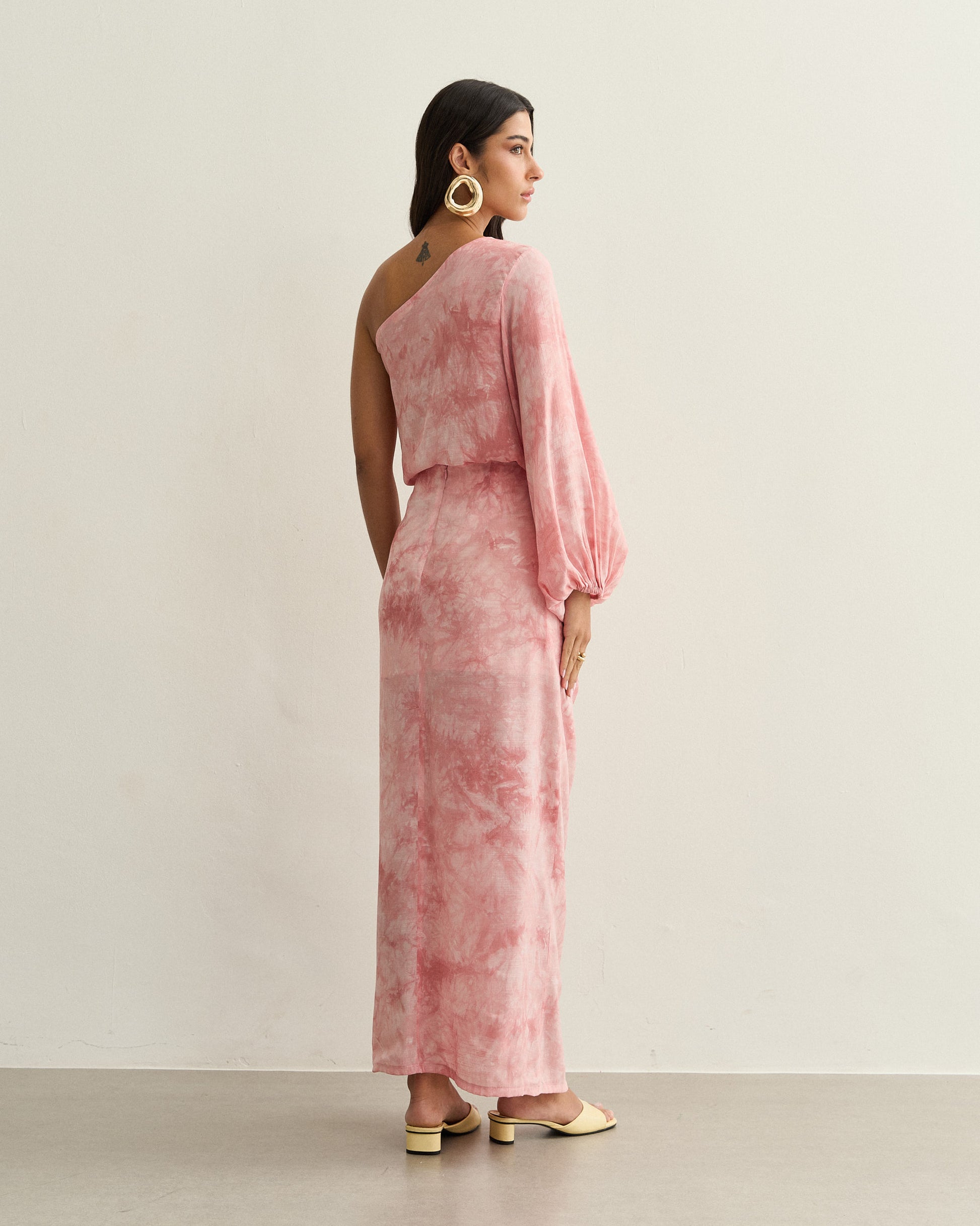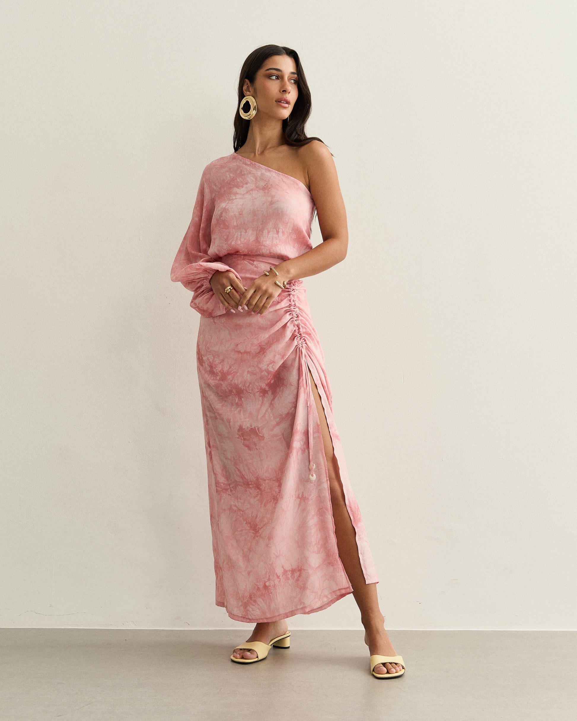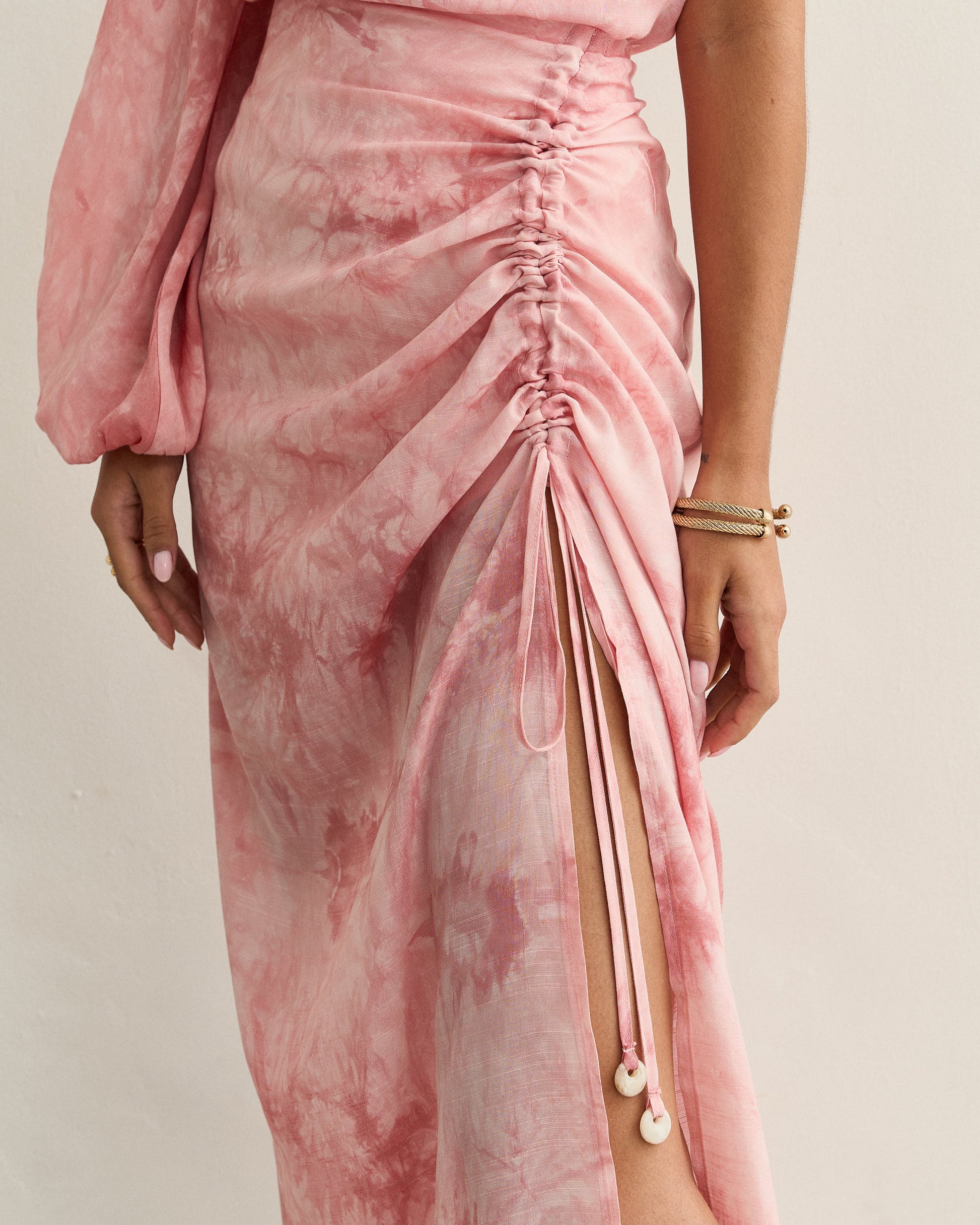Saia longa com franzido lateral e fenda ajustável, modelagem reta e acabamento delicado que valoriza o movimento com elegância.