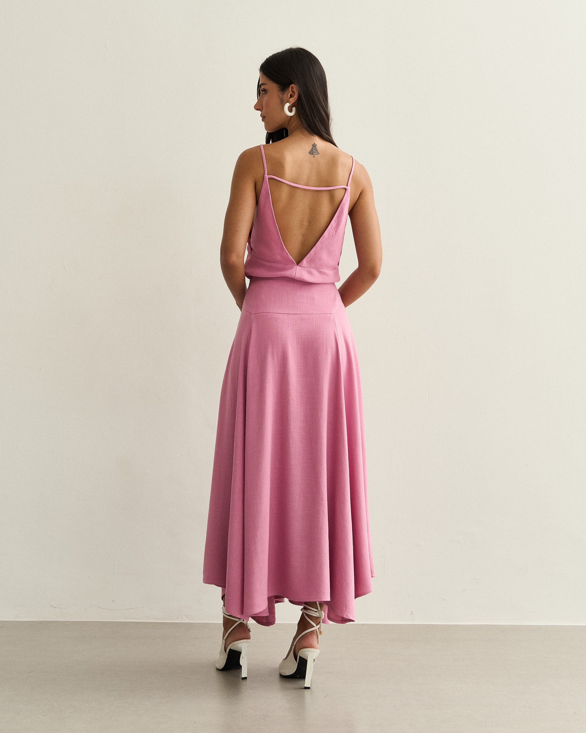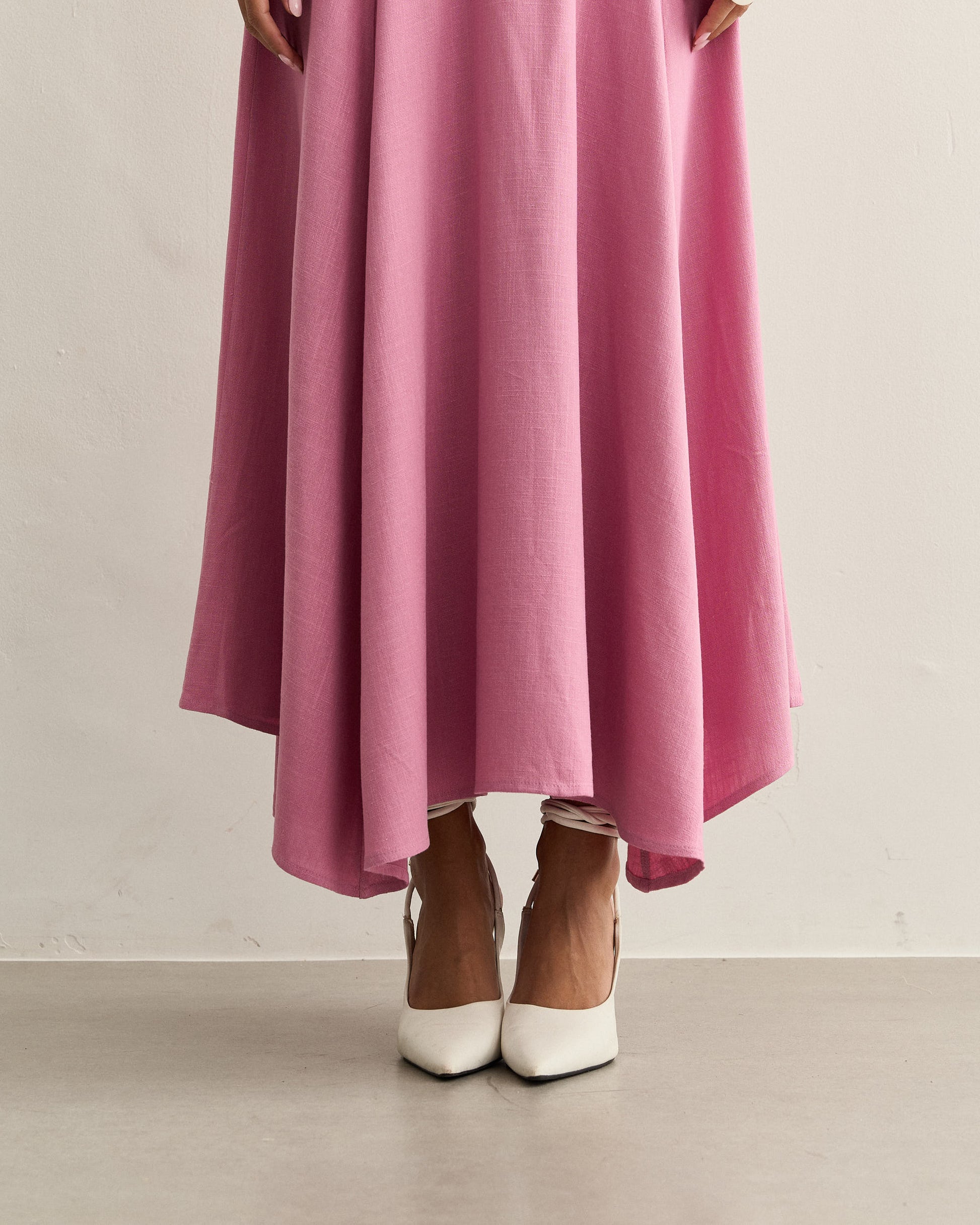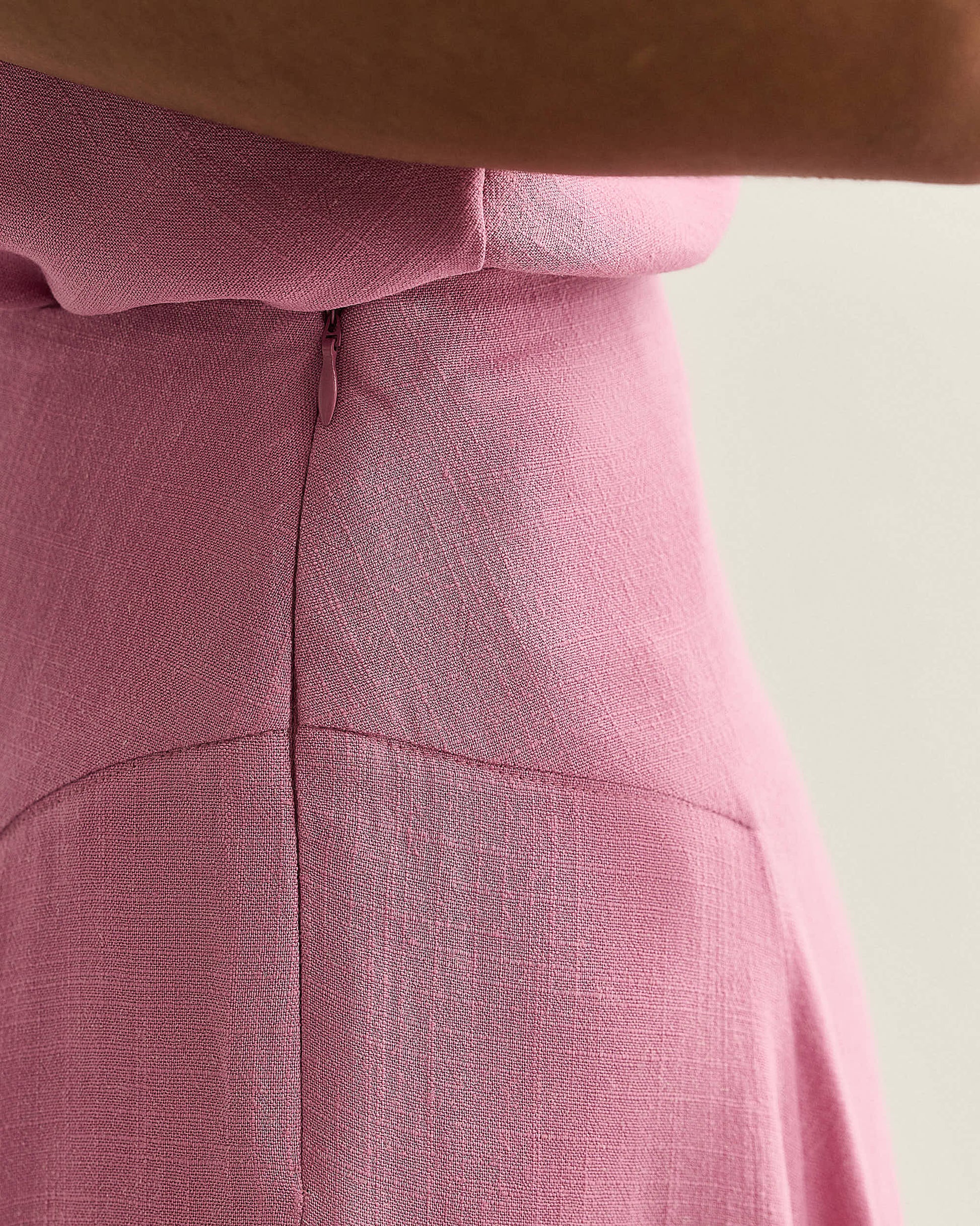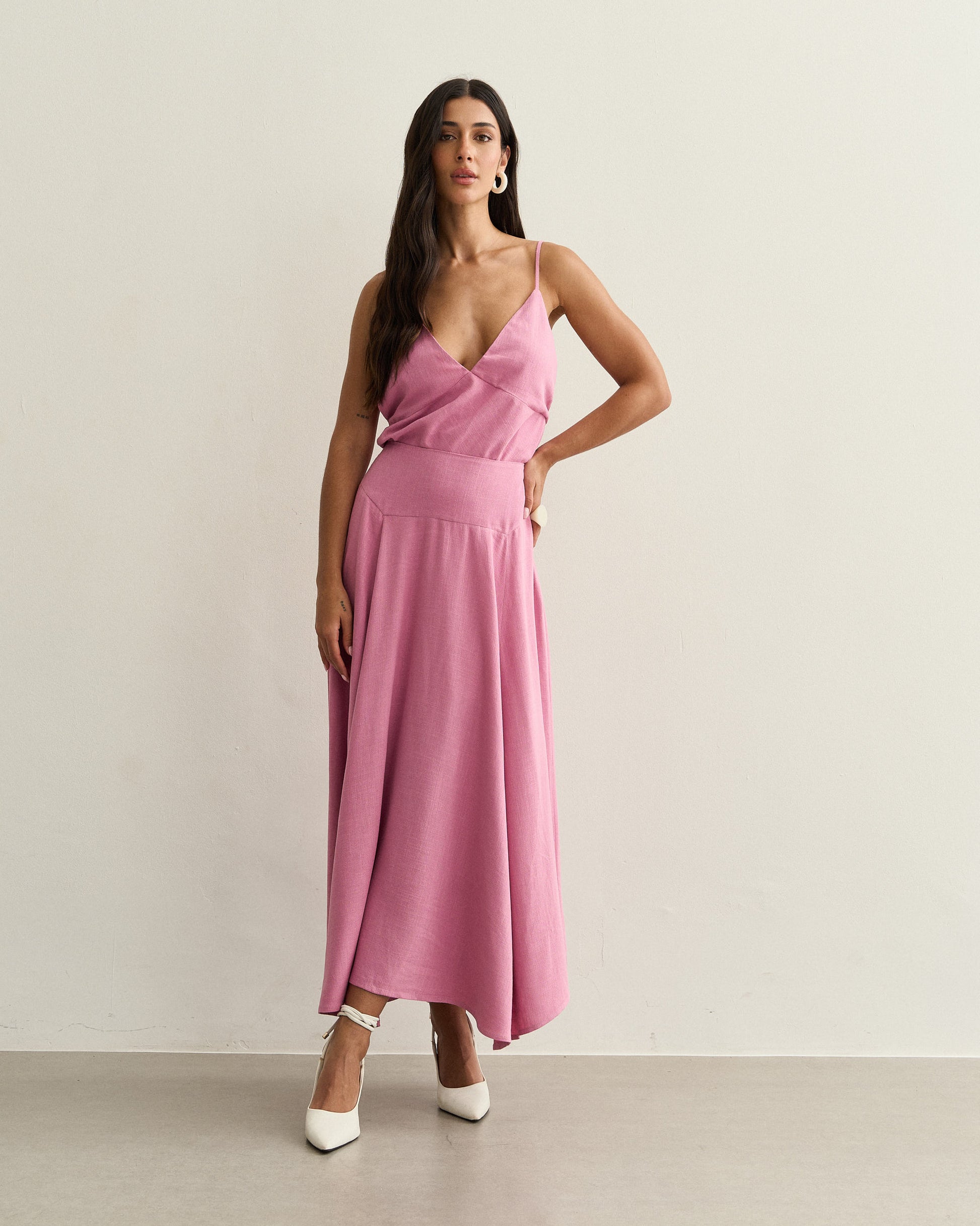Saia midi com recorte estruturado no quadril, caimento fluido e barra assimétrica. Possui zíper lateral embutido e movimento amplo.