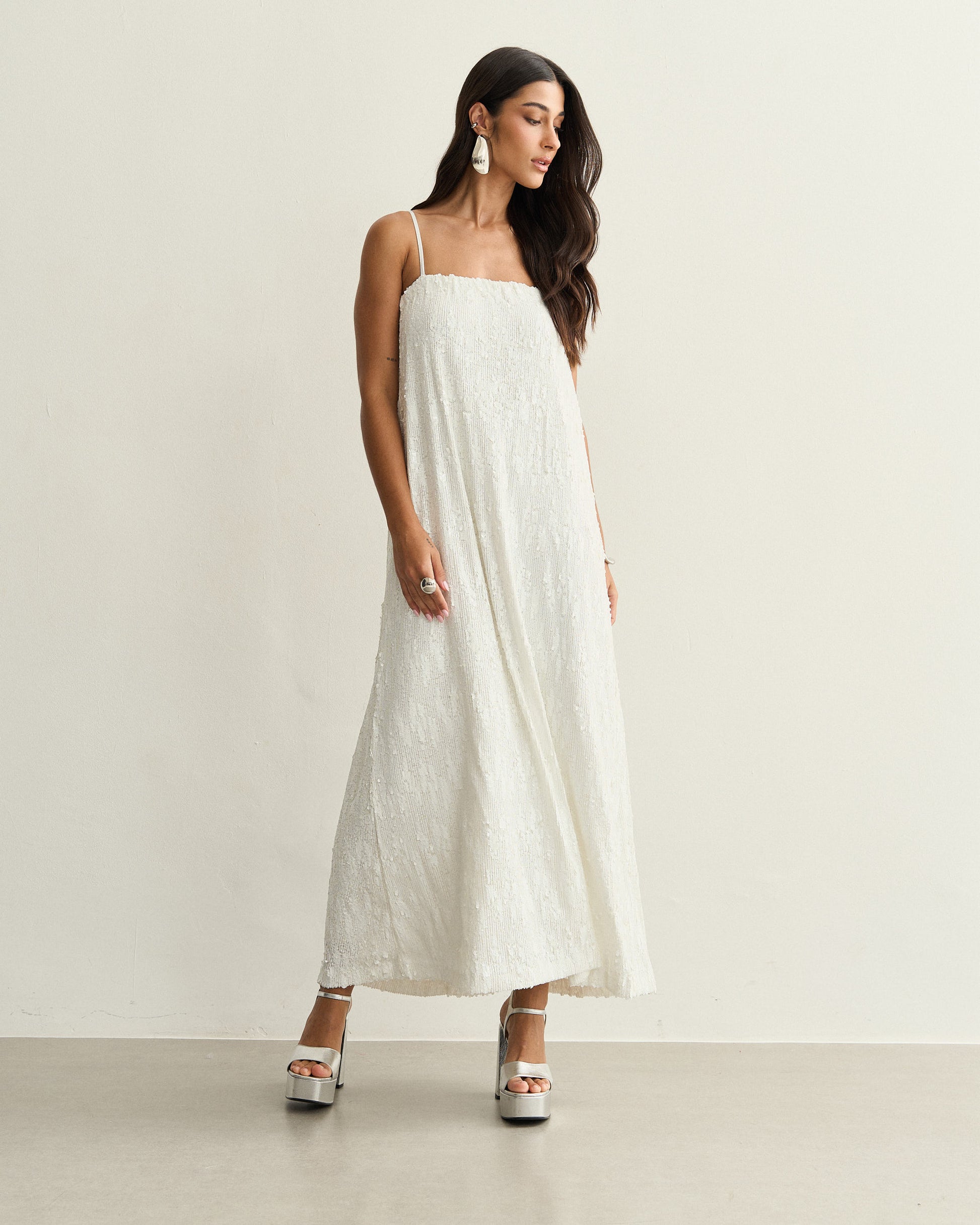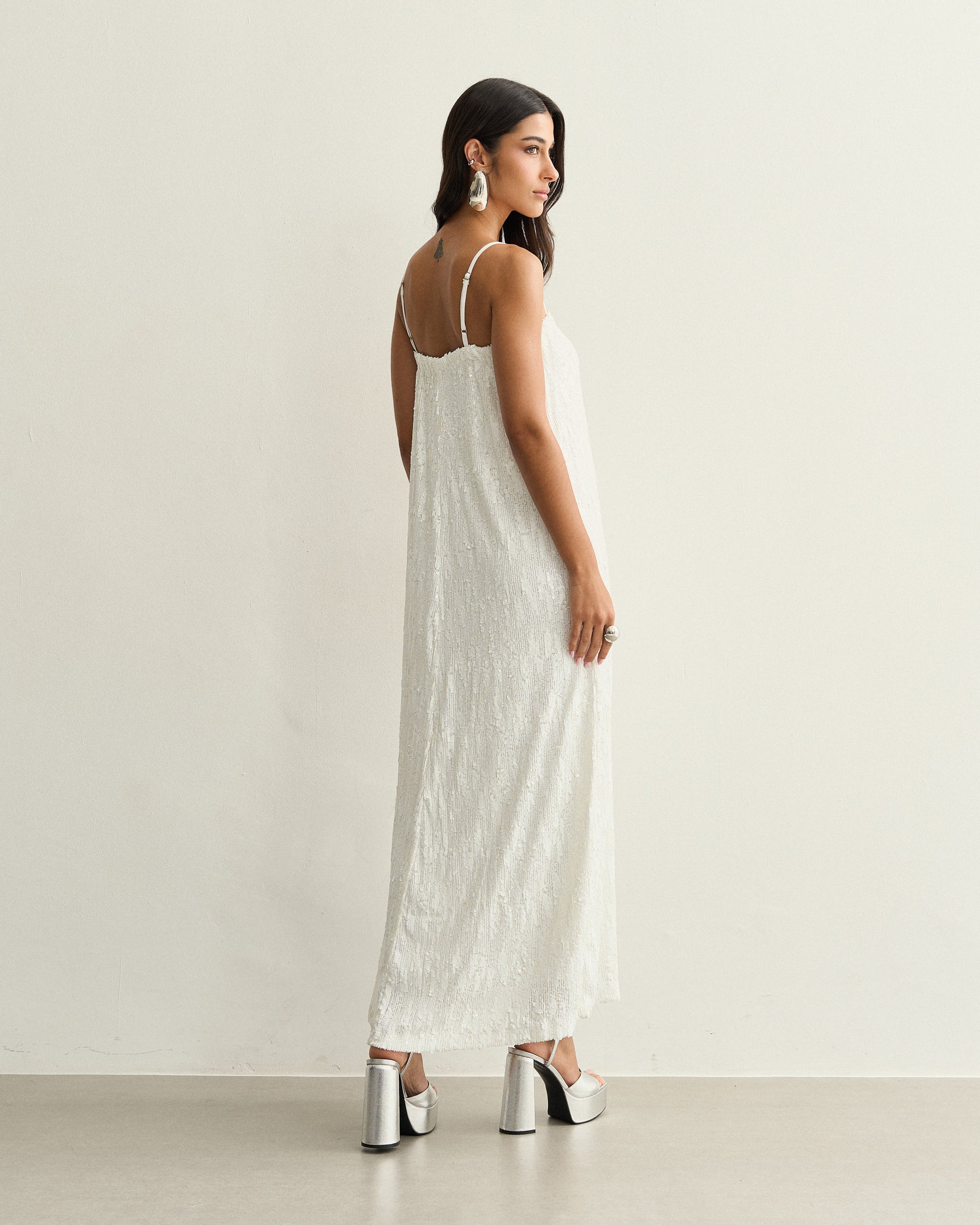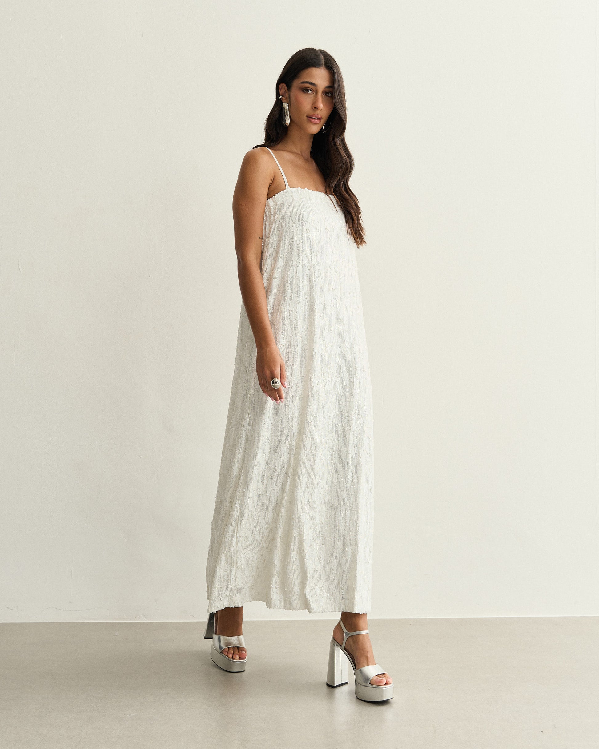 Vestido longo confeccionado em tecido com paetês aplicados, criando uma superfície texturizada de brilho uniforme. O modelo possui alças finas, decote reto e estrutura reta, com caimento suave que acompanha o movimento do corpo sem marcar. O forro interno garante conforto e estabilidade à peça.