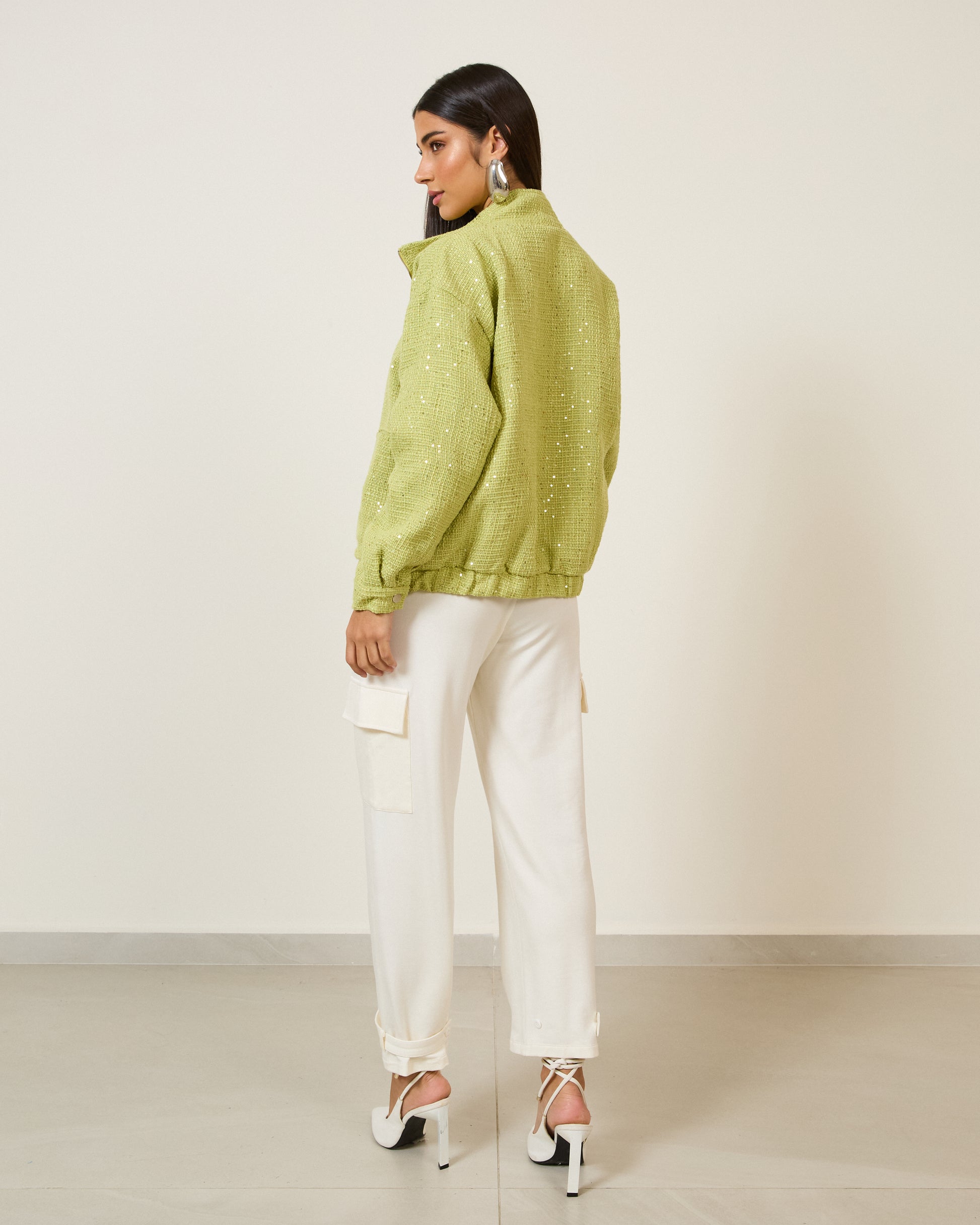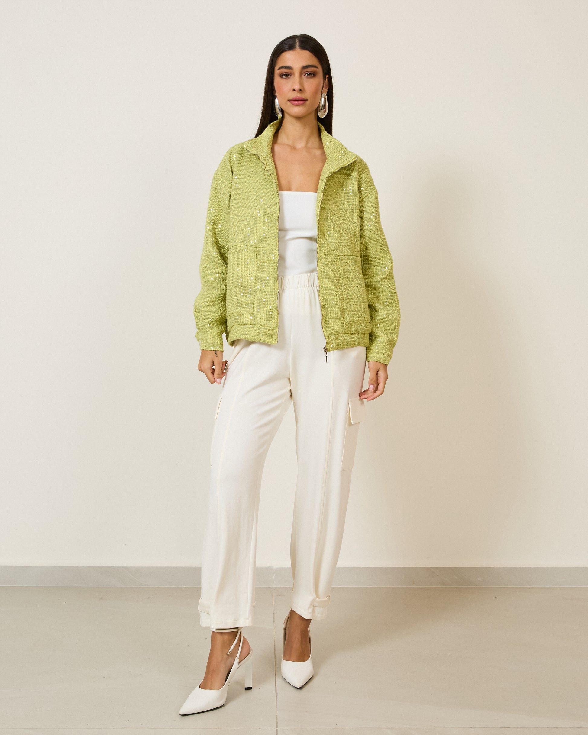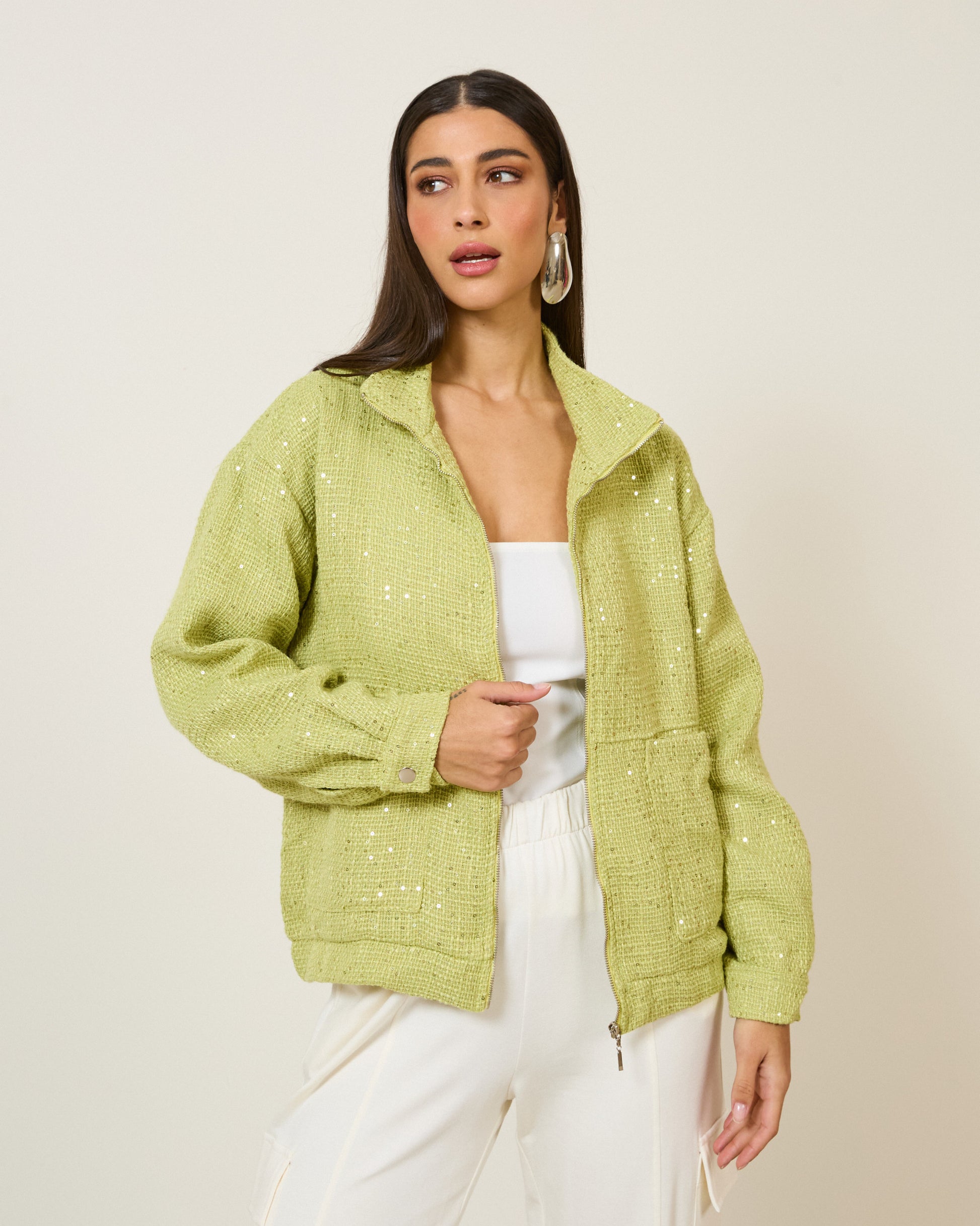 Jaqueta em tweed com paetês, gola alta, zíper frontal, bolsos aplicados e punhos com botão. Forro em acetato para conforto e caimento estruturado.