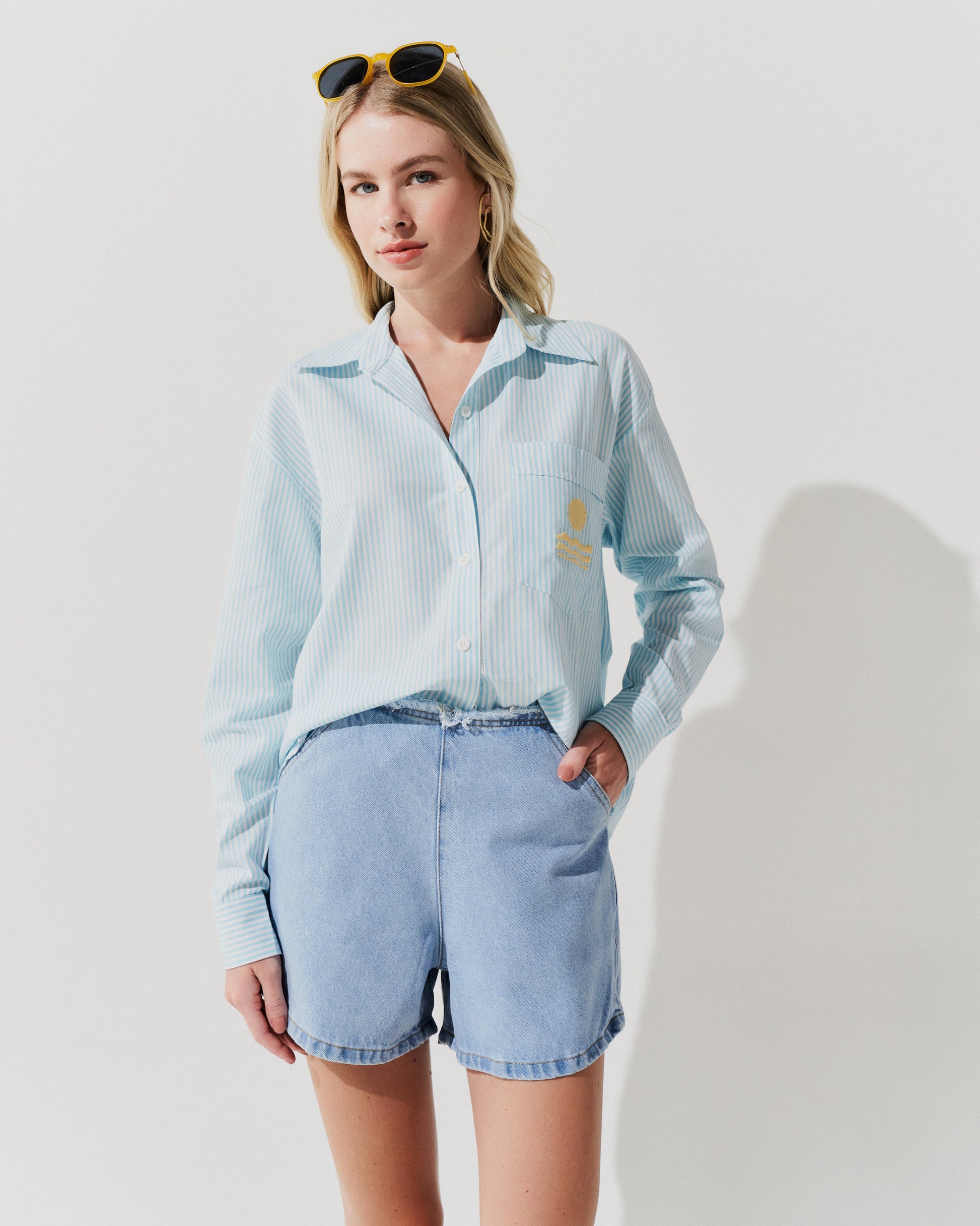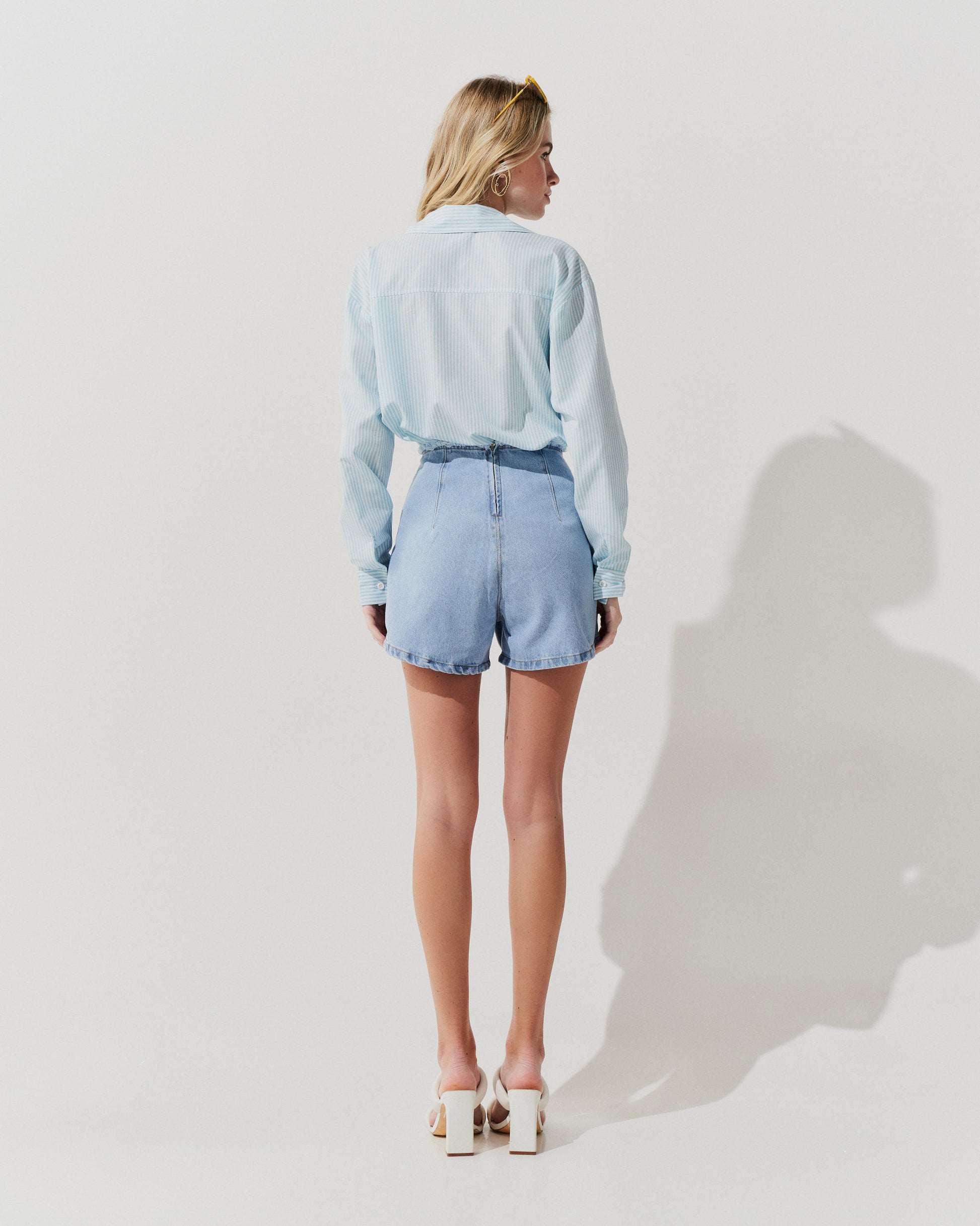 O Shorts Jeans é uma peça atemporal. Com o cós desfiado traz sofisticação e originalidade ao look, se encaixando perfeitamente em composições do dia a dia.