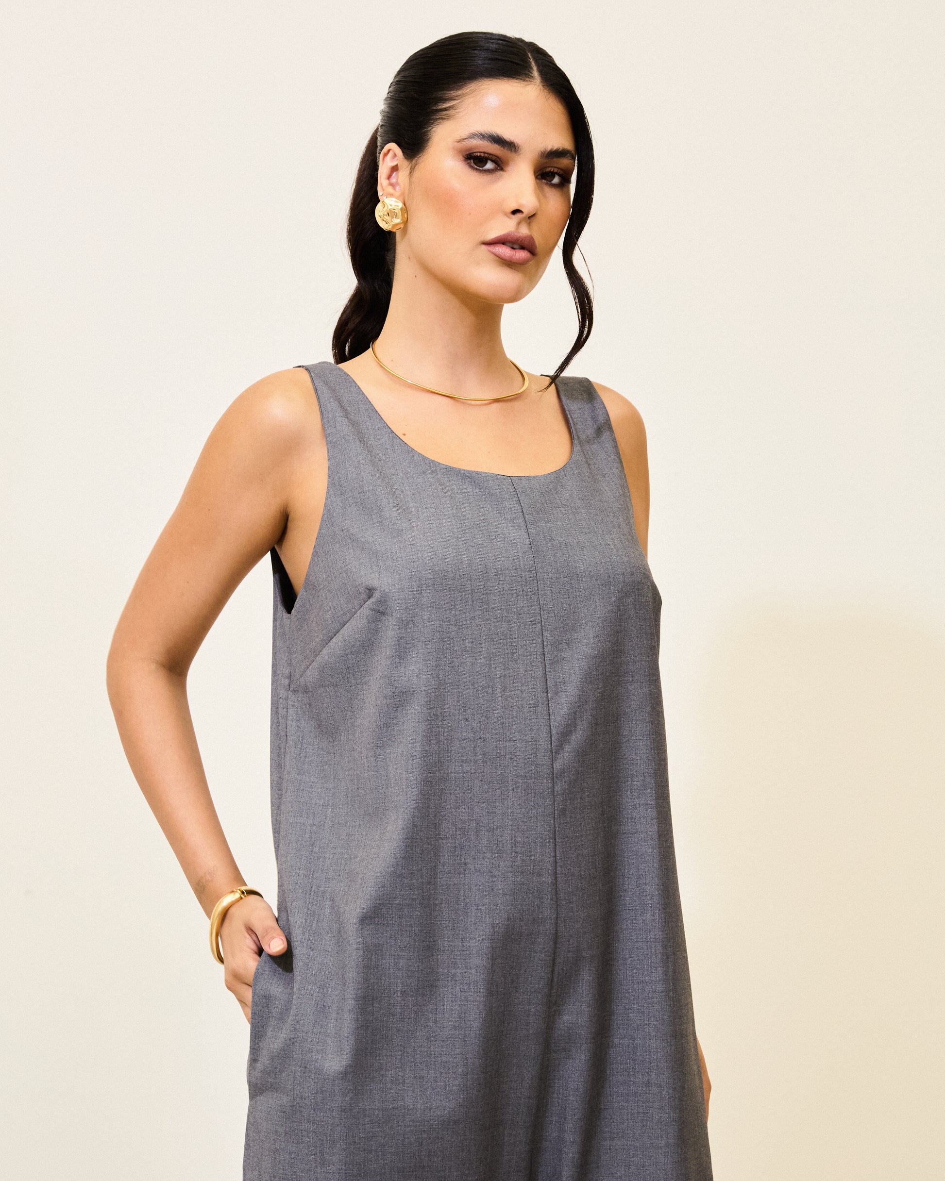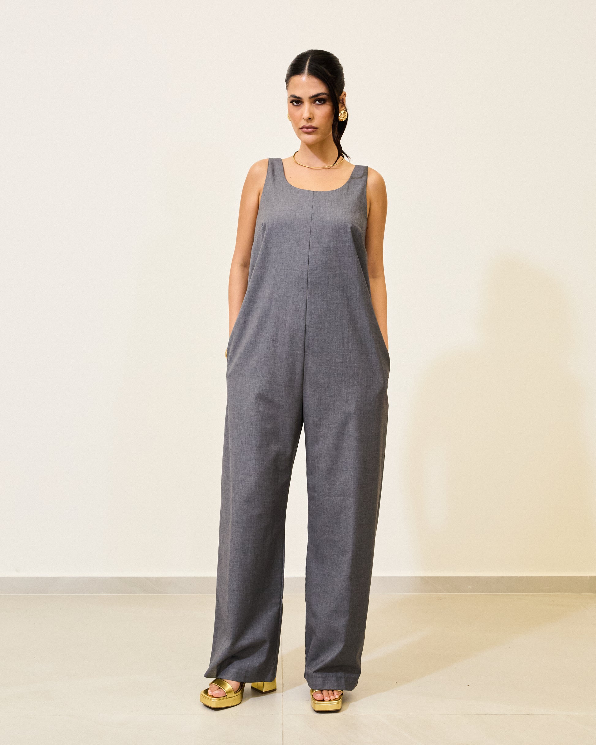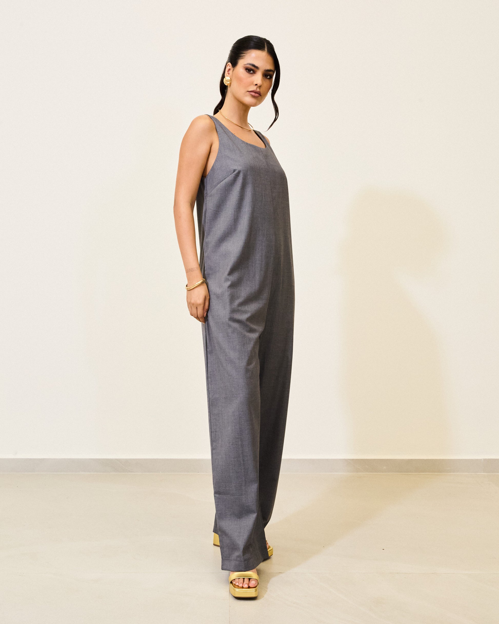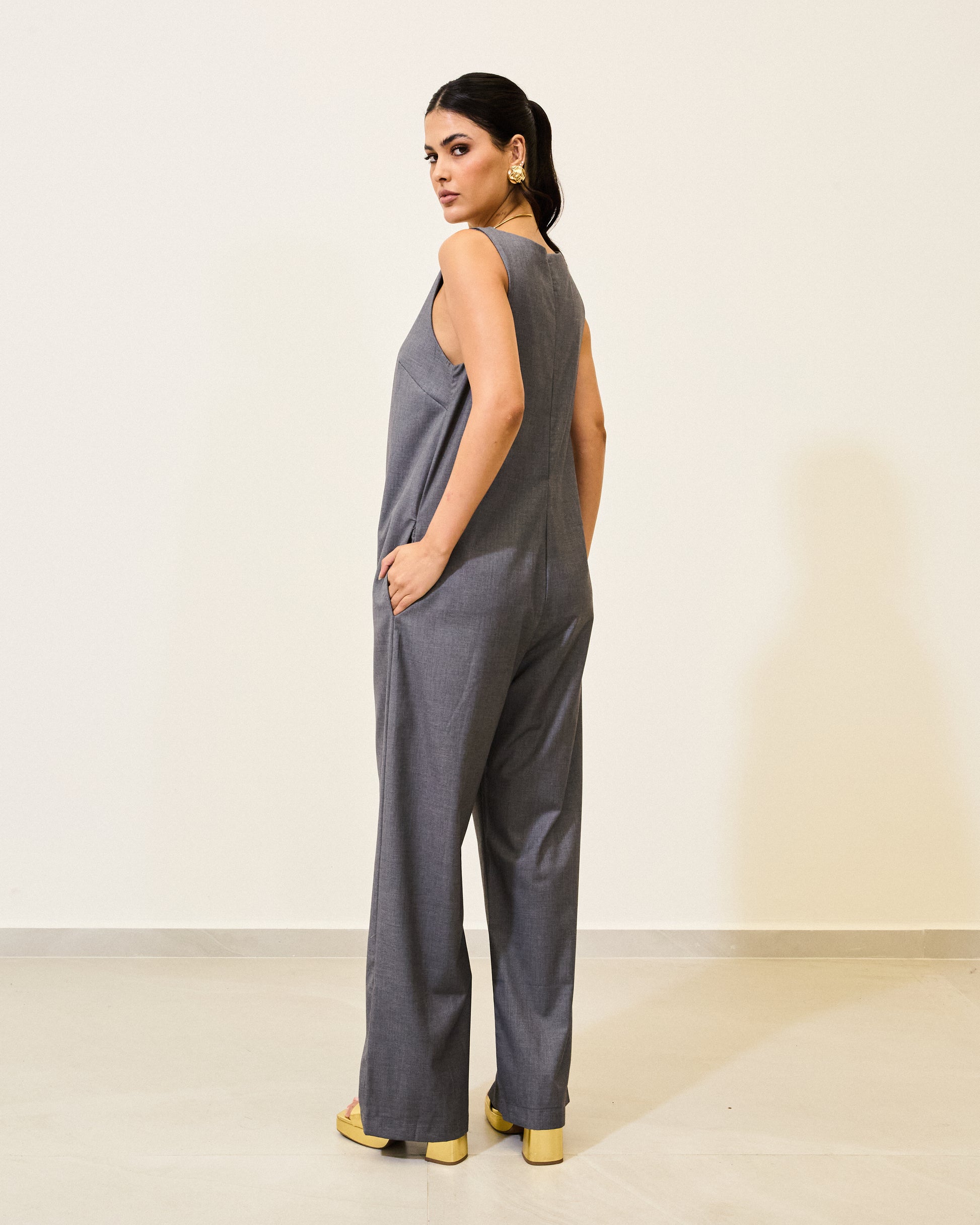 Macacão de alfaiataria confeccionado em tecido misto de poliéster e viscose com forro interno em poliéster. A peça possui modelagem ampla com pernas retas, decote U e alças largas. O recorte central frontal alonga a silhueta, enquanto o acabamento interno garante estrutura e conforto. Possui bolsos laterais embutidos e fechamento posterior por zíper invisível. Ideal para compromissos diurnos, jantares e ambientes de trabalho.