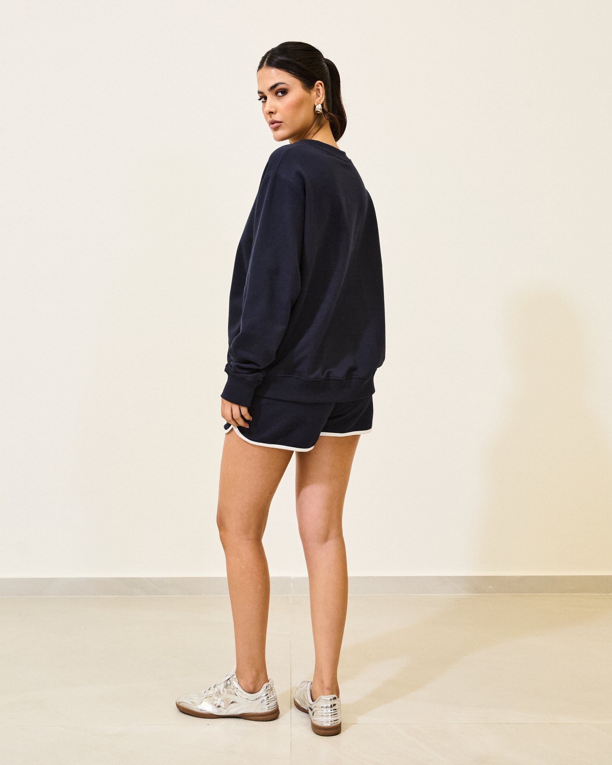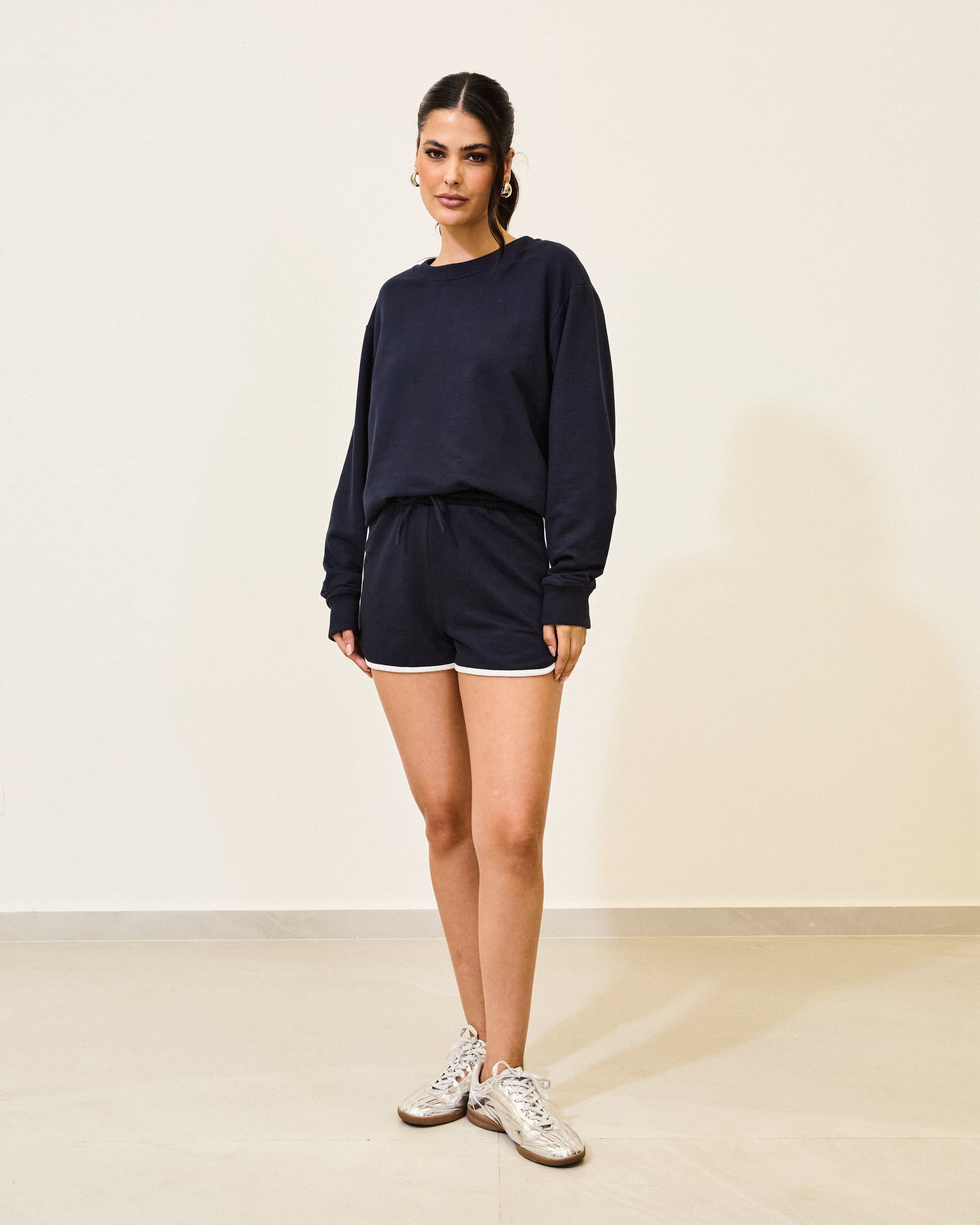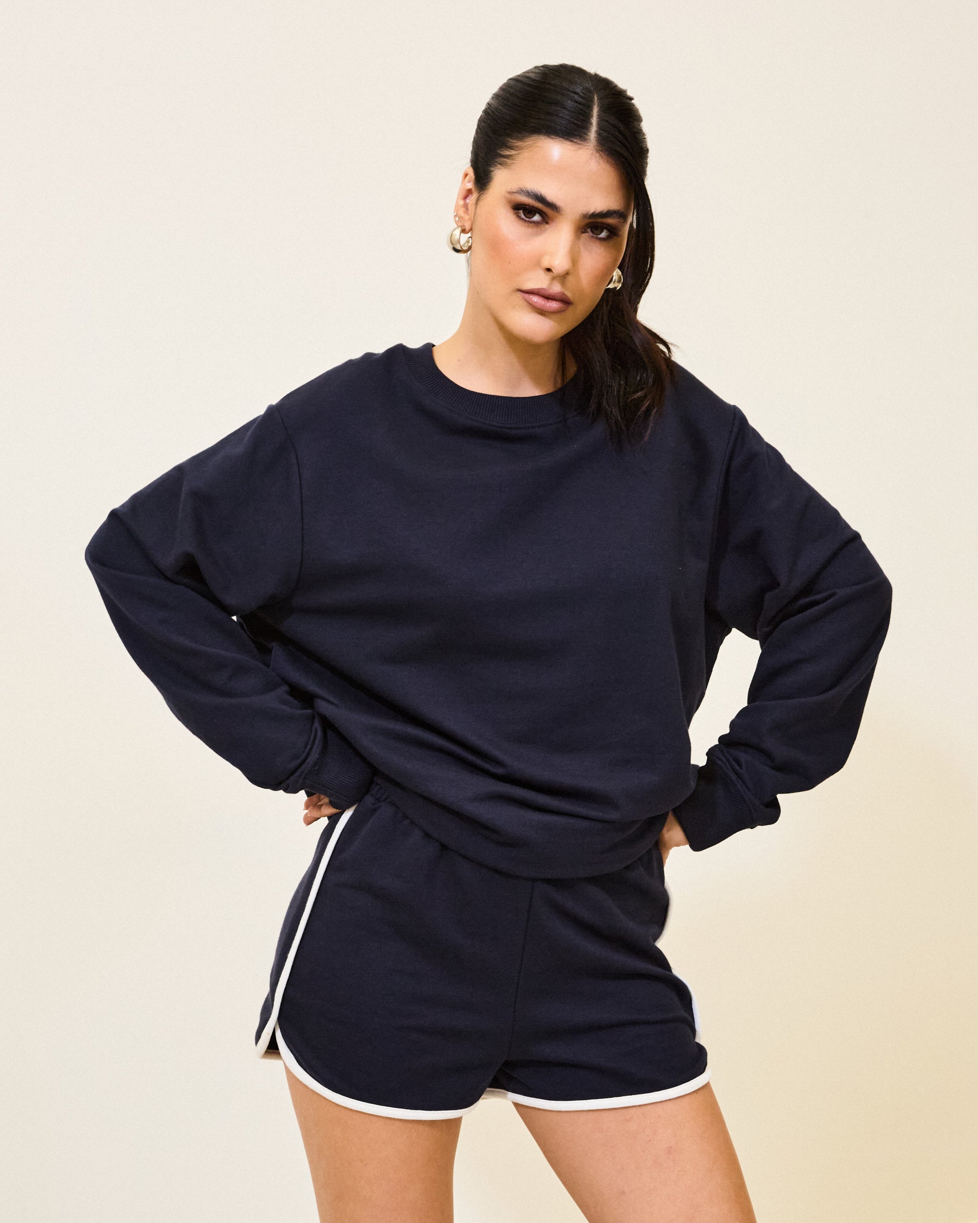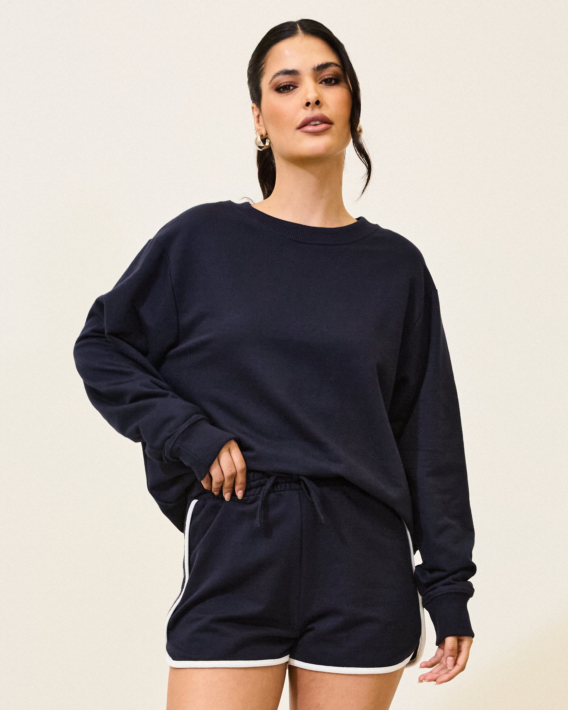Blusa de moletom com manga longa, gola careca em ribana, punhos largos e barra com costura rebatida.