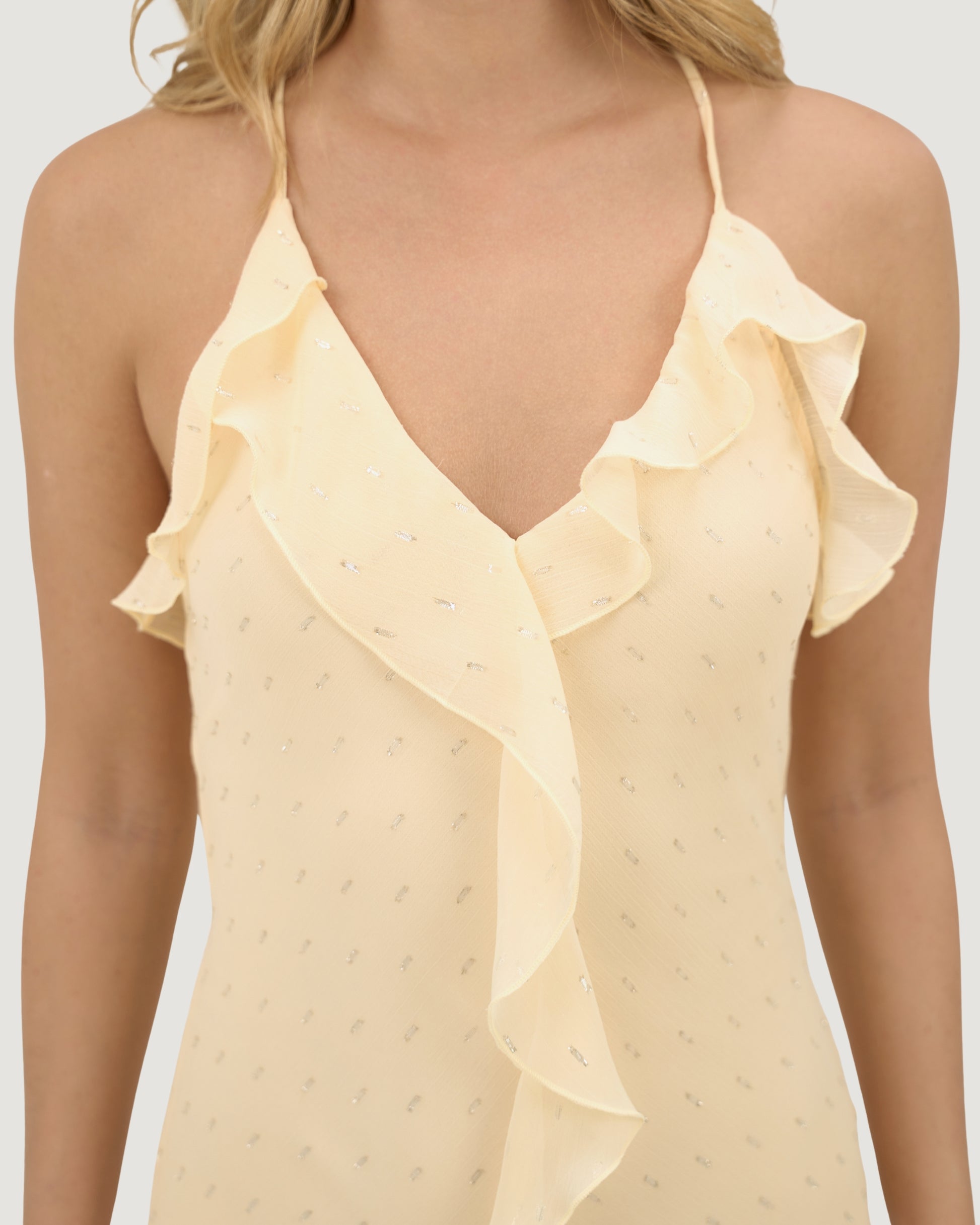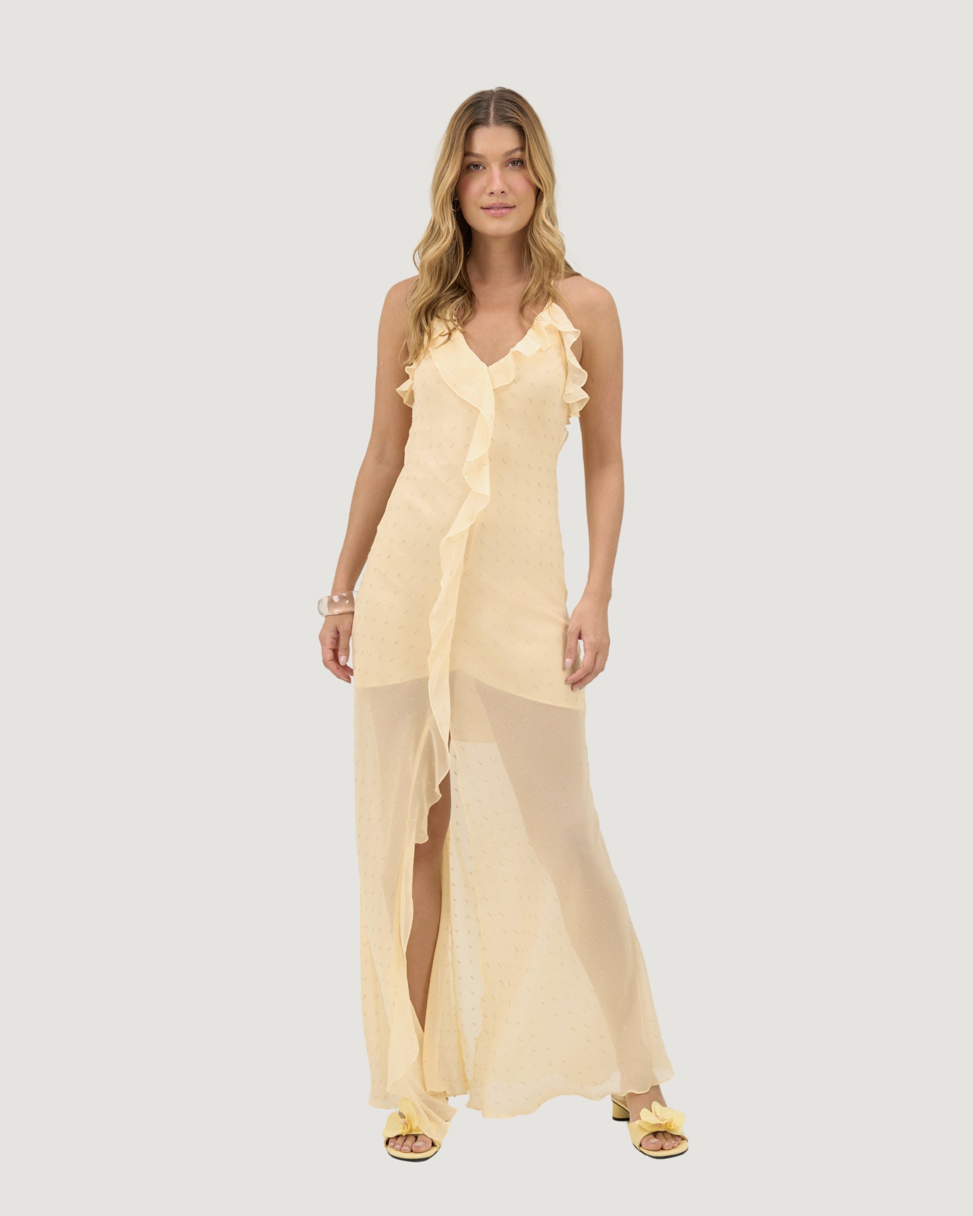 Vestido longo com decote V no busto e tecido fluido com pontos de luz em fio de lurex, criando transparência sutil e brilho delicado. A modelagem combina babados no decote e na fenda frontal que amplia o movimento ao caminhar. Nas costas, as alças finas ajustáveis por amarração, enquanto o decote em U complementa o visual com leveza. Recebe forro interno para conforto e segurança. Ideal para produções em que é necessário charme e brilho na medida certa.