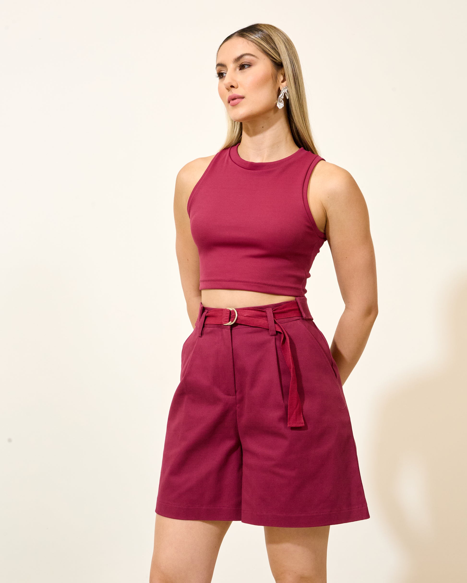 Bermuda de alfaiataria em algodão com elastano, com modelagem reta e cintura alta. A peça conta com pregas frontais, passantes largos e cinto forrado removível com fivela encapada no mesmo tecido. Possui bolsos laterais funcionais e fechamento embutido com zíper e colchete interno. Ideal para compor looks sofisticados em ambientes profissionais ou encontros casuais.