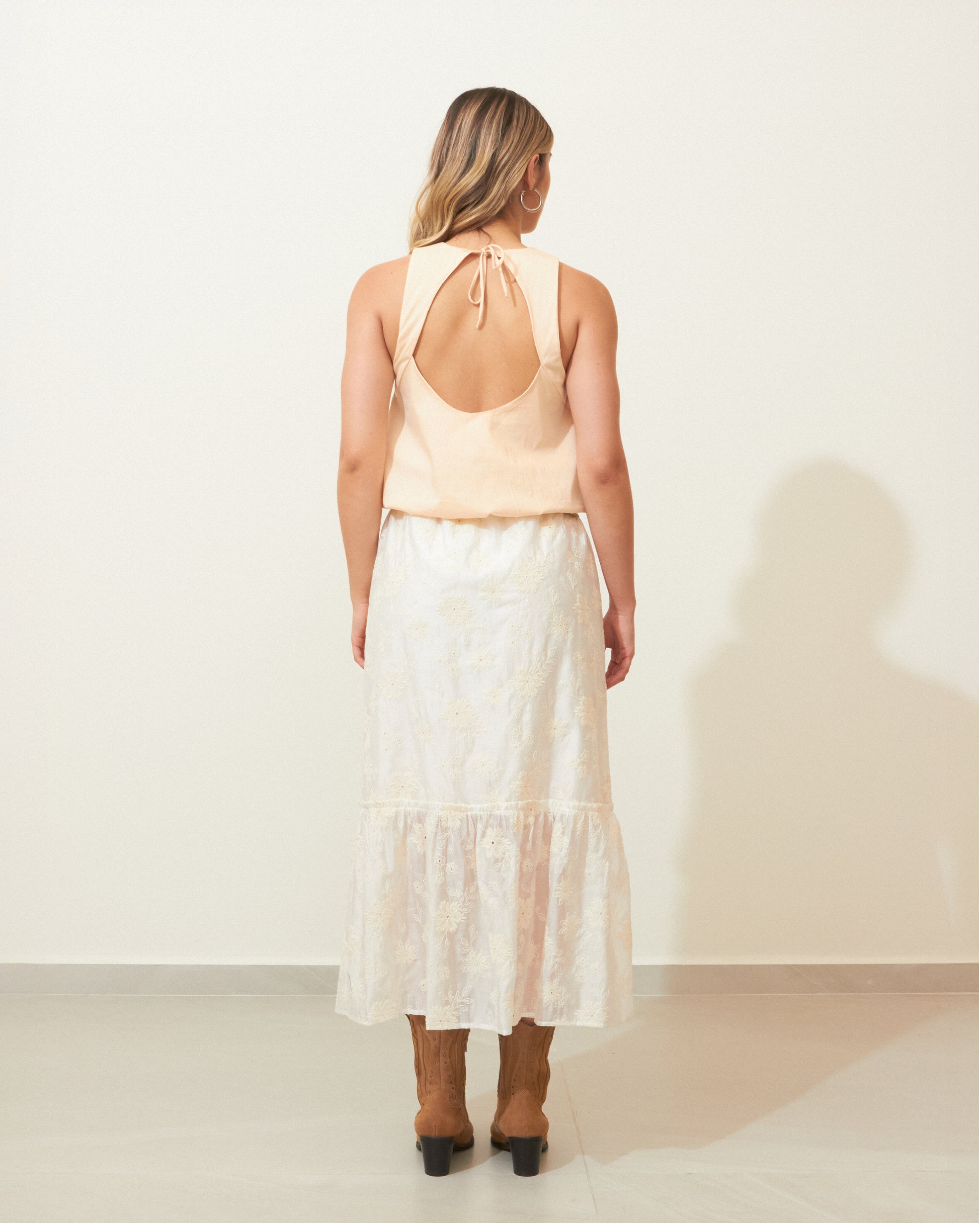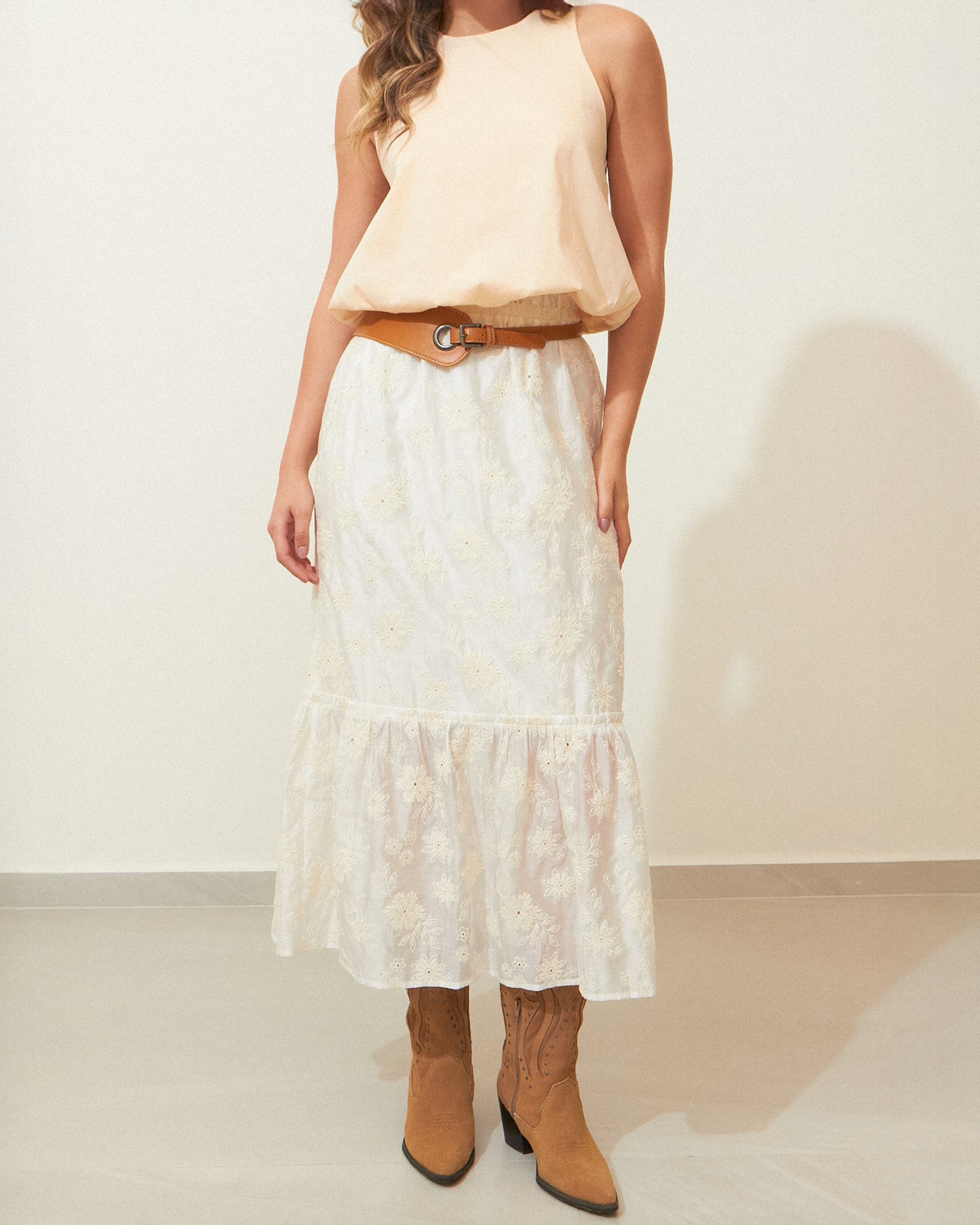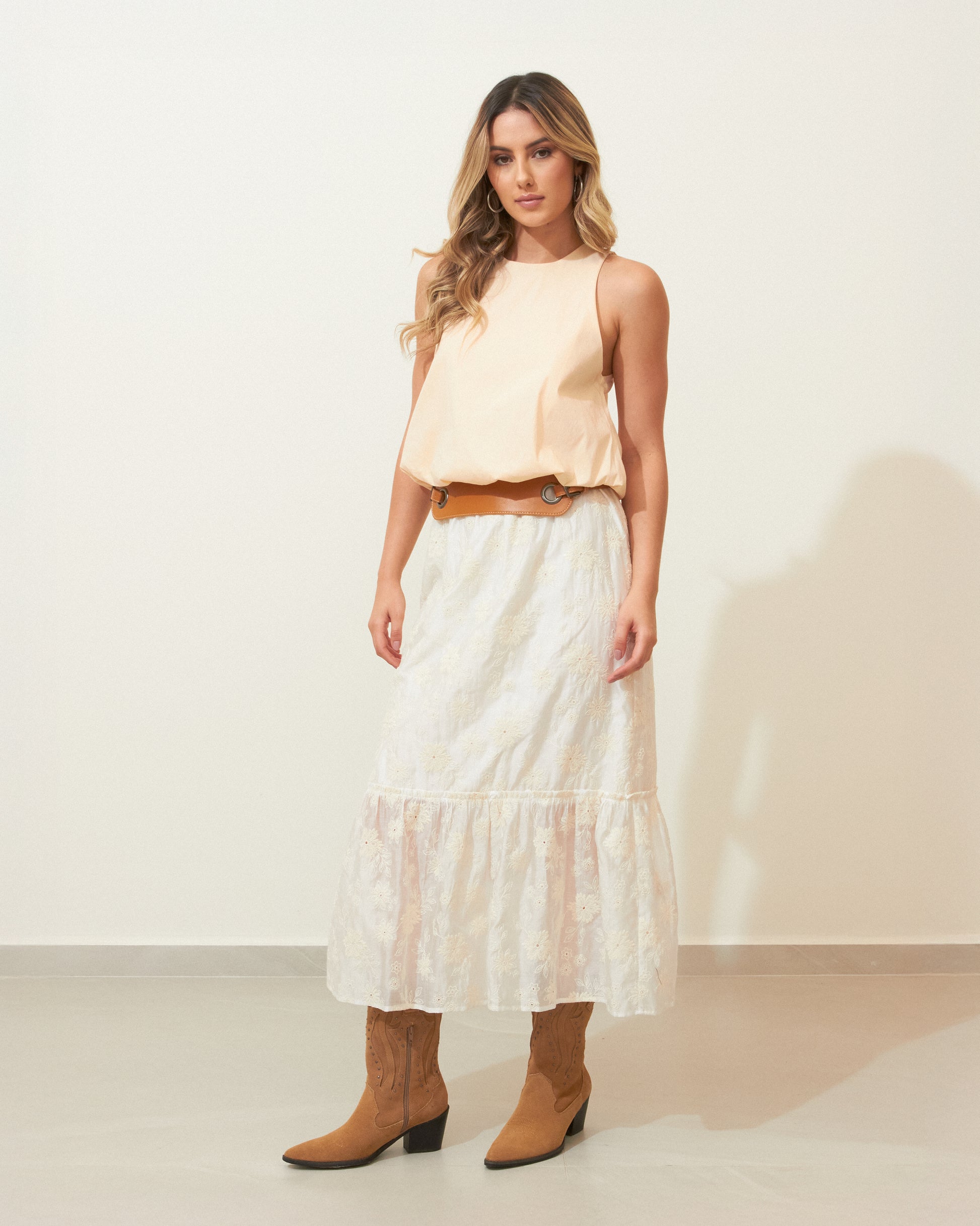 Saia Midi Kylie Off White é a escolha perfeita para quem ama um visual moderno e cheio de estilo. Com comprimento que combina elegância e versatilidade, ela ganha um toque especial com recortes estratégicos que criam movimento e um ar contemporâneo.