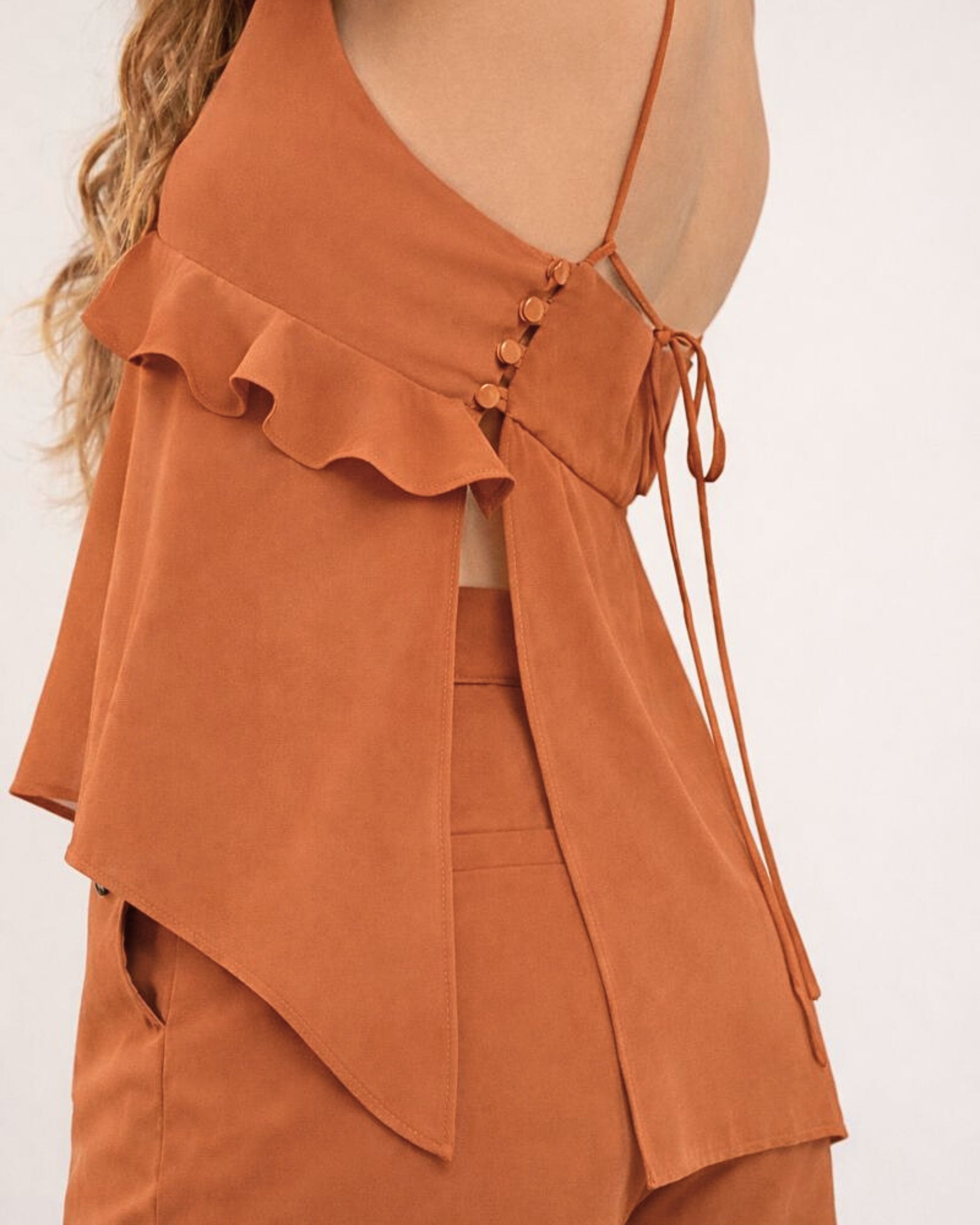 Regata de alças finas com decote em V, babados aplicados, botões forrados laterais e amarração nas costas. Modelagem levemente evasê com barra assimétrica.