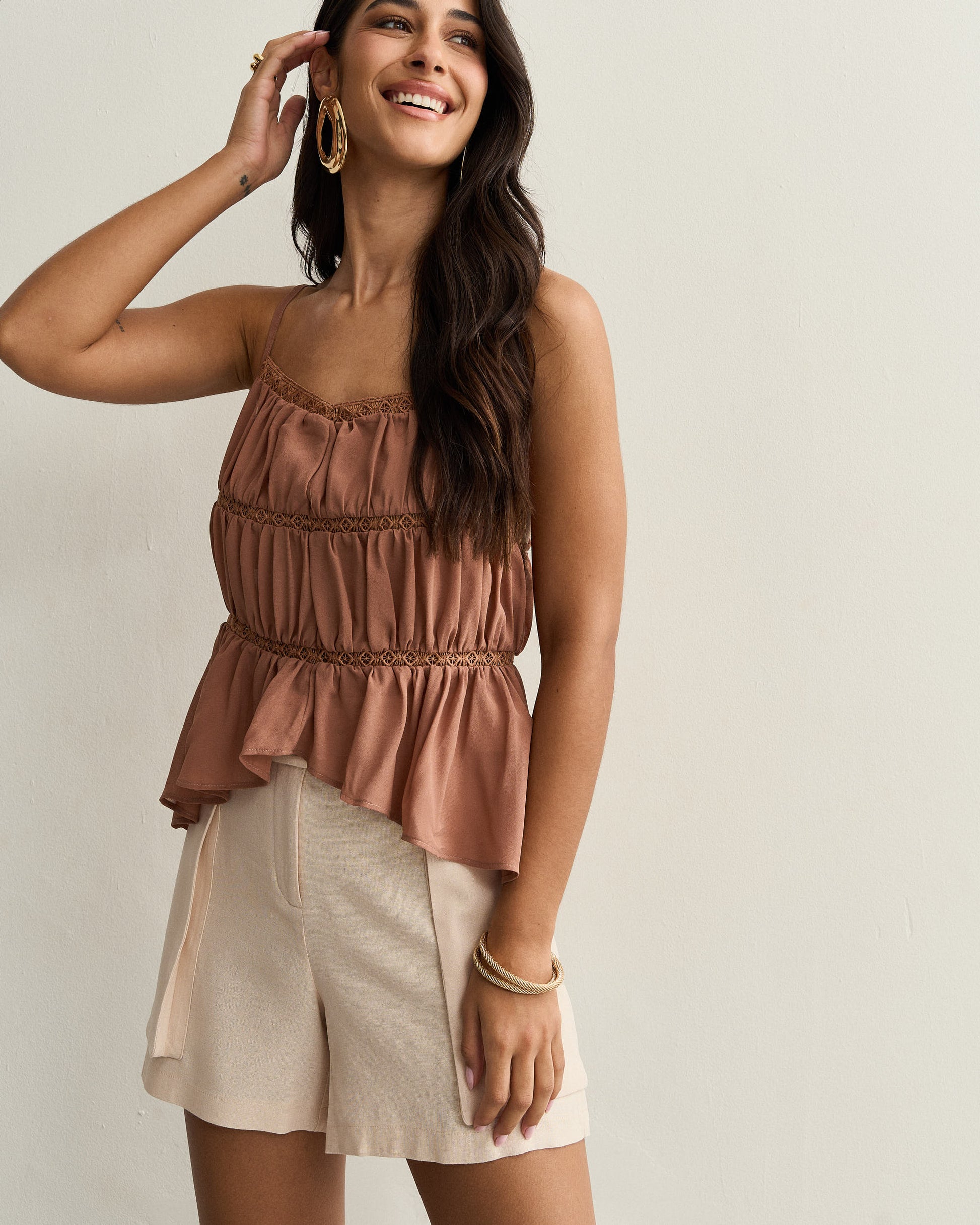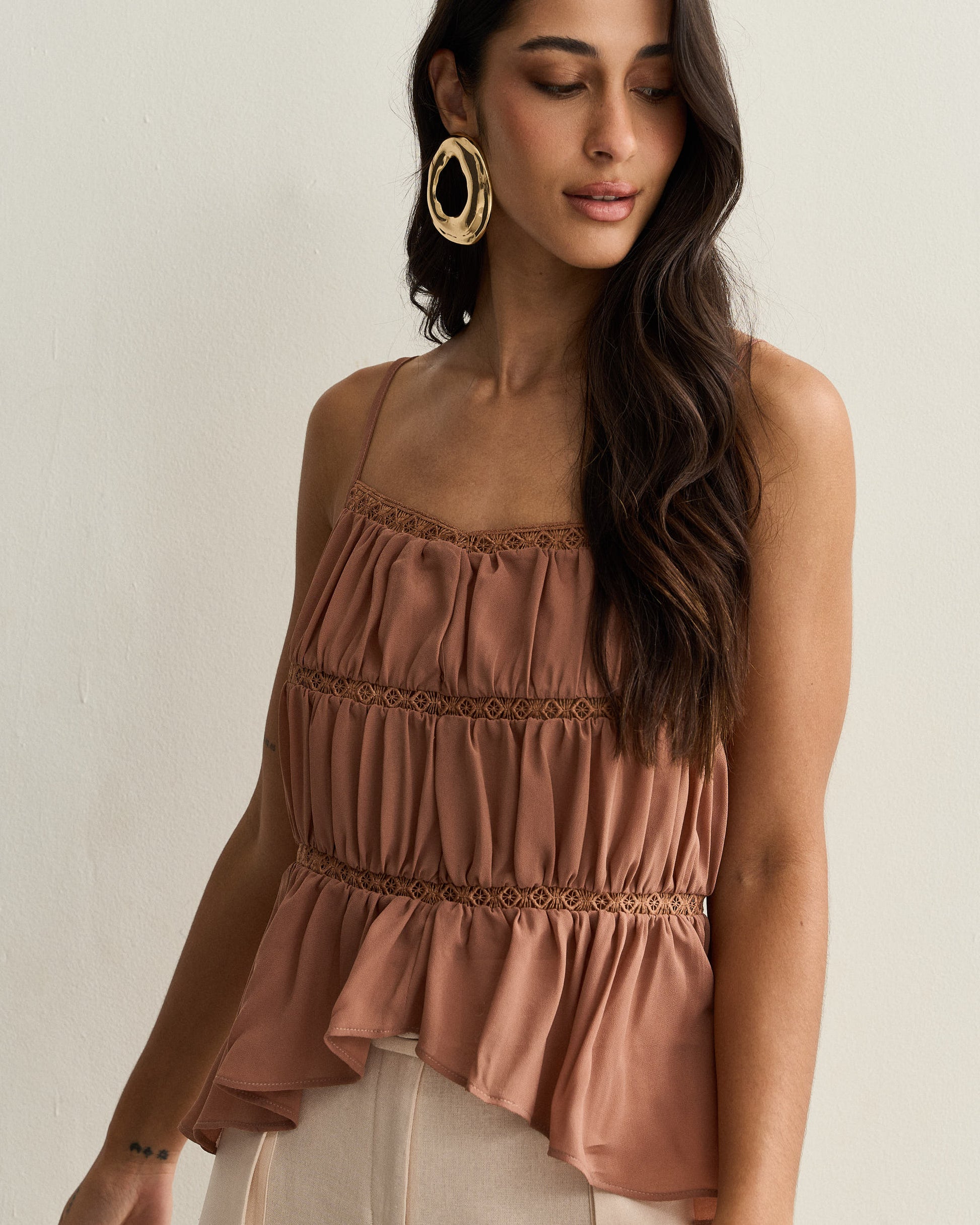 Regata confeccionada em tecido leve e fluido, com recortes no estilo três marias e delicadas faixas de renda entre as camadas. Possui forro interno que garante conforto e melhor acabamento, além de alças finas com regulagem para ajuste ideal ao corpo. O barrado levemente evasê traz movimento e um toque delicado à peça, perfeita para composições elegantes em dias quentes ou produções casuais com charme.