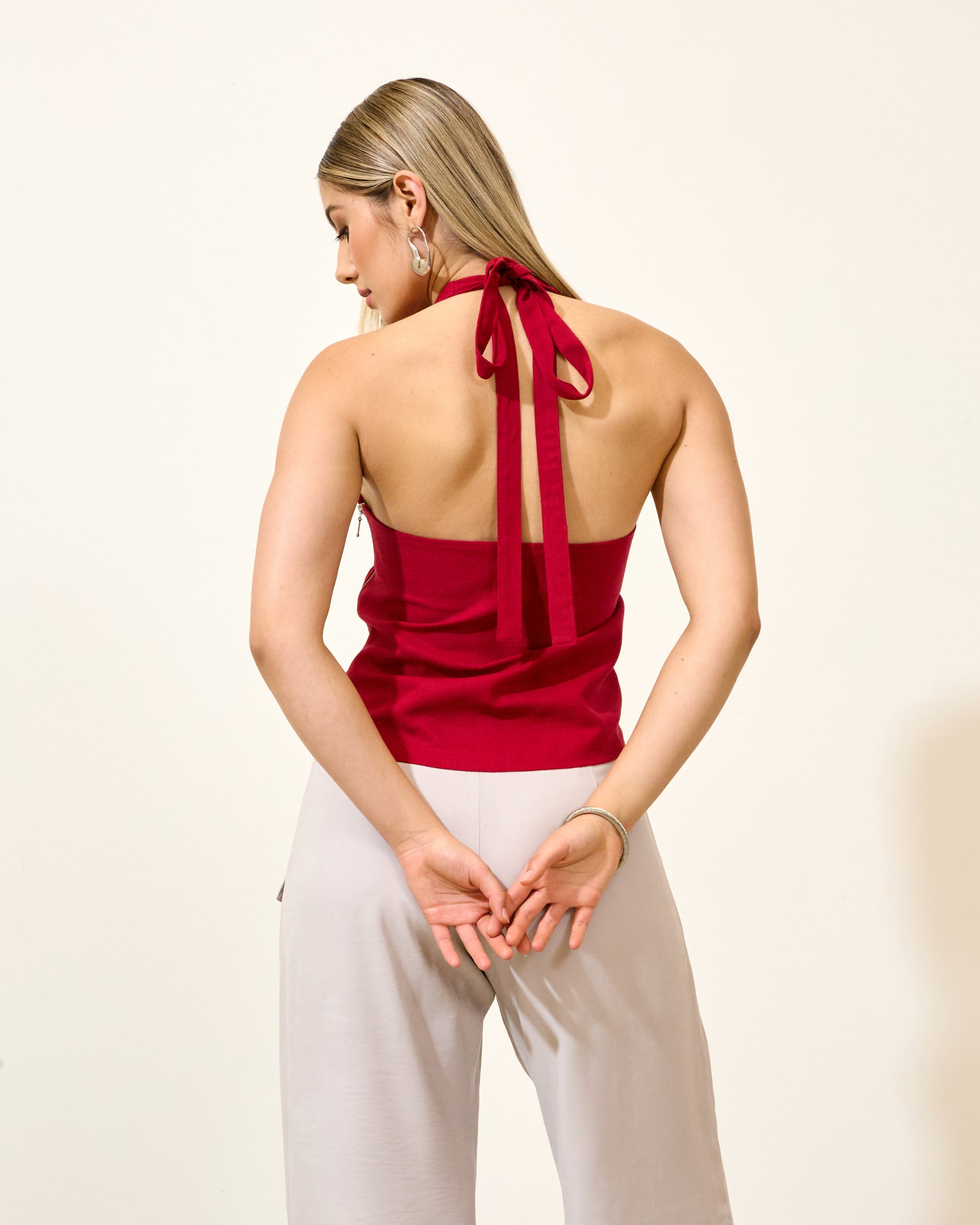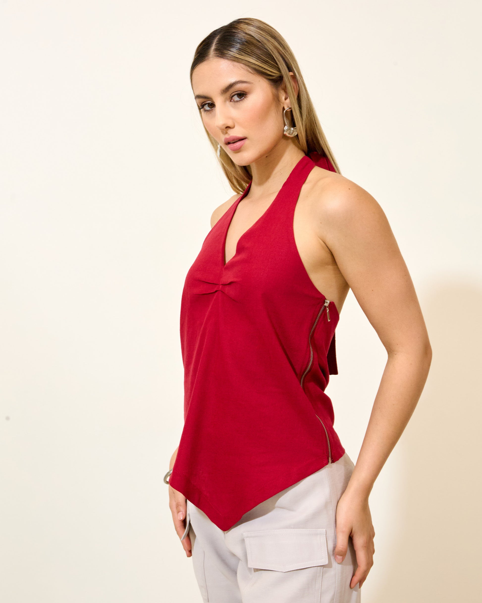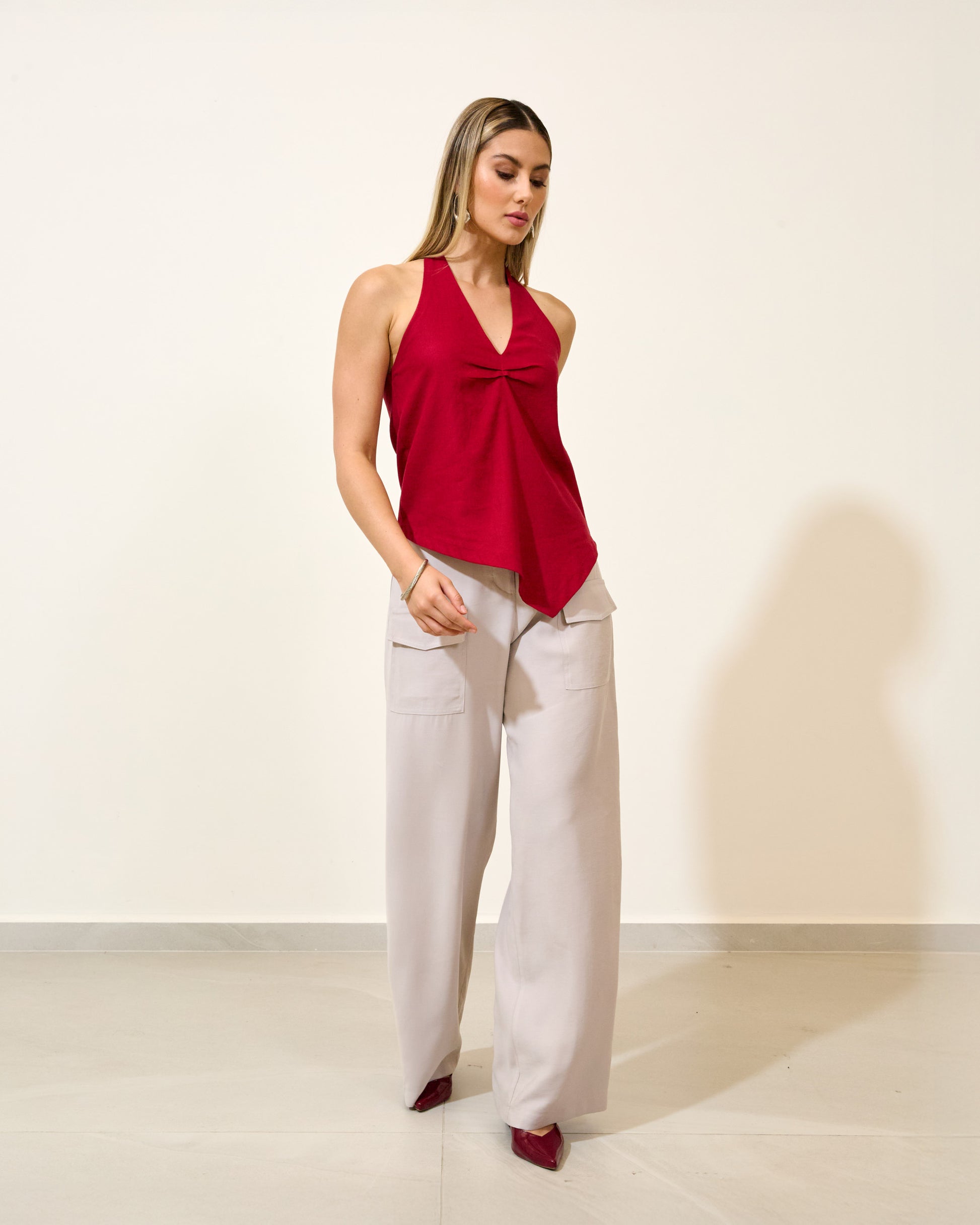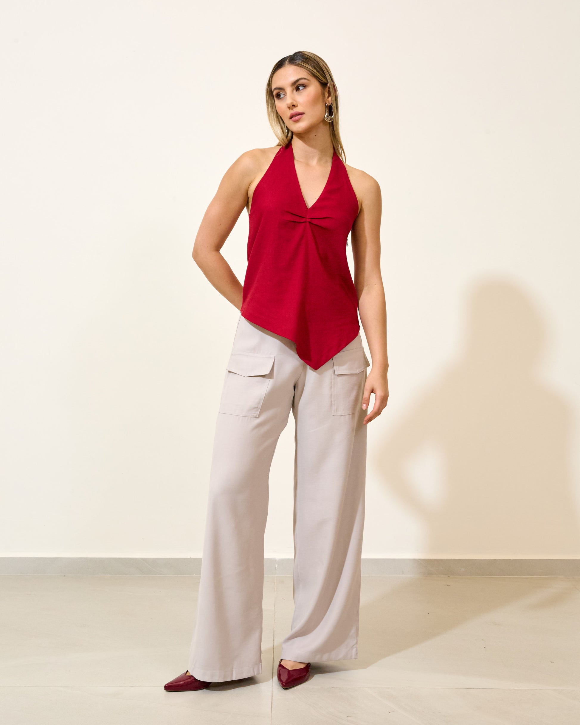 Regata frente única em linho misto com leve franzido no busto e modelagem solta ao corpo, barra frontal assimétrica e zíper metálico na lateral. Confeccionada em tecido com 70% viscose e 30% linho, possui forro interno 100% poliéster. Ideal para eventos diurnos, encontros casuais ou produções mais elegantes com leveza.