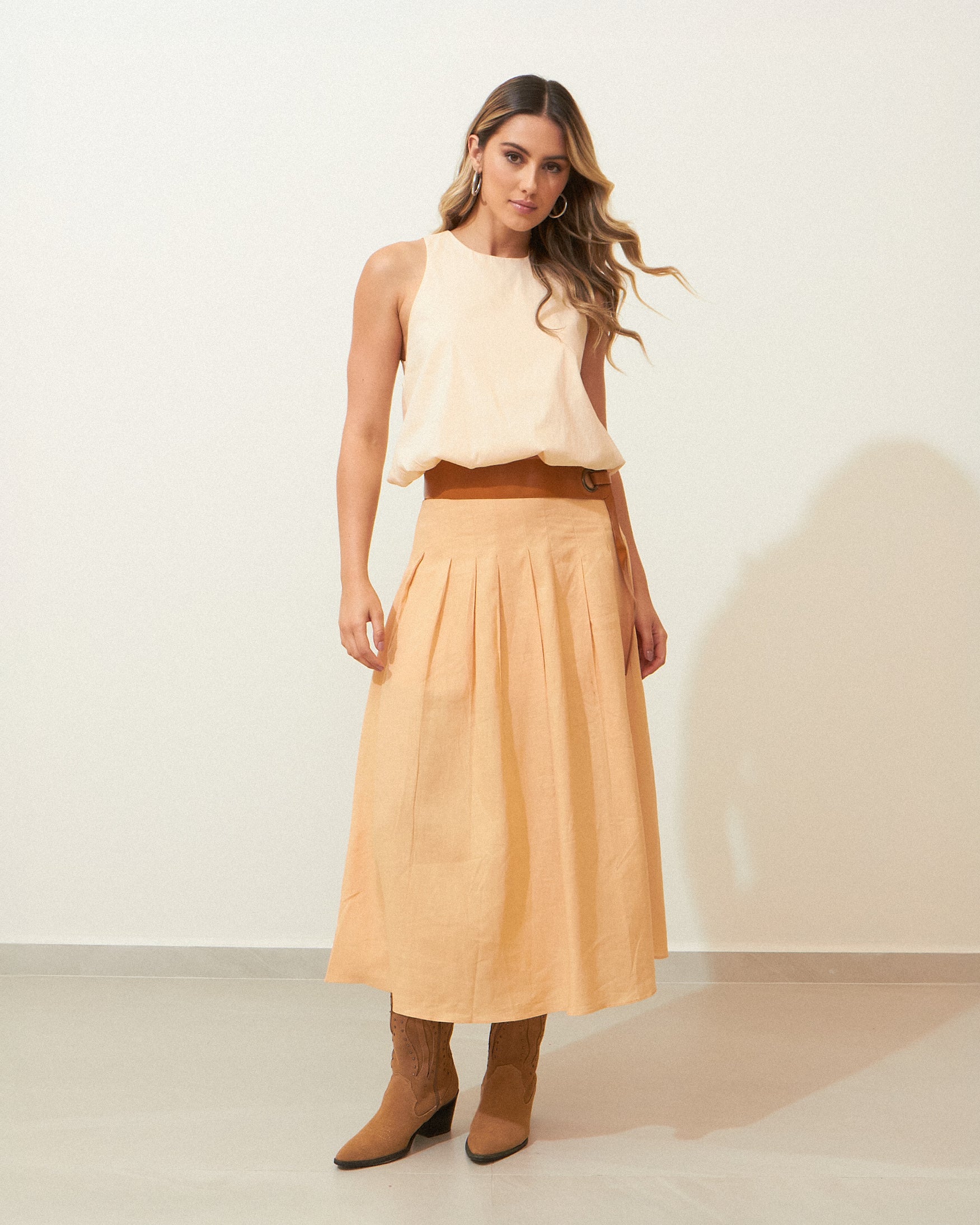 A Saia Midi com Pregas é a escolha perfeita para quem ama um visual moderno e cheio de estilo. Com comprimento que combina elegância e versatilidade, ela ganha um toque especial com recortes estratégicos que criam movimento e um ar contemporâneo. Ideal para compor looks despojados ou mais sofisticados.