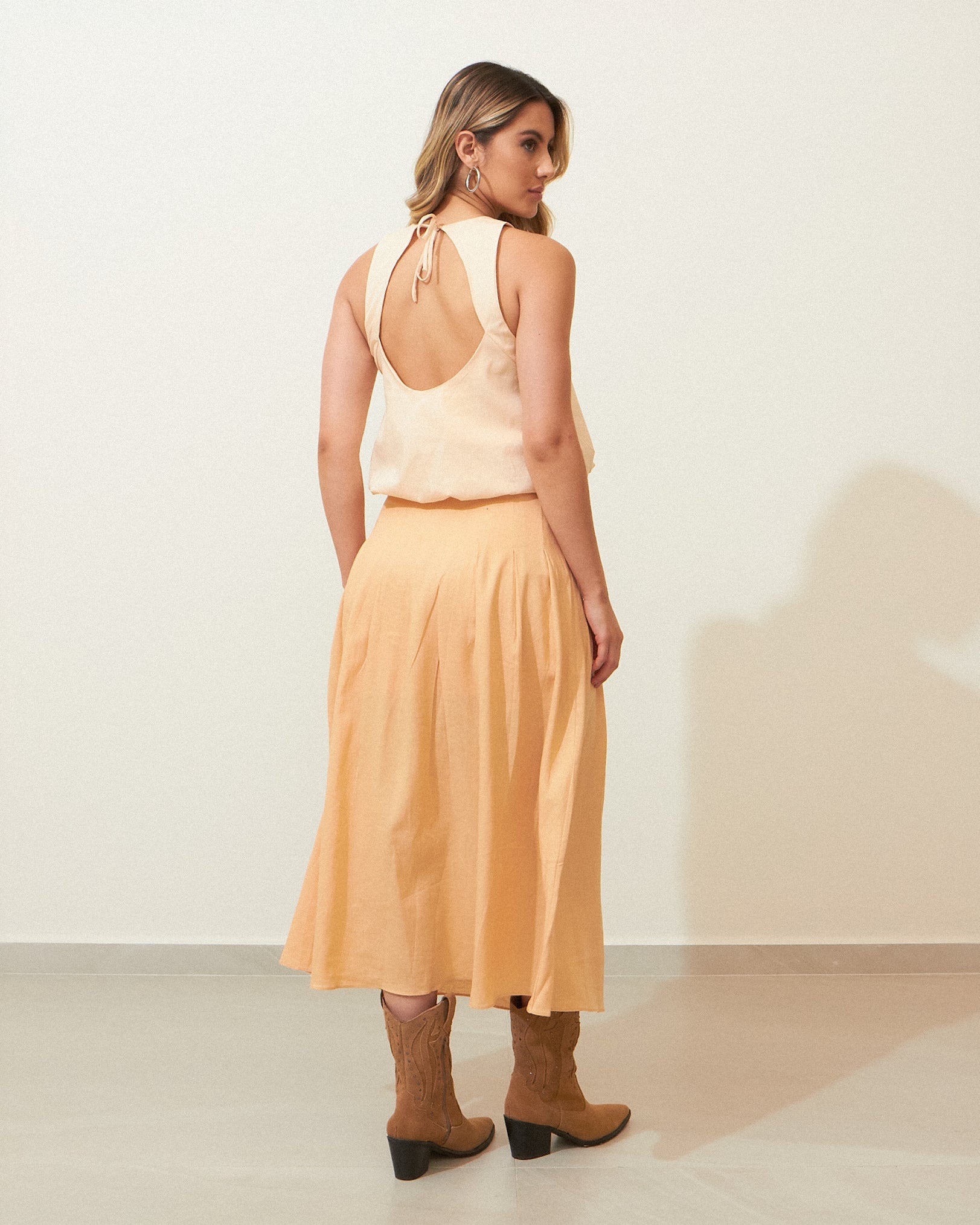 A Saia Midi com Pregas é a escolha perfeita para quem ama um visual moderno e cheio de estilo. Com comprimento que combina elegância e versatilidade, ela ganha um toque especial com recortes estratégicos que criam movimento e um ar contemporâneo.