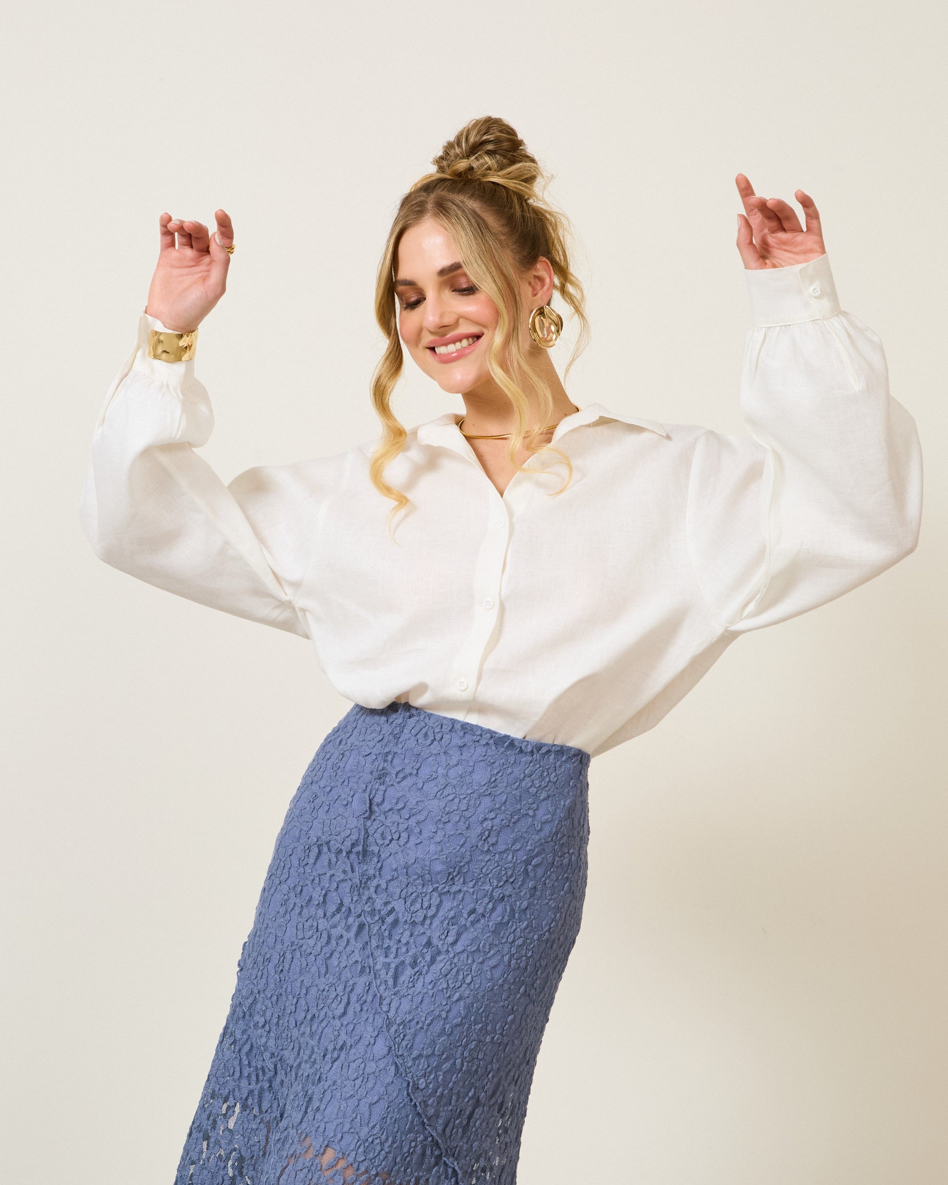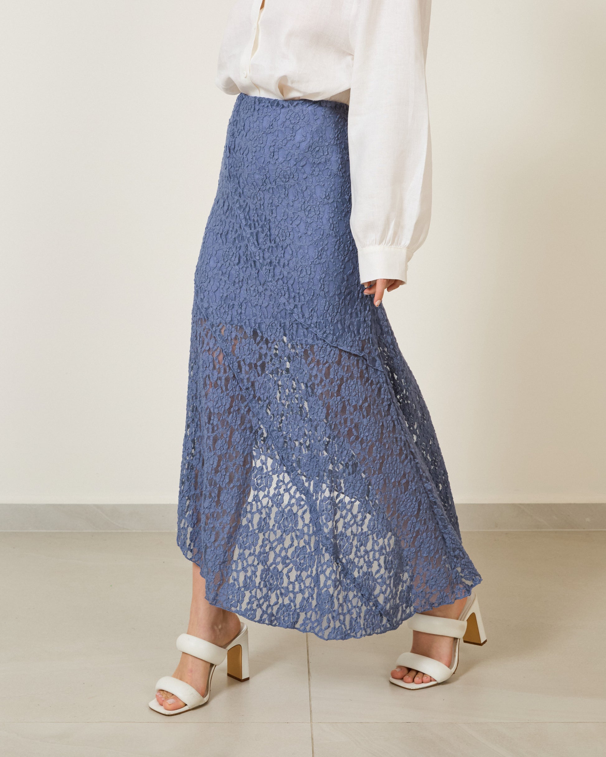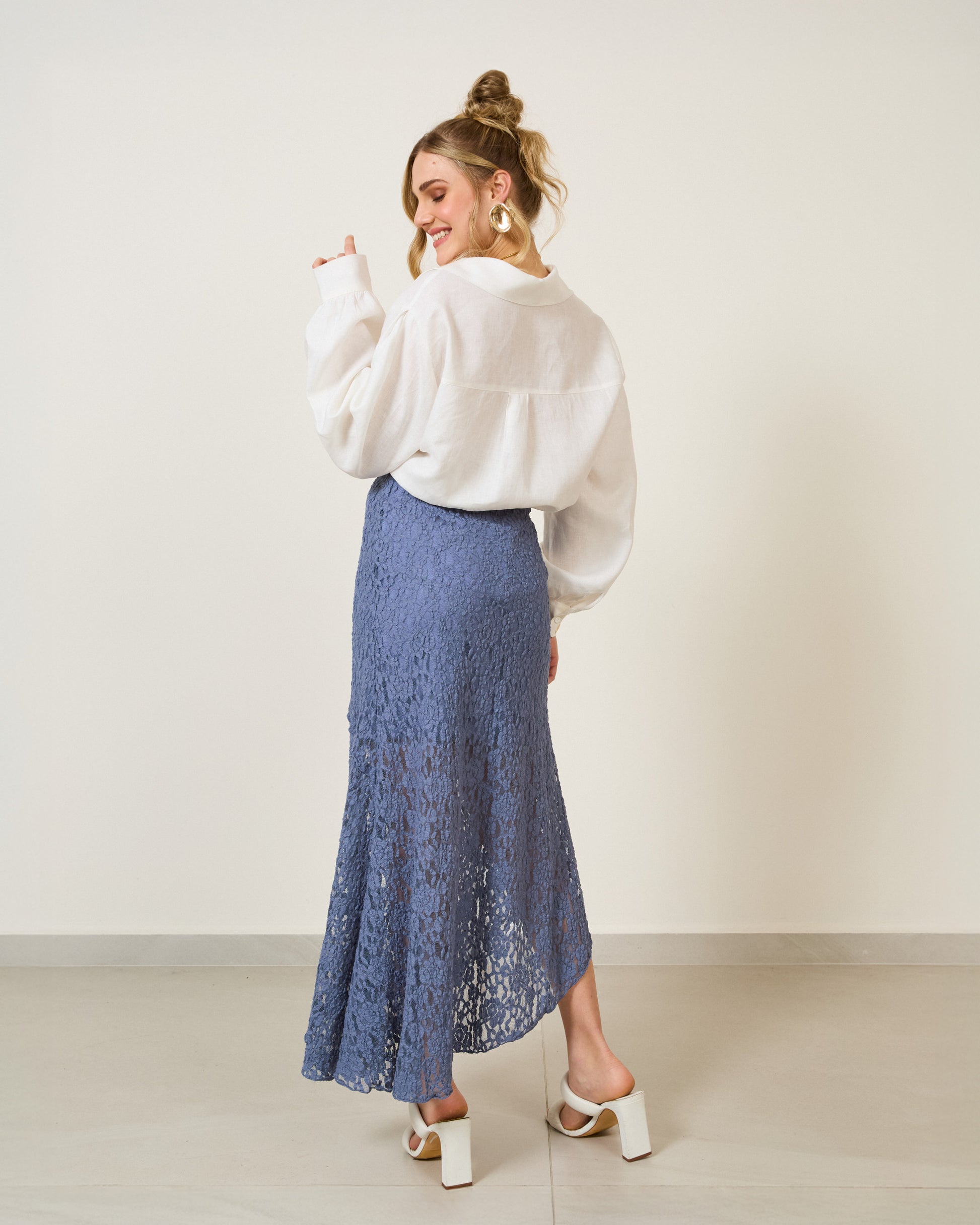 Saia midi em renda com forro interno, caimento diagonal que encurta e barra levemente ampla.