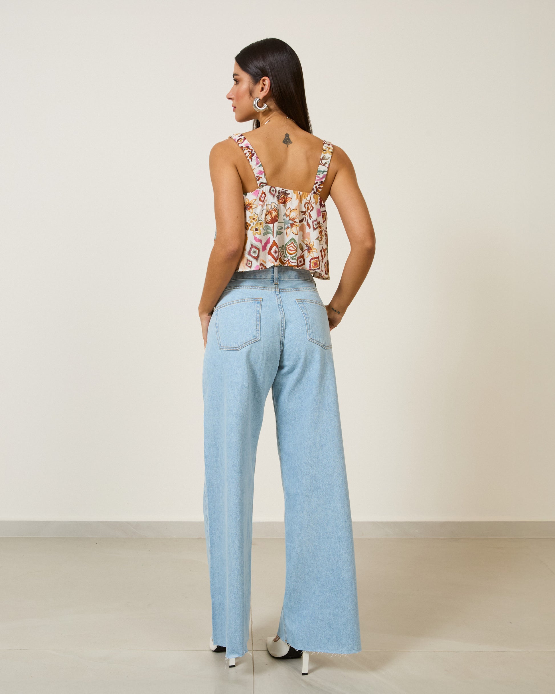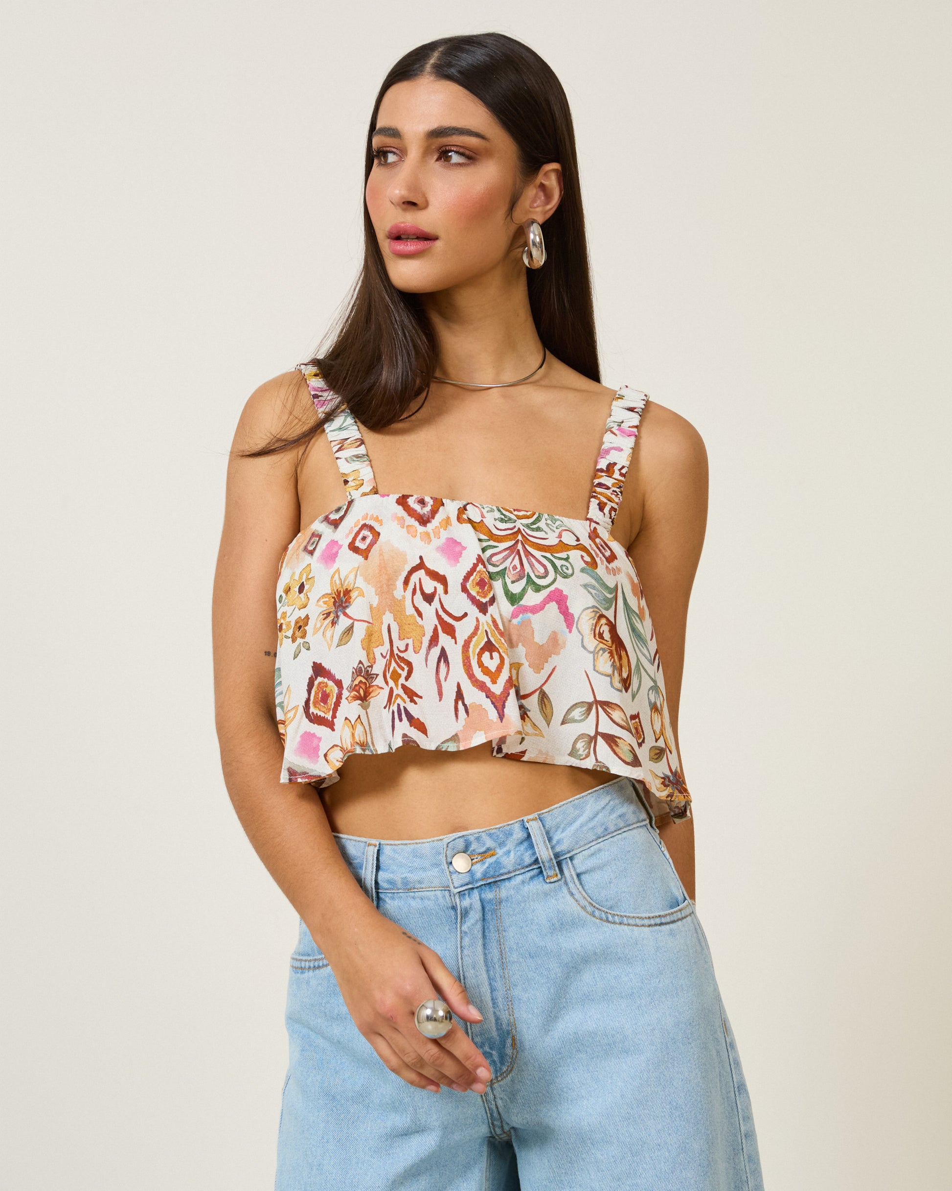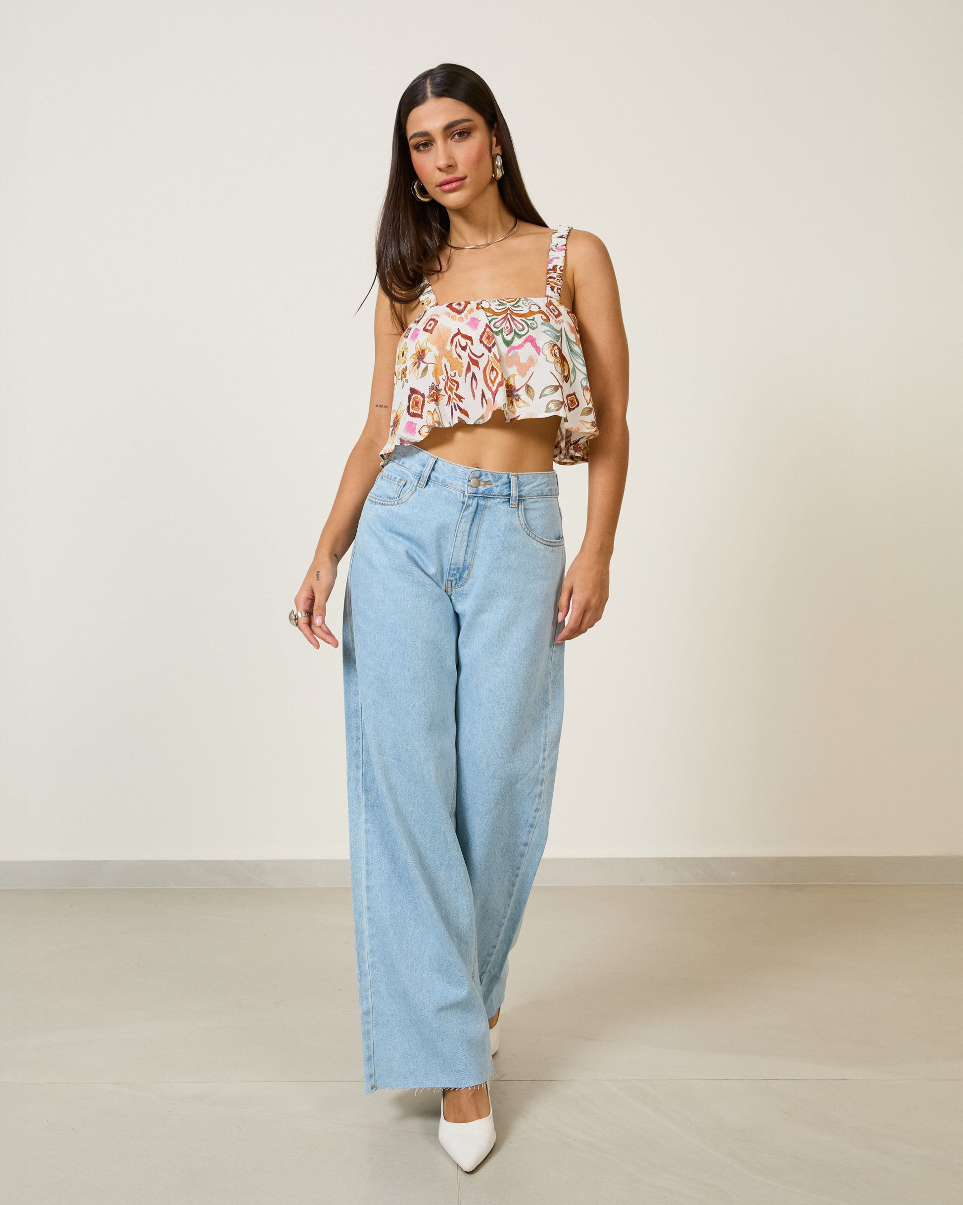 Top com babado evasê, alças largas franzidas com elástico e estampa em padronagem multicolorida. Versátil, pode ser usado em almoços casuais, encontros ao ar livre ou programações descontraídas que pedem conforto e estilo. Confeccionado em 100% viscose com forro em 100% poliéster.