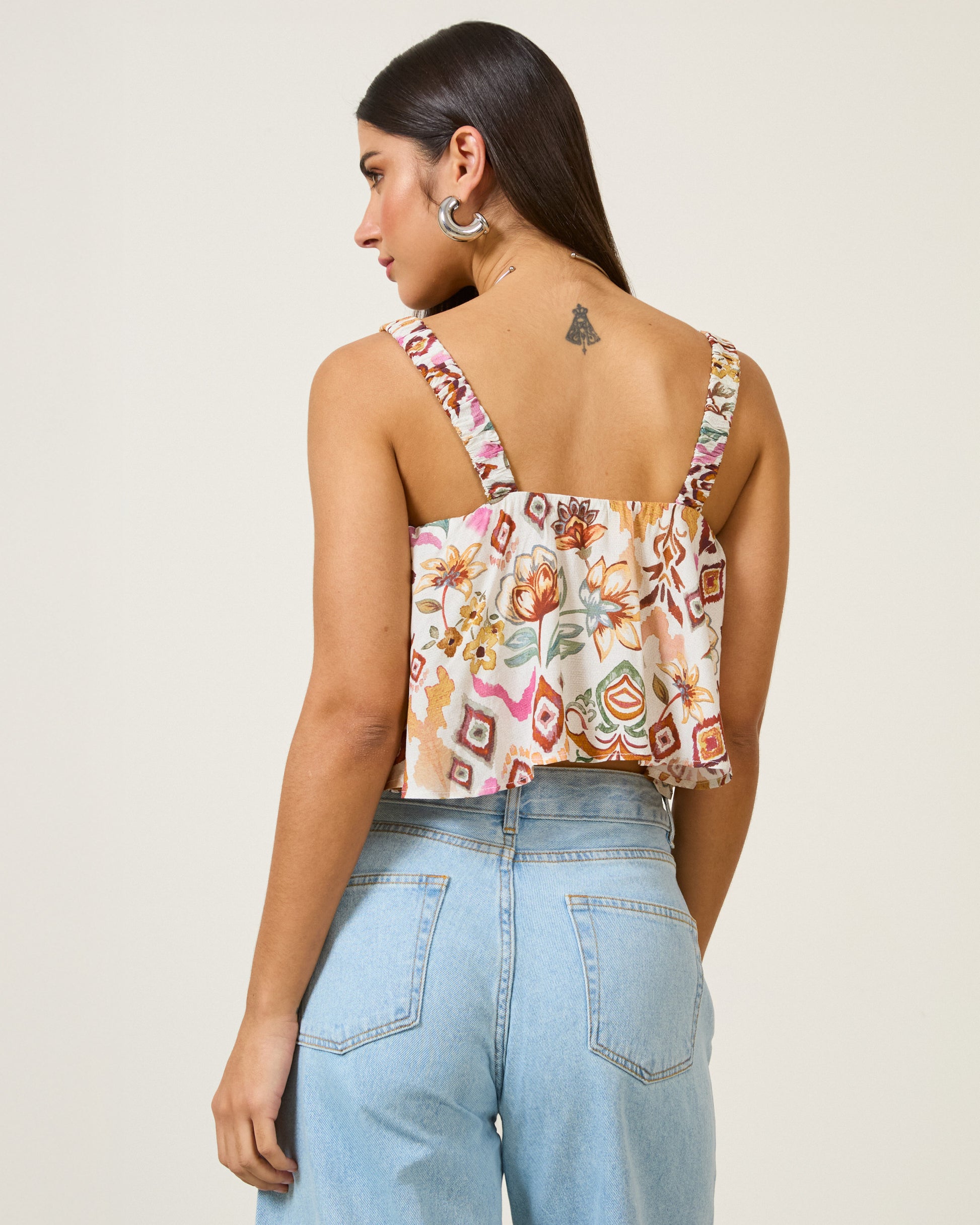 Top babado evasê, alças franzidas com elástico e estampa multicolorida. Confeccionado em 100% viscose com forro em 100% poliéster.