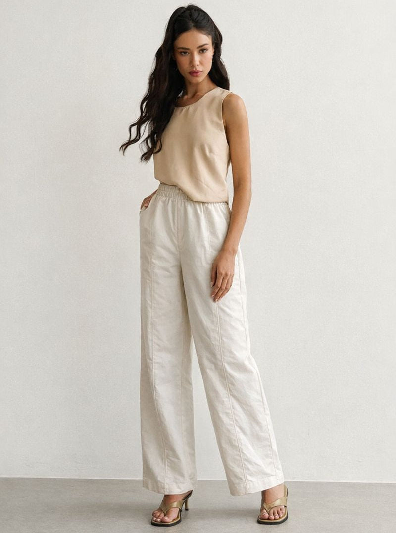 Calça reta com cós elástico e bolsos laterais, feita em tecido leve e confortável, perfeita para compor looks elegantes e práticos.