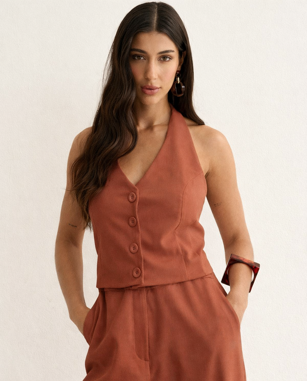 Colete confeccionado em tecido de viscose, poliamida e elastano, com forro interno para melhor acabamento e estrutura. O modelo apresenta decote em V, fechamento frontal por botões e barra levemente alongada. Possui recortes que valorizam a silhueta e detalhe de lastex posterior, que garante conforto e ajuste perfeito ao corpo. Ideal para composições sofisticadas em ocasiões casuais ou ambientes de trabalho.