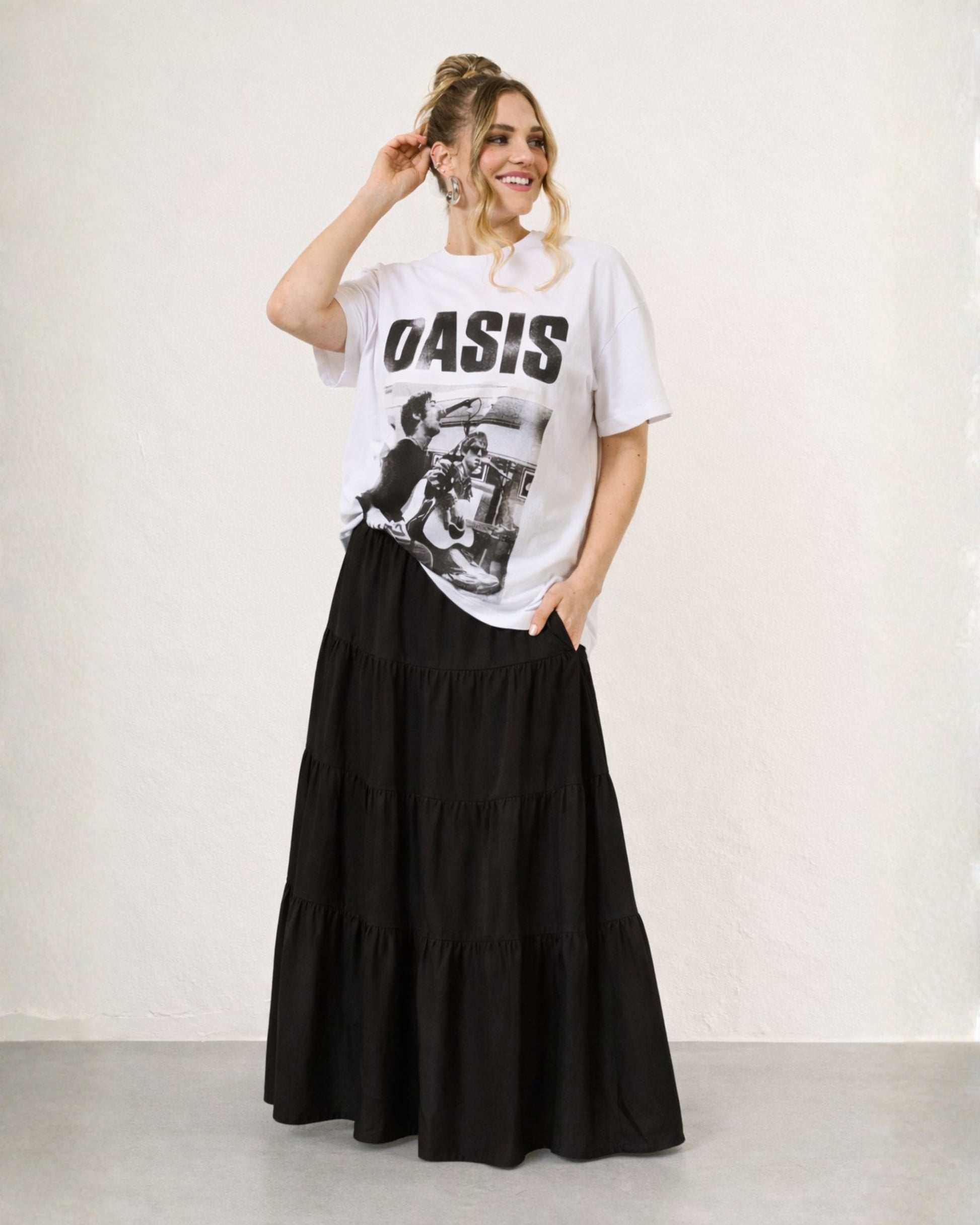 Saia longa em camadas com cós de elástico e caimento fluido. Modelagem confortável com movimento suave e acabamento delicado.