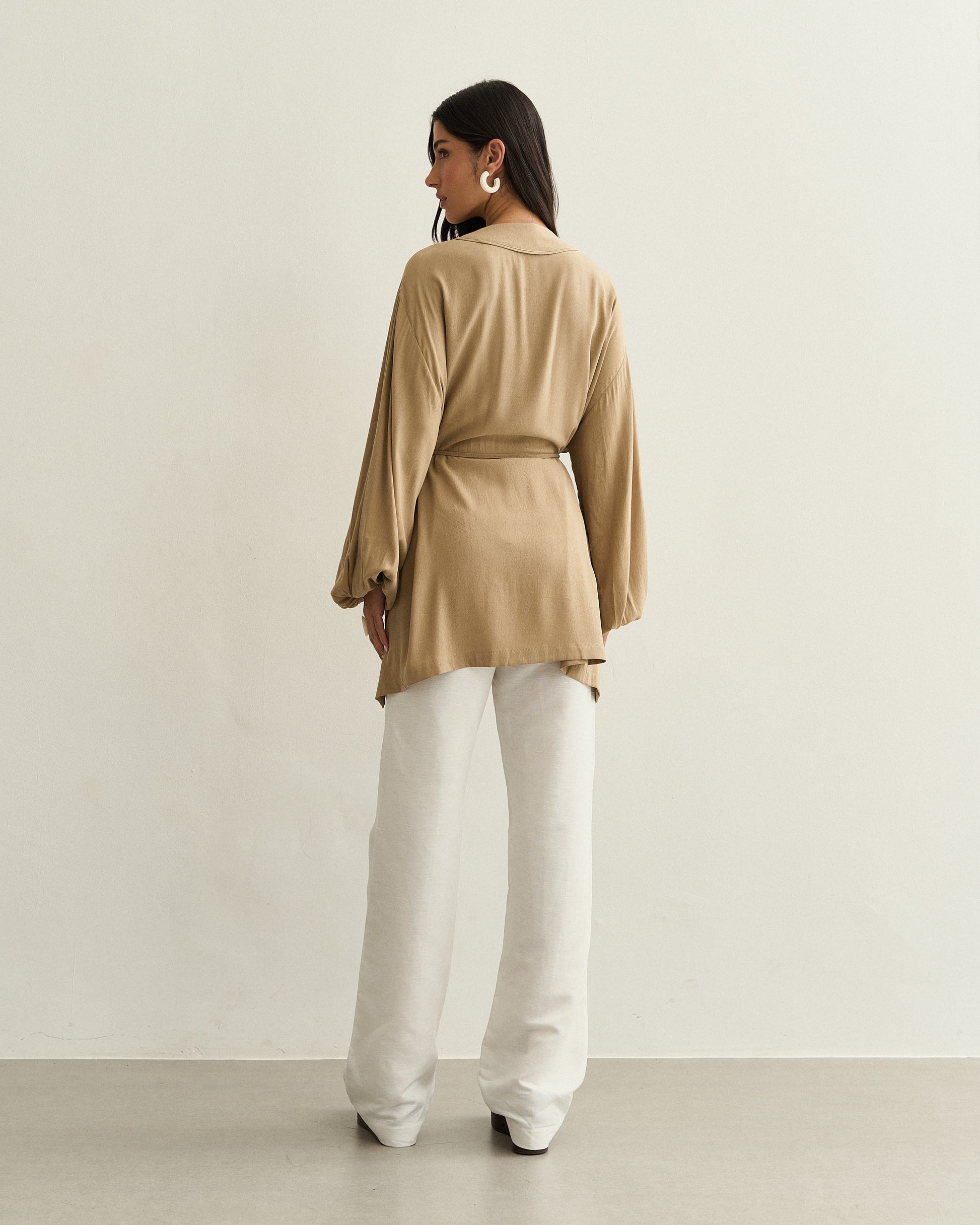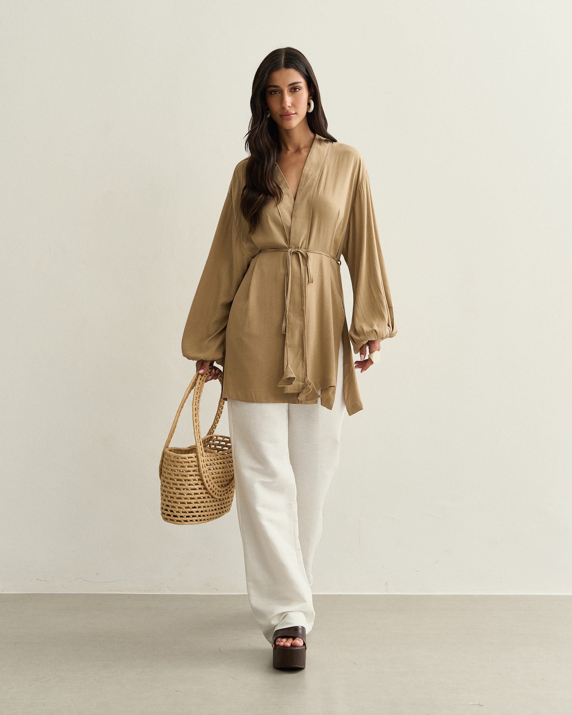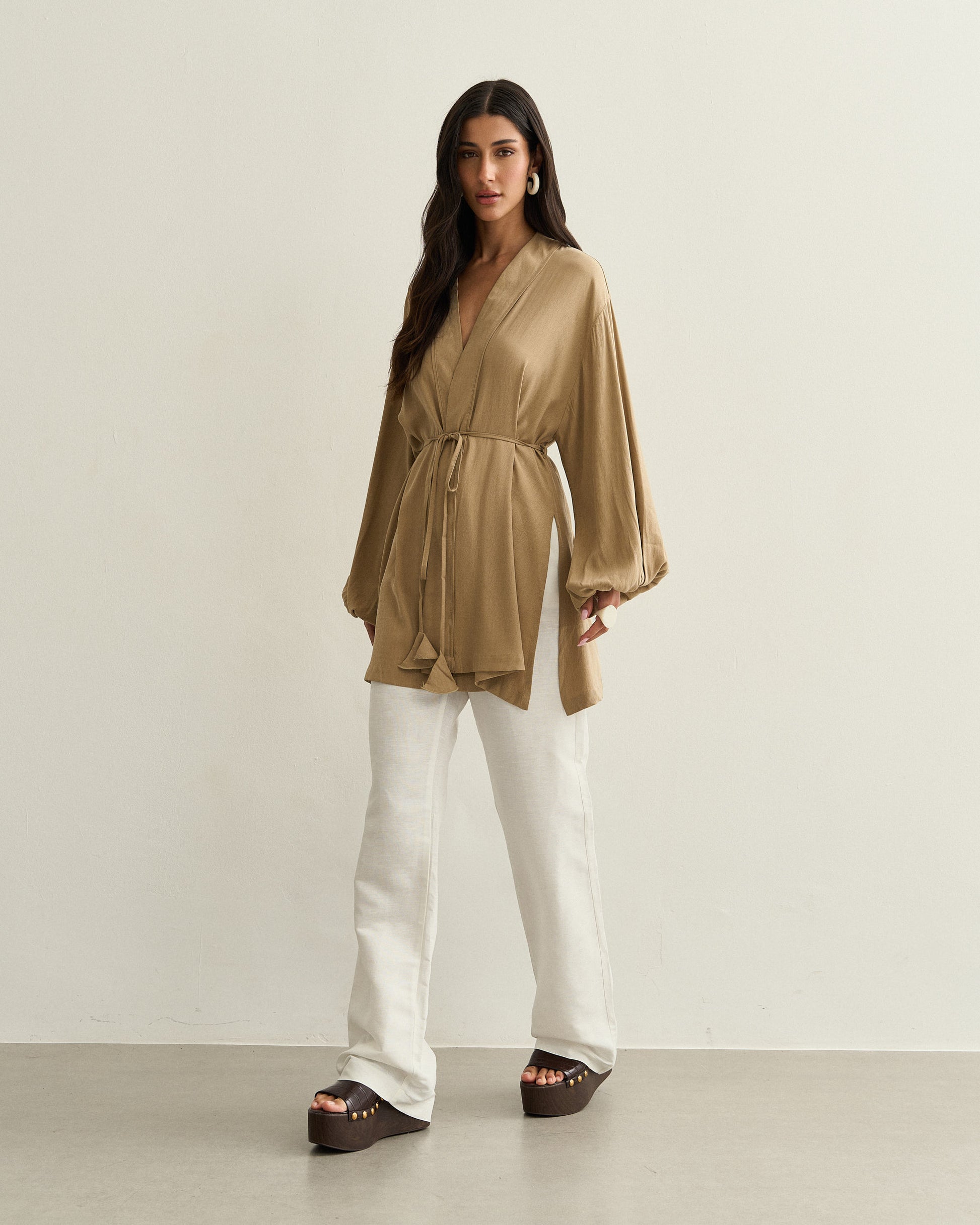 Kimono alongado confeccionado em tecido leve de toque macio. Possui decote em V e mangas amplas com punhos ajustados, que criam volume e movimento. O modelo conta com faixa fina para amarração na cintura, permitindo ajustar o caimento de forma delicada. As fendas laterais proporcionam fluidez e conforto, enquanto o design minimalista garante um visual sofisticado e versátil.
