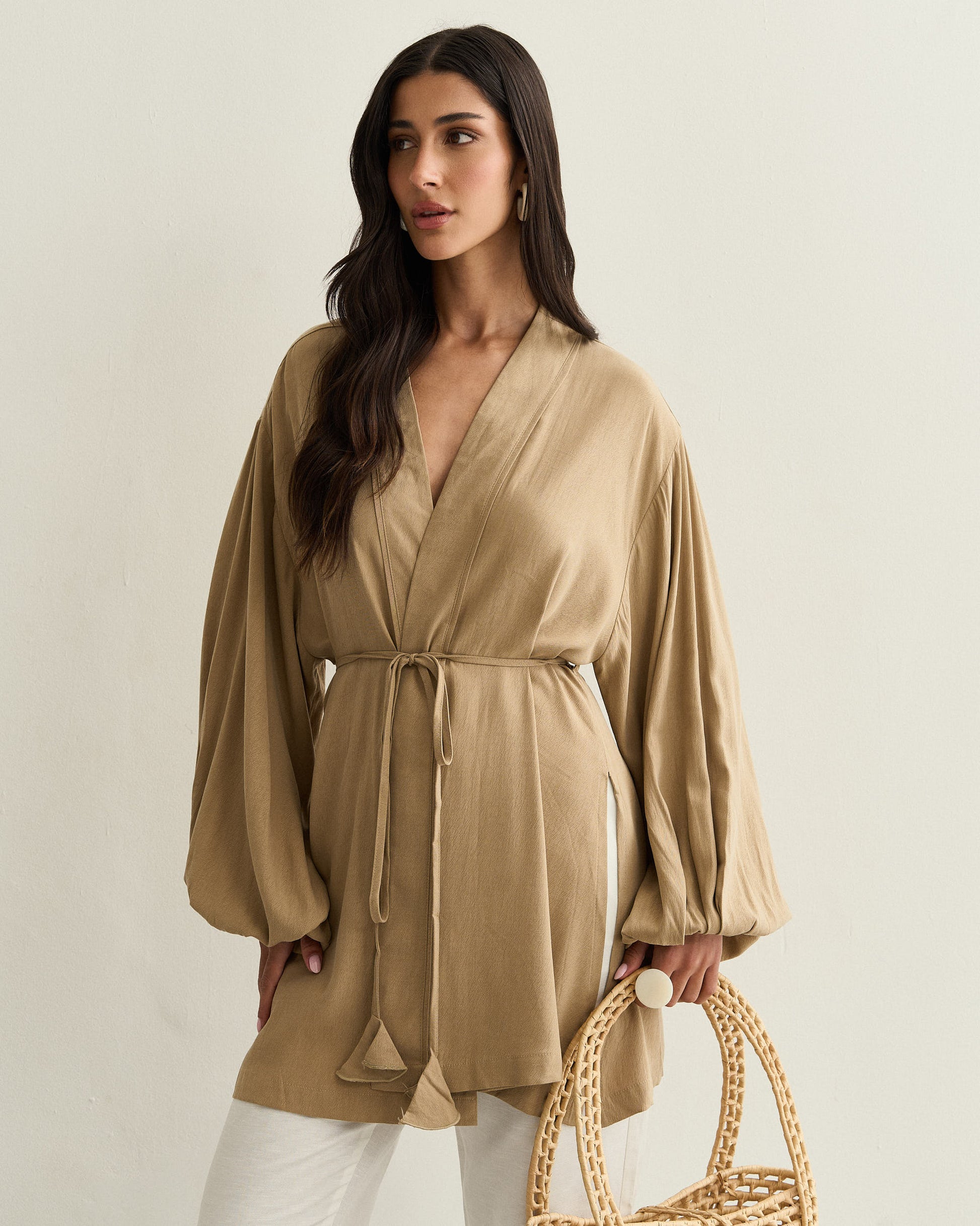 Kimono alongado com mangas amplas, fendas laterais e amarração ajustável na cintura.