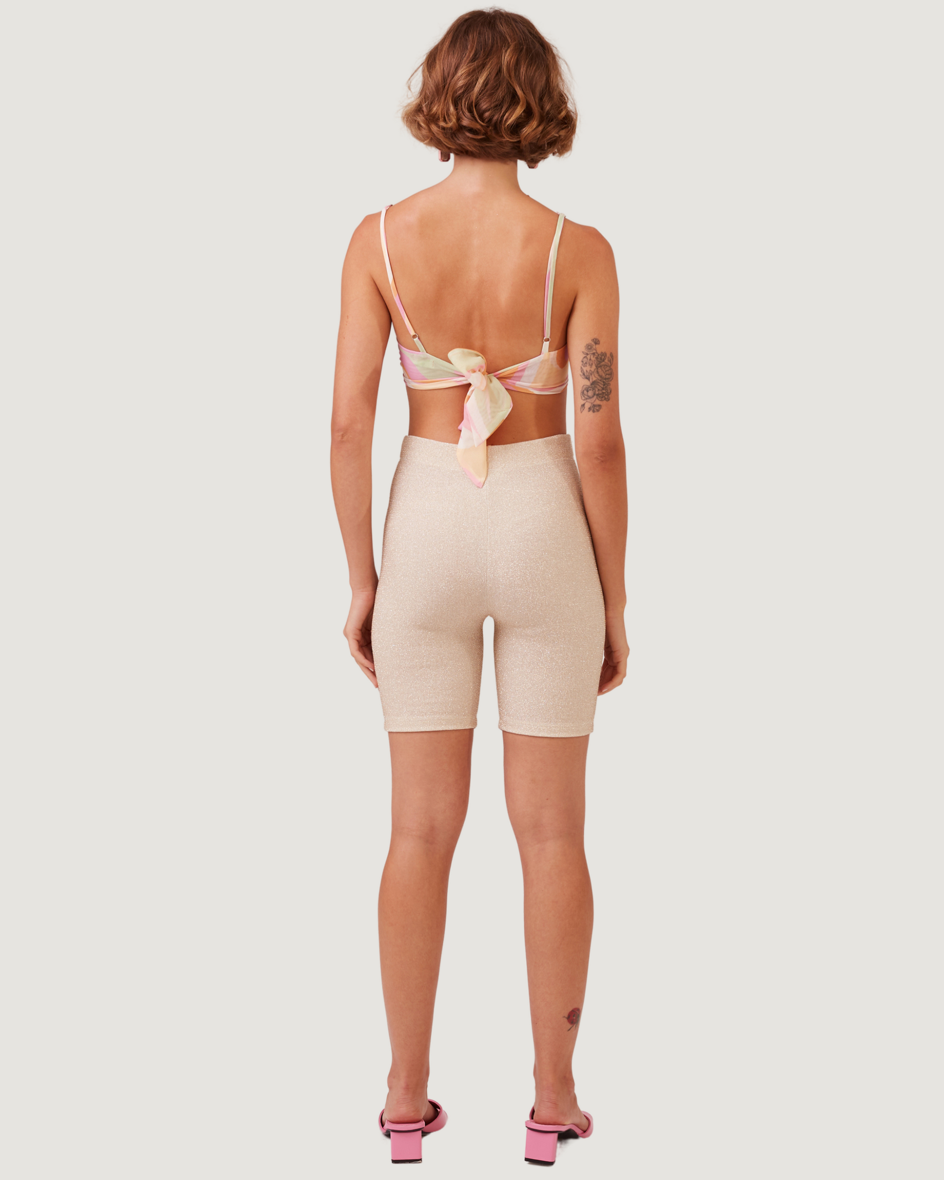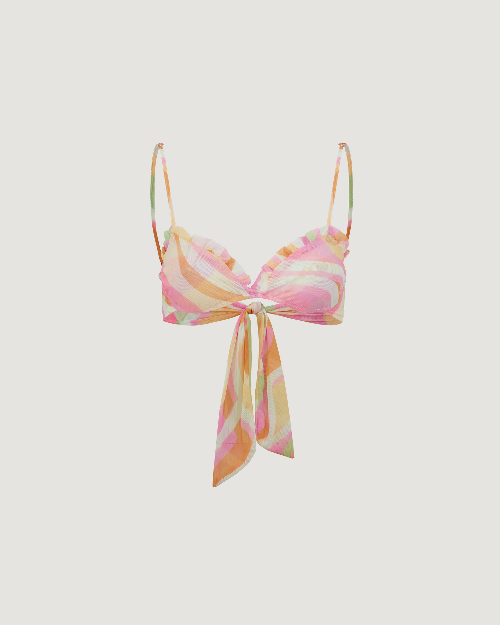Top de de estampa psicodélica, de tule (um tecido texturizado e com transparência), de tecido duplo (duas vezes do mesmo tecido), sem forro, com babadinhos, alça fina com regulagem, e amarração nas costas.