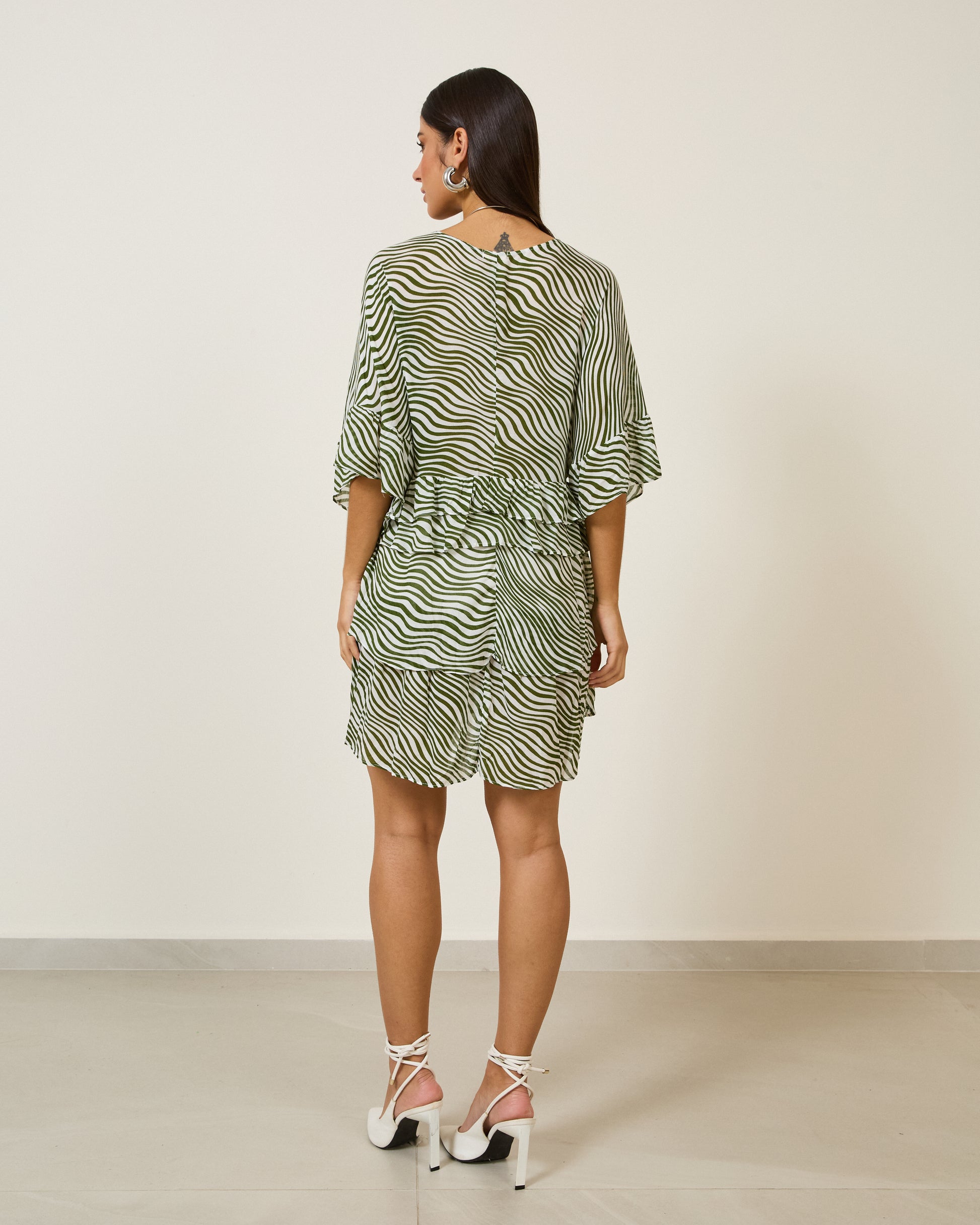 Vestido confeccionado em viscose com forro interno em poliéster. O modelo curto apresenta decote V transpassado, mangas 3/4 amplas e cintura levemente marcada por elástico embutido. A saia tem camadas com babados que garantem movimento e caimento fluido. O acabamento simples valoriza a estampa em tons de off-white e verde.