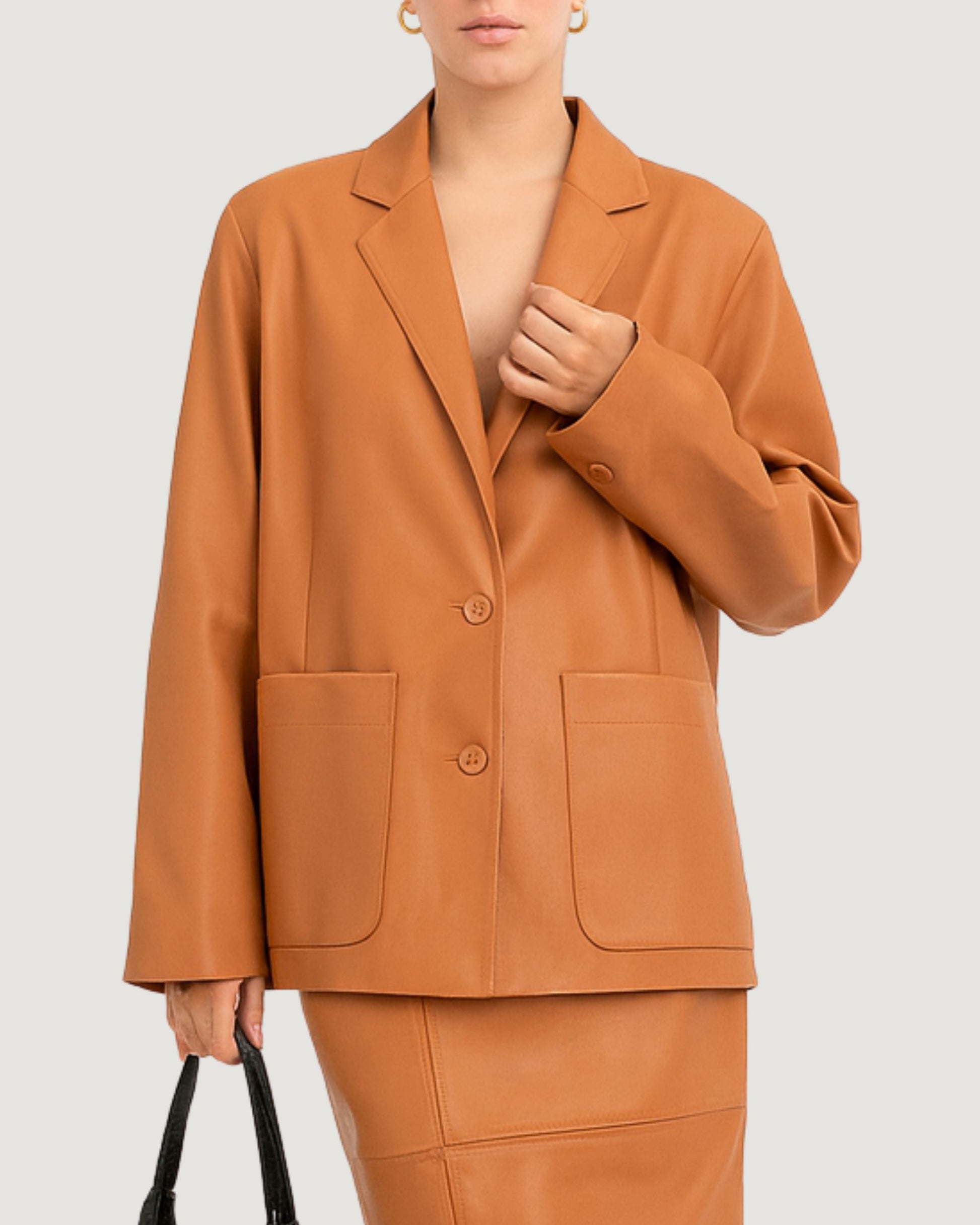 Blazer confeccionado em viscose com revestimento em poliuretano e forro interno. Possui gola de lapela clássica, fechamento frontal por botões e bolsos aplicados de formato quadrado. As mangas longas seguem modelagem reta, com acabamento limpo. Indicado para ocasiões sociais e produções noturnas.