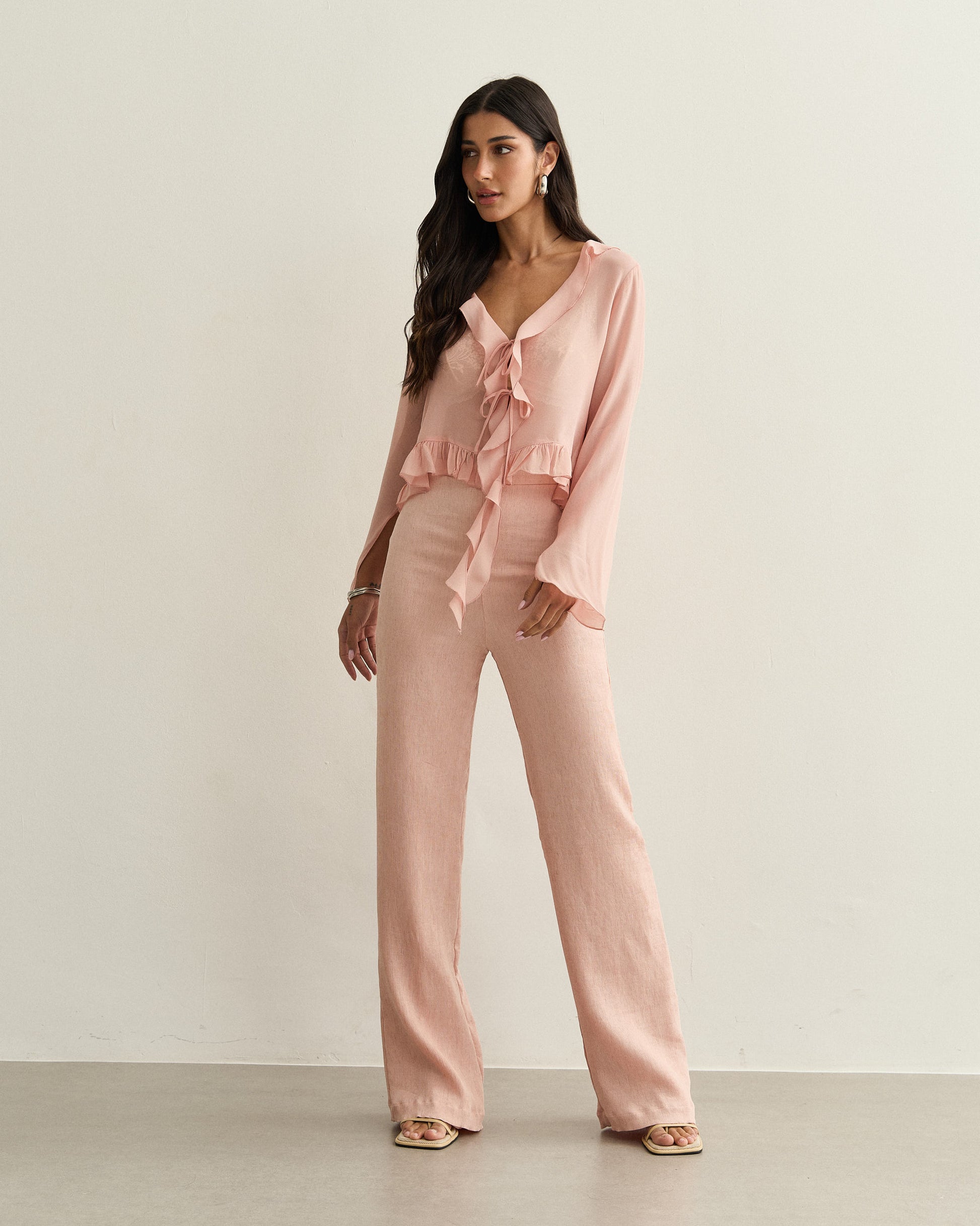 Blusa confeccionada em tecido leve de toque suave, com decote em V profundo e amarração frontal. O modelo possui recorte ajustado na cintura e acabamento em babados sutis no decote e na barra, além de mangas longas com abertura fluida. O caimento solto garante leveza e movimento, ideal para ocasiões casuais com um toque sofisticado, como almoços e jantares.