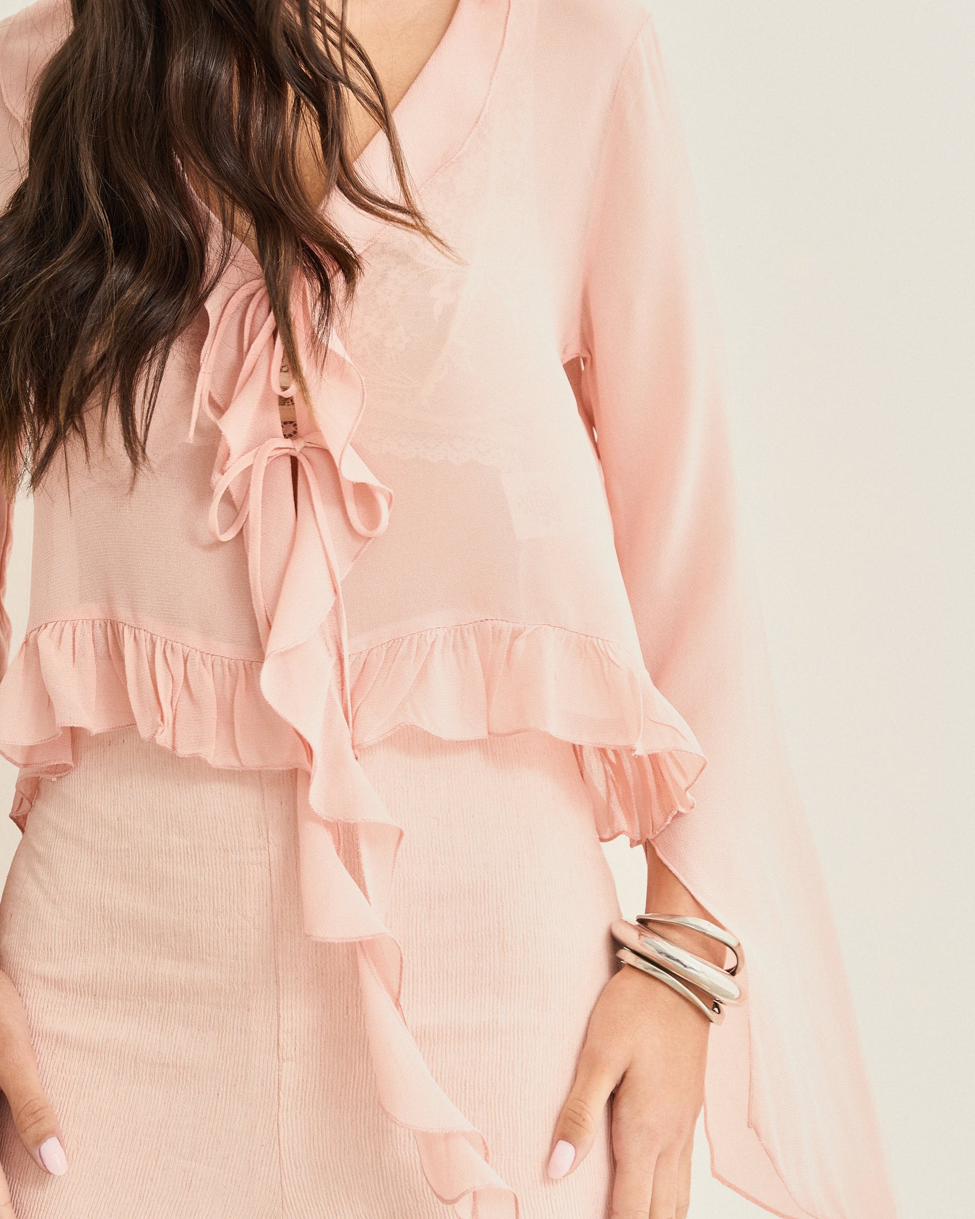 Blusa leve com amarração frontal, babados sutis e mangas fluídas. Toque suave e caimento delicado.