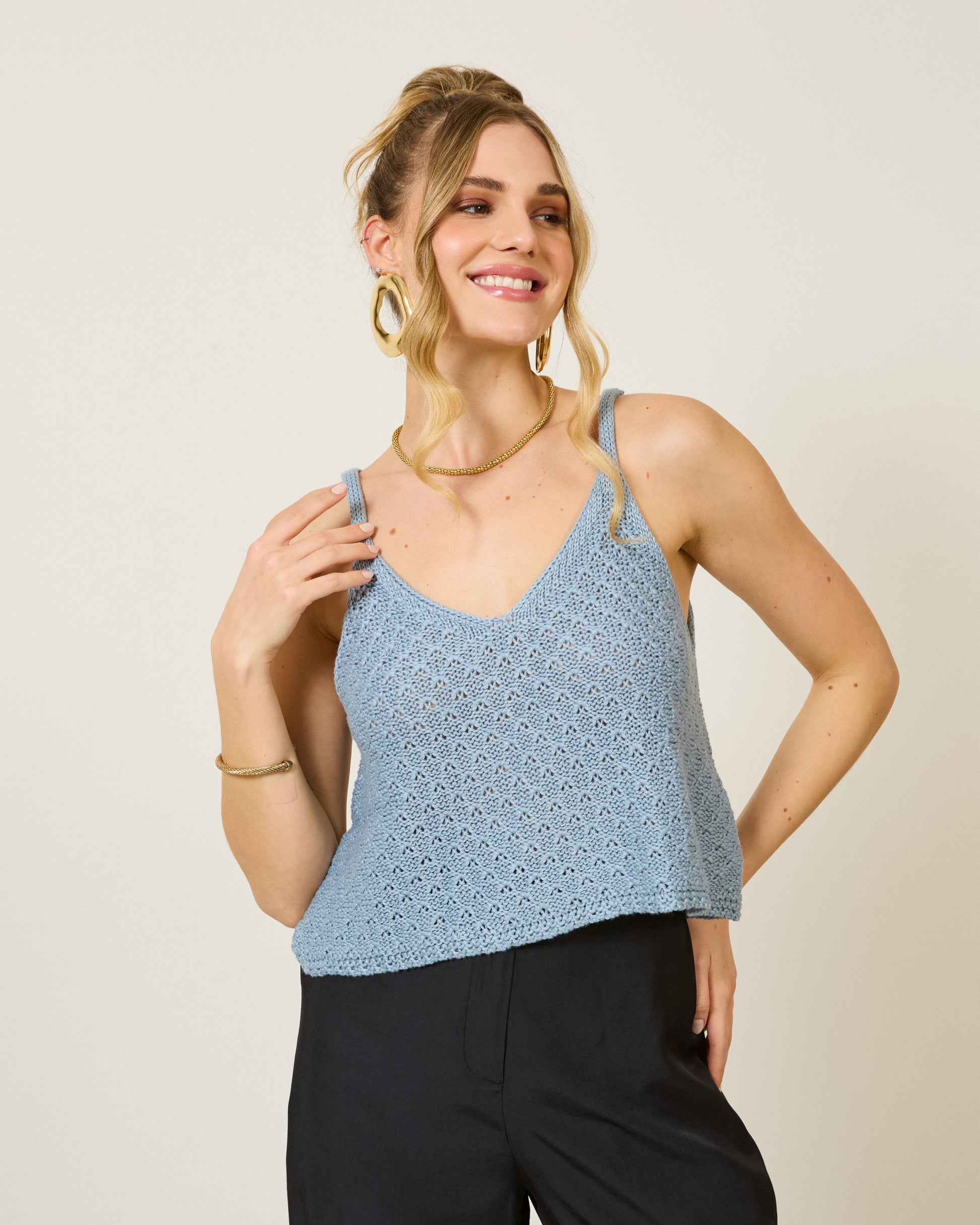 Regata em tricot de acrílico com decote V e alças finas, caimento leve e textura trabalhada.