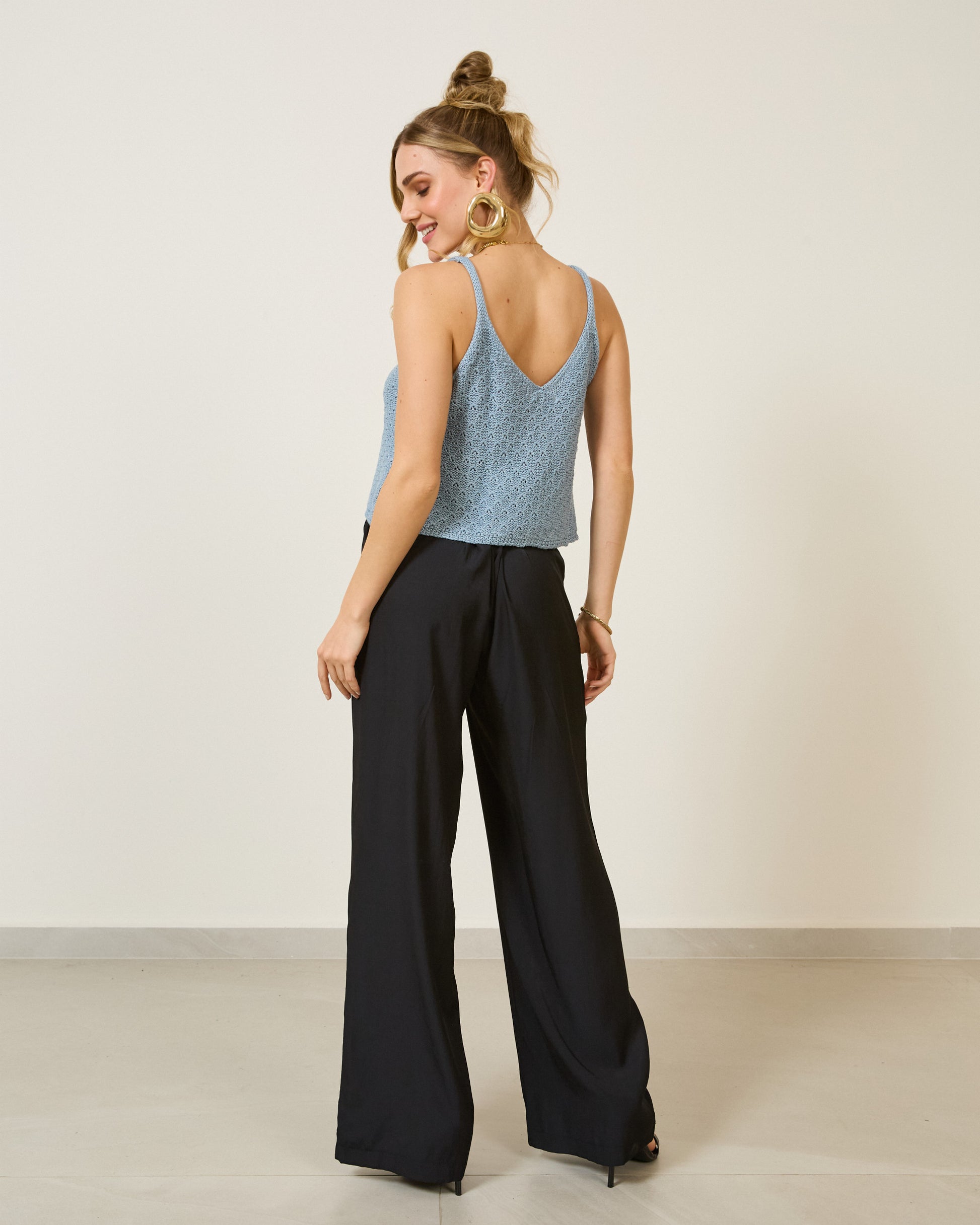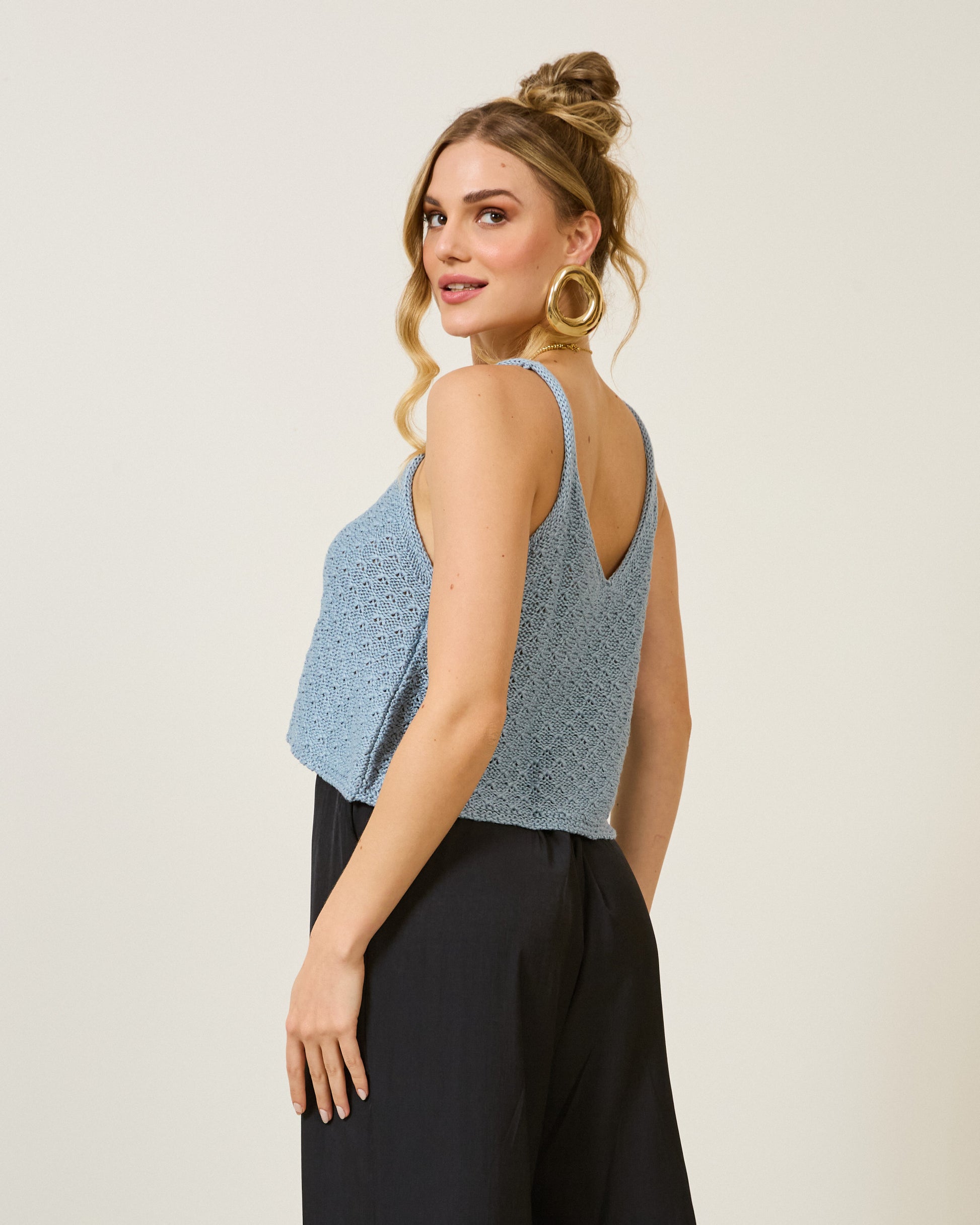 Regata confeccionada em tricot de acrílico, com alças finas e decote em V. O caimento leve valoriza a textura do ponto aberto, trazendo acabamento delicado e confortável. Versátil, pode ser usada tanto em produções casuais quanto em ocasiões descontraídas ao ar livre.
