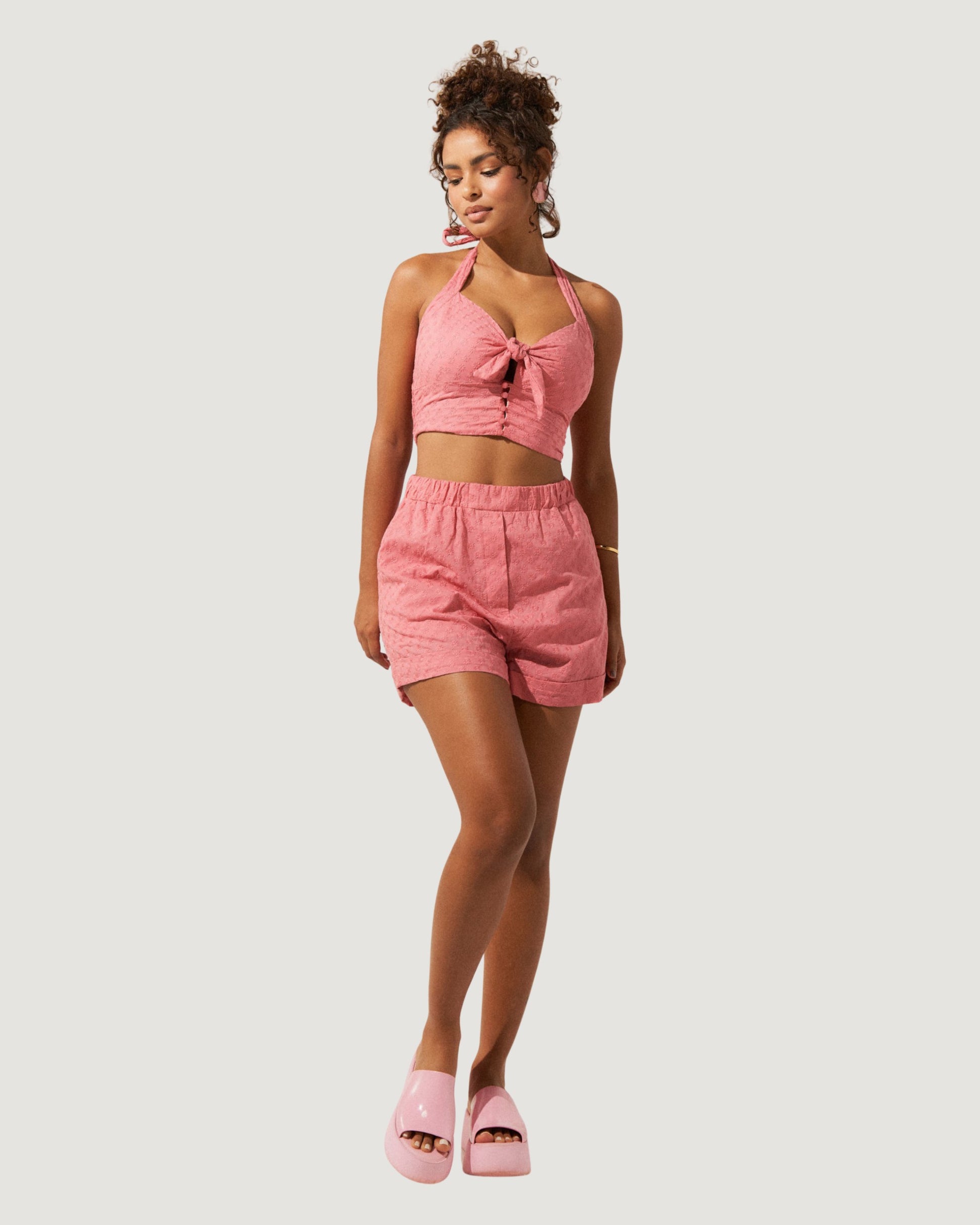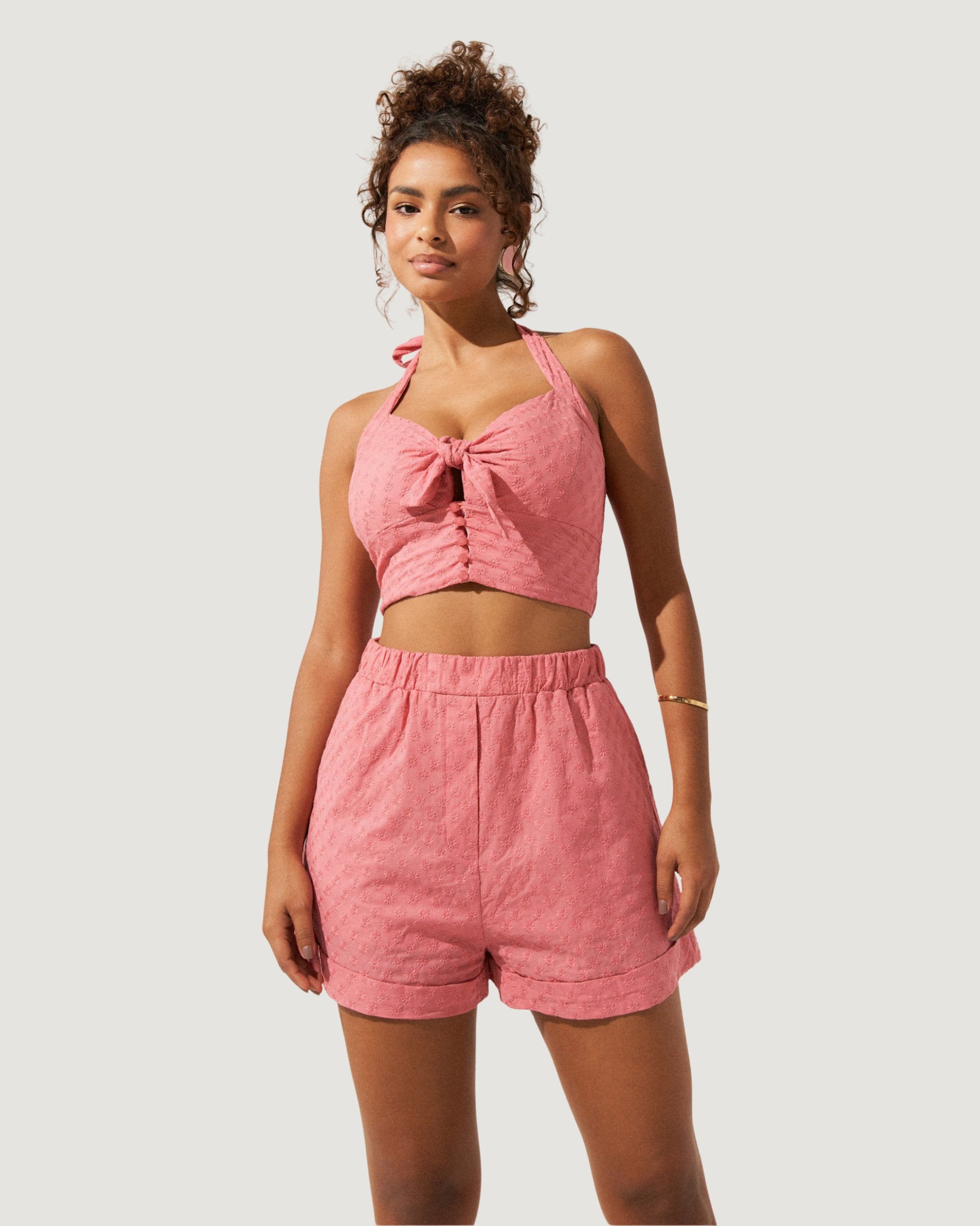 Top de algodão com bordado floral, decote em V e amarração frontal e posterior. Lastex nas costas para ajuste confortável.